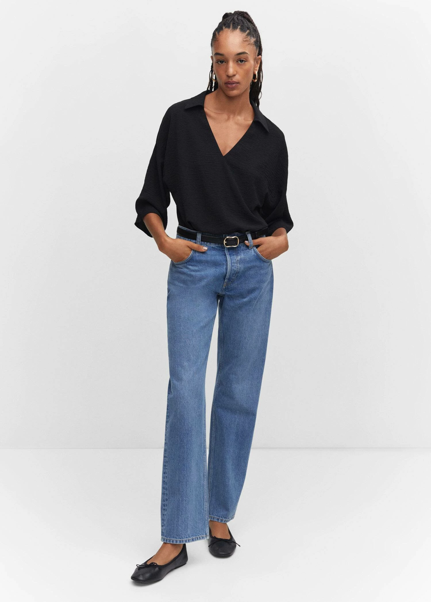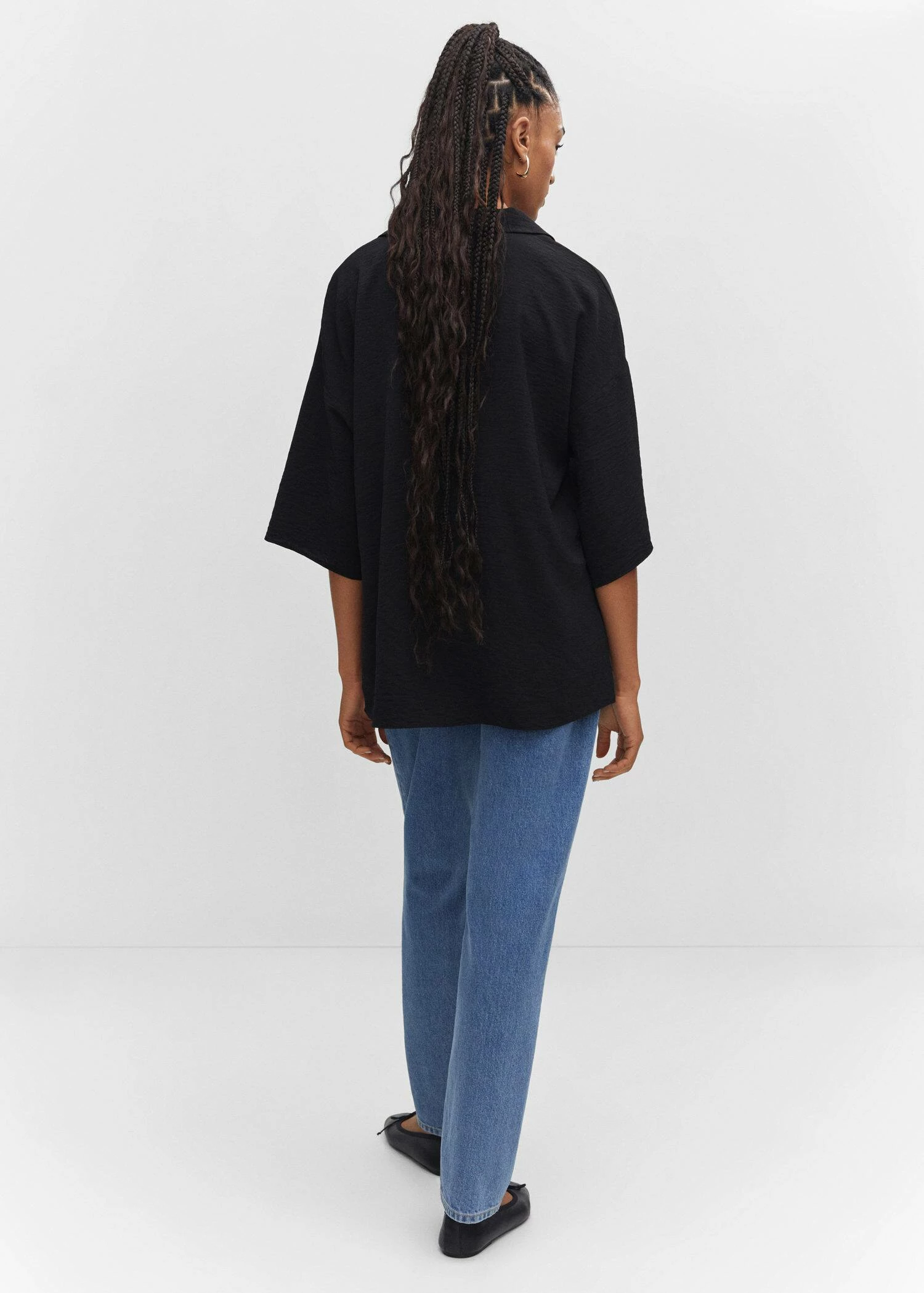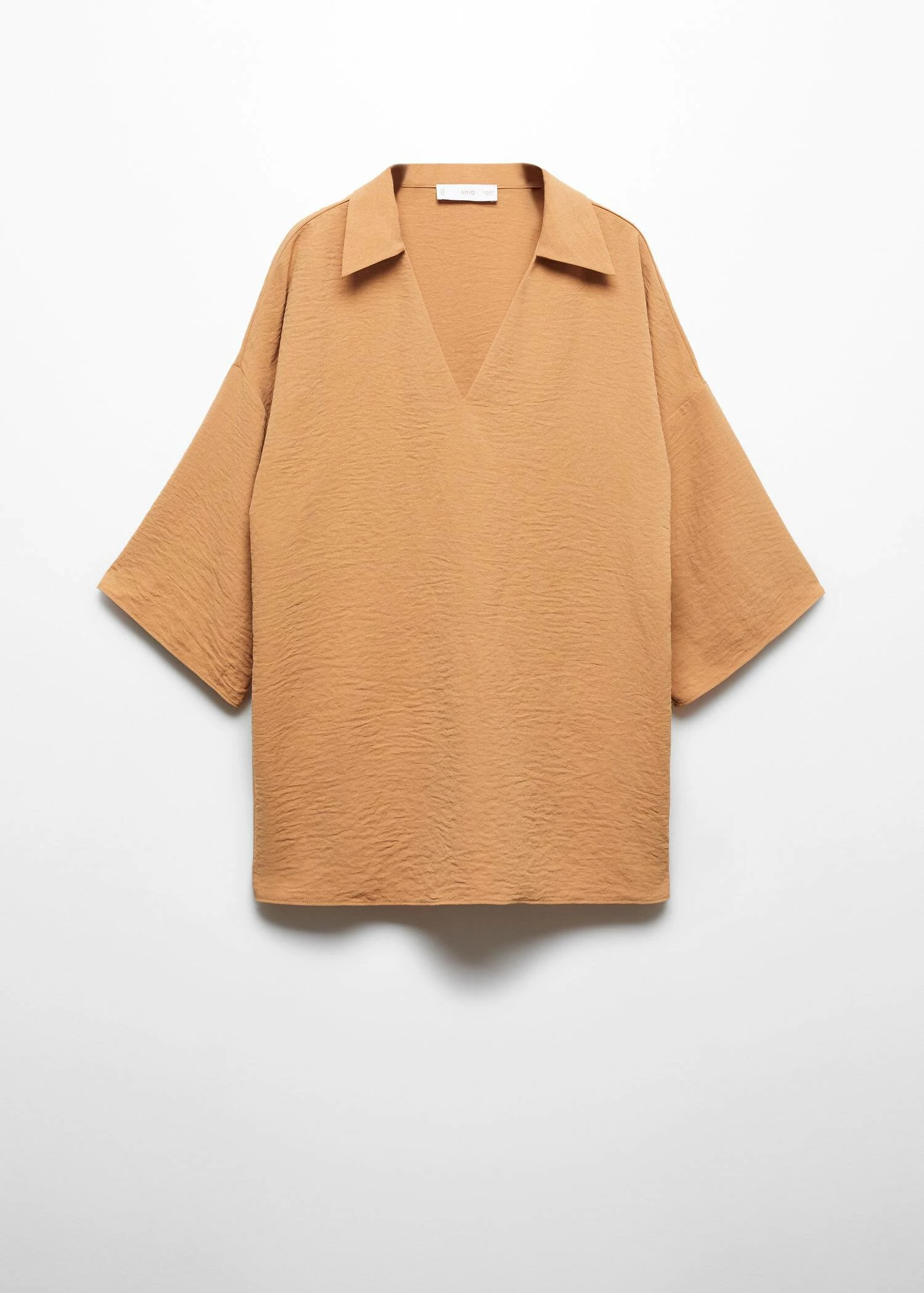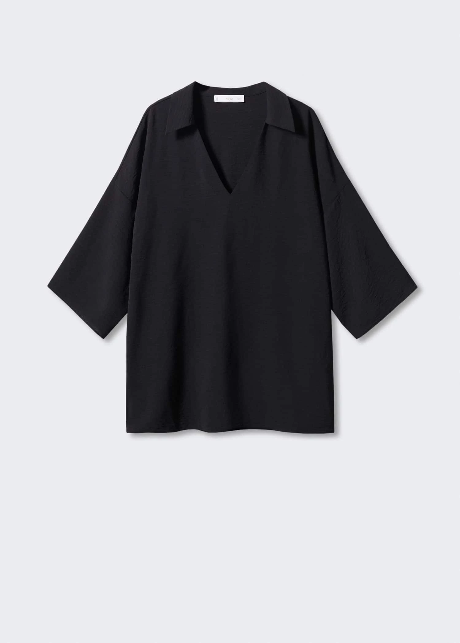 droit, coupe longue, col chemise, col en v, manches cloche trois quarts, total lookComposition: 60% polyester,40% polyester recyclé