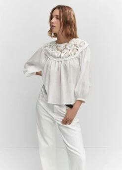 tissu 100 % coton, tissu texture, detail en crochet, coupe droite, col rond, manches longues bouffantes, col boutonneComposition: 100% coton. Empiècement: 100% coton