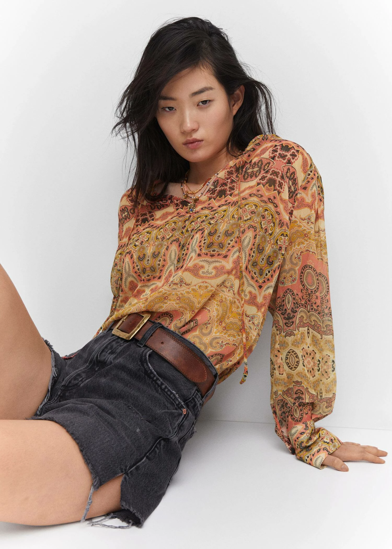 tissu fluide, droit, imprime, col rond, lien a nouer autour du cou, col en v, manches longues bouffantes, manches longues avec poignets boutonnes, style bohoComposition: 100% polyester