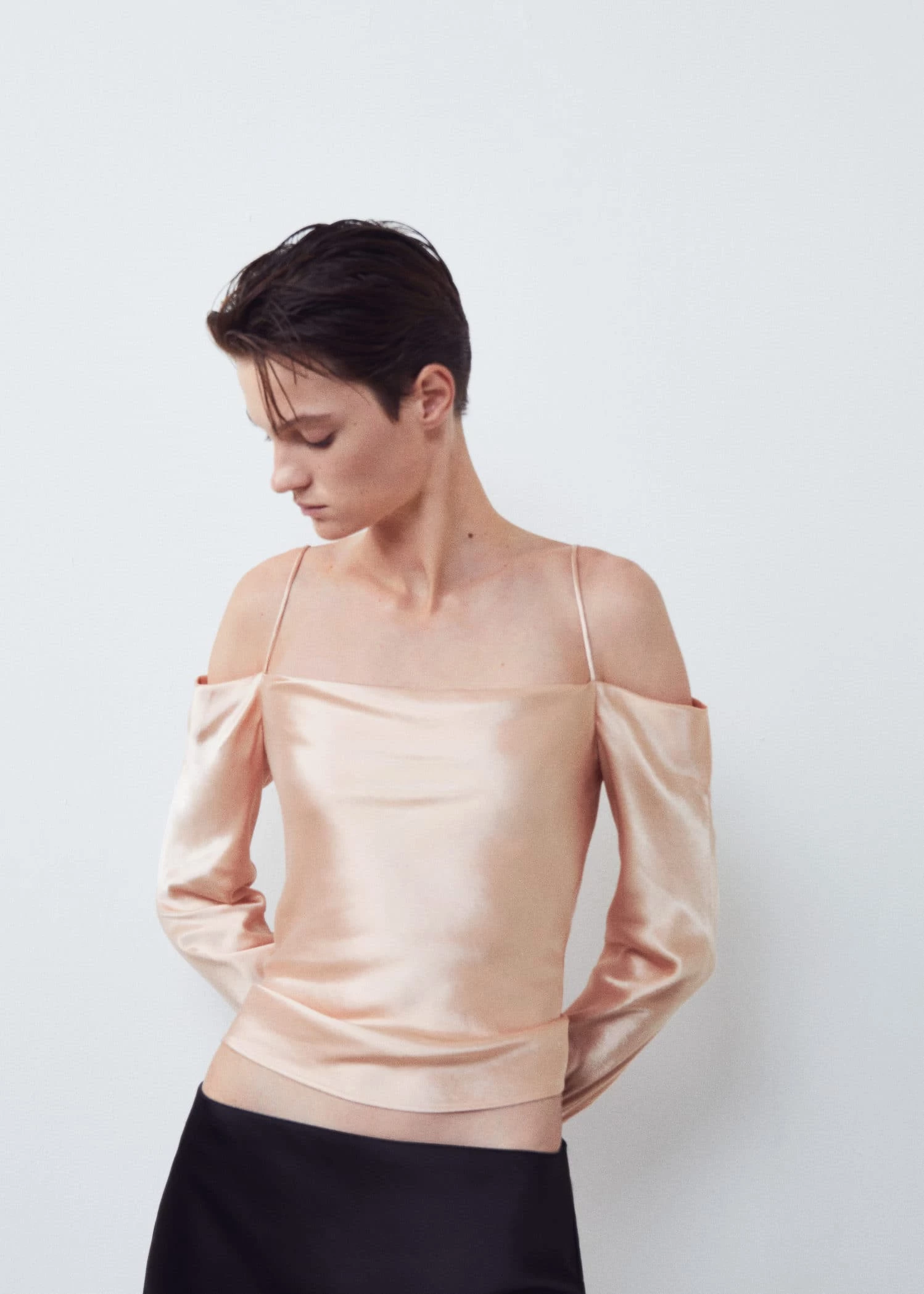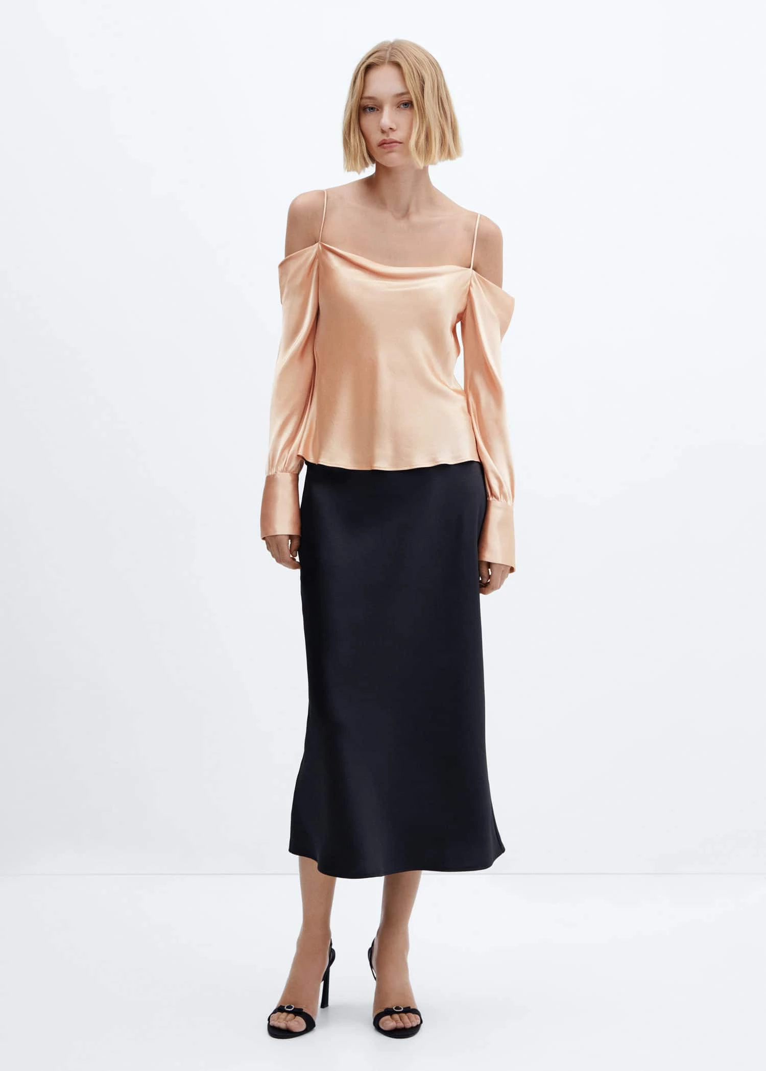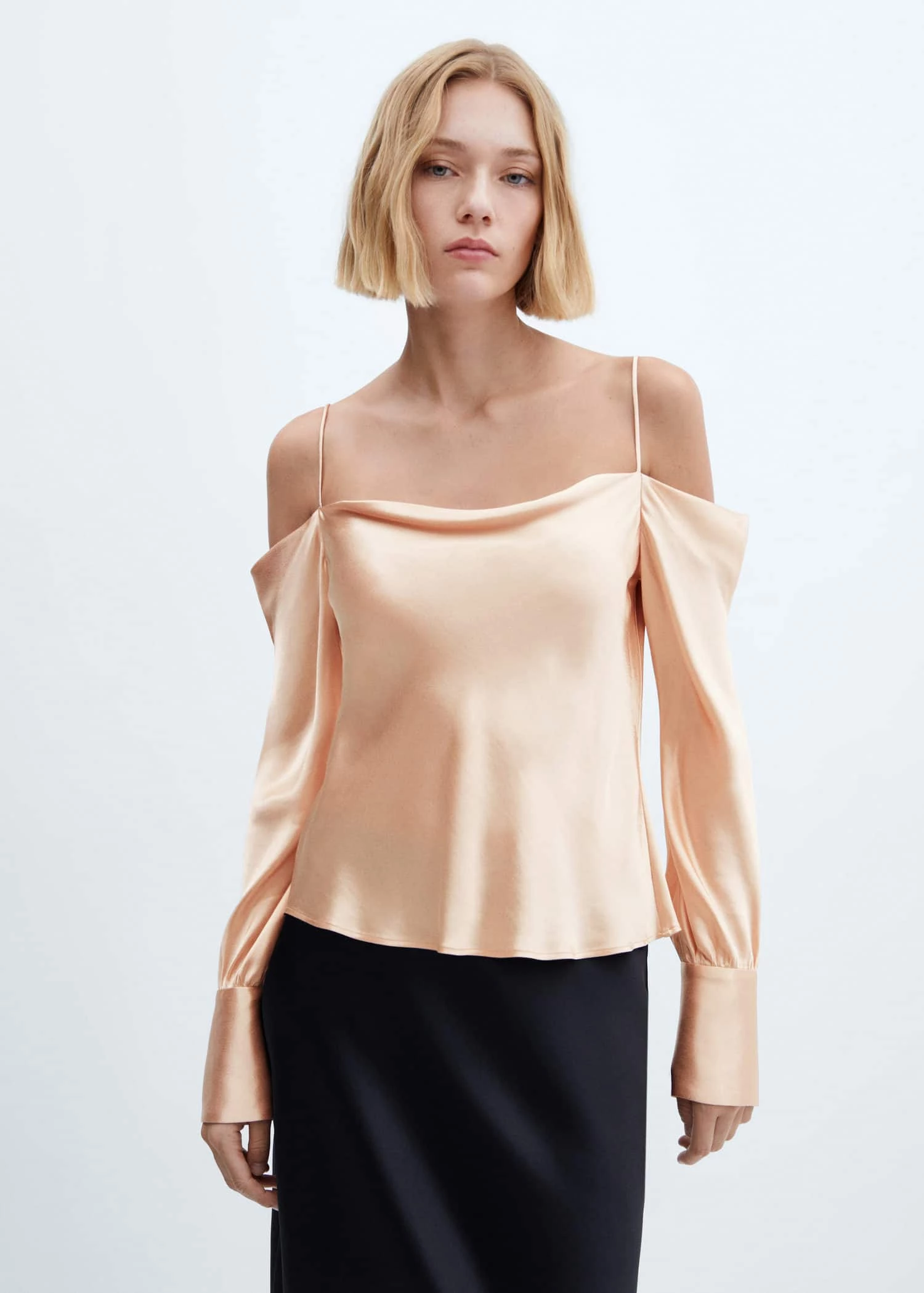 tissu satine, tissu fluide, droit, col drape, manches longues boutonnees, bretelles fines, sans fermeture, collection fetes et ceremoniesComposition: 100% viscose. Lisiere: 100% viscose