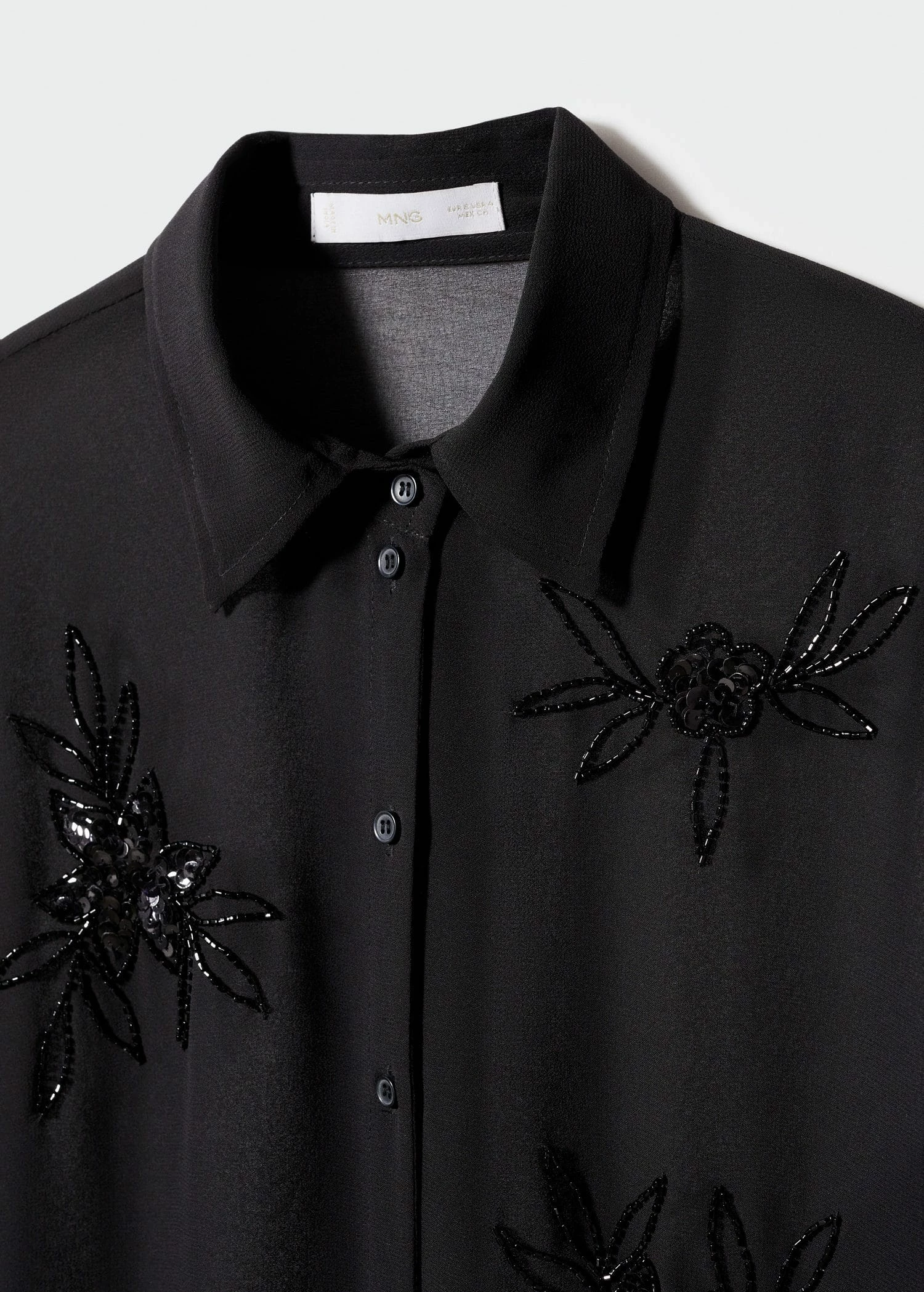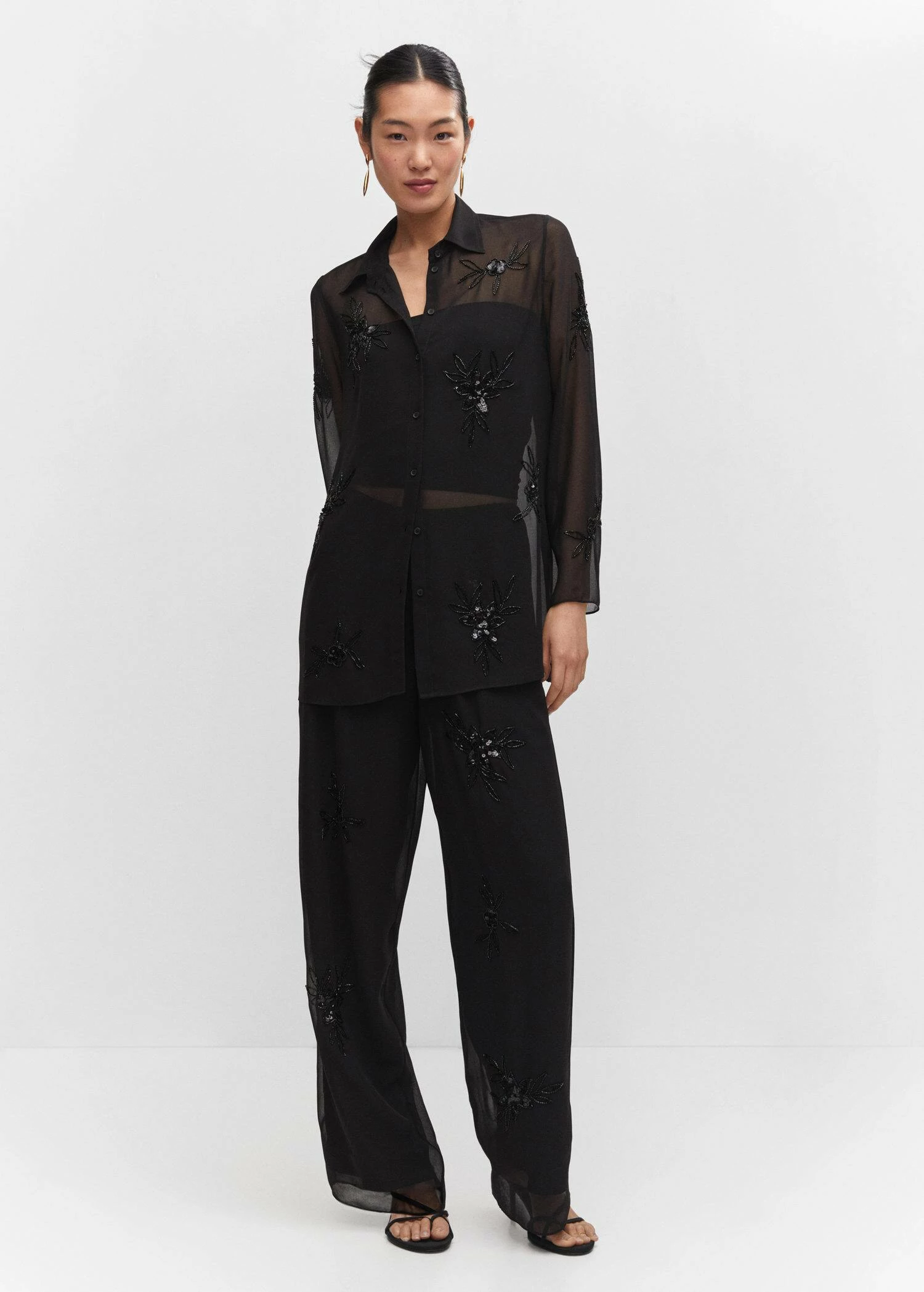 tissu fluide, style oversize, coupe longue, col chemise, manches longues, fermeture boutonnee sur le devant, detail perle, total look, collection fetes et ceremoniesComposition: 50% polyester,50% polyester recyclé. Ornement: 100% verre. Sequin: 100% polyester