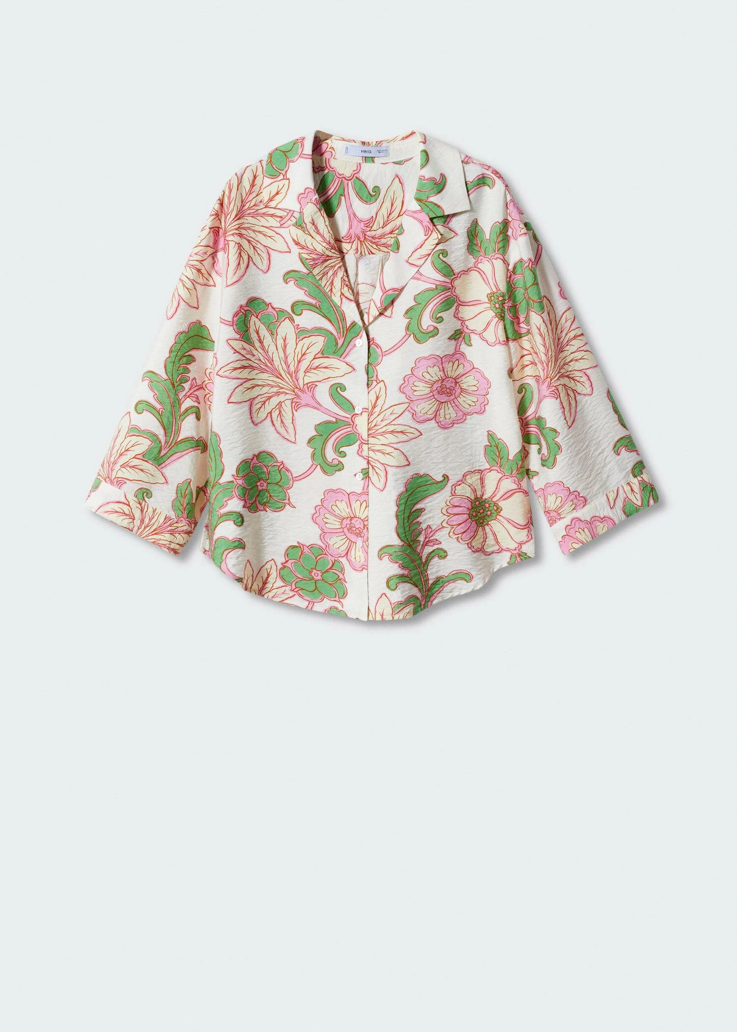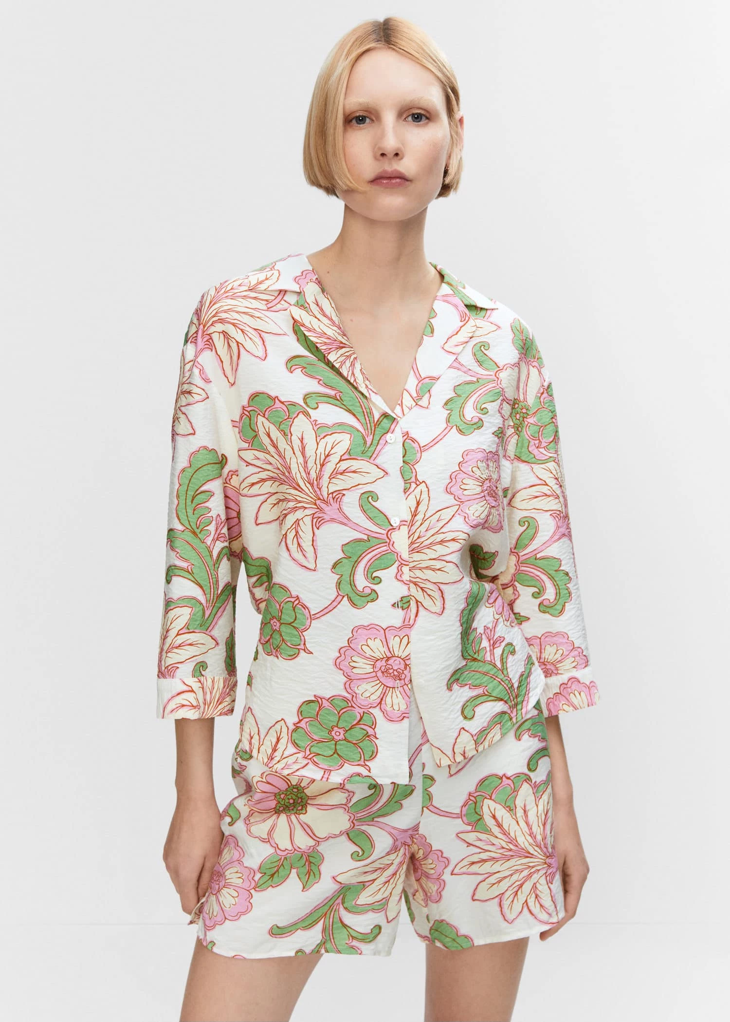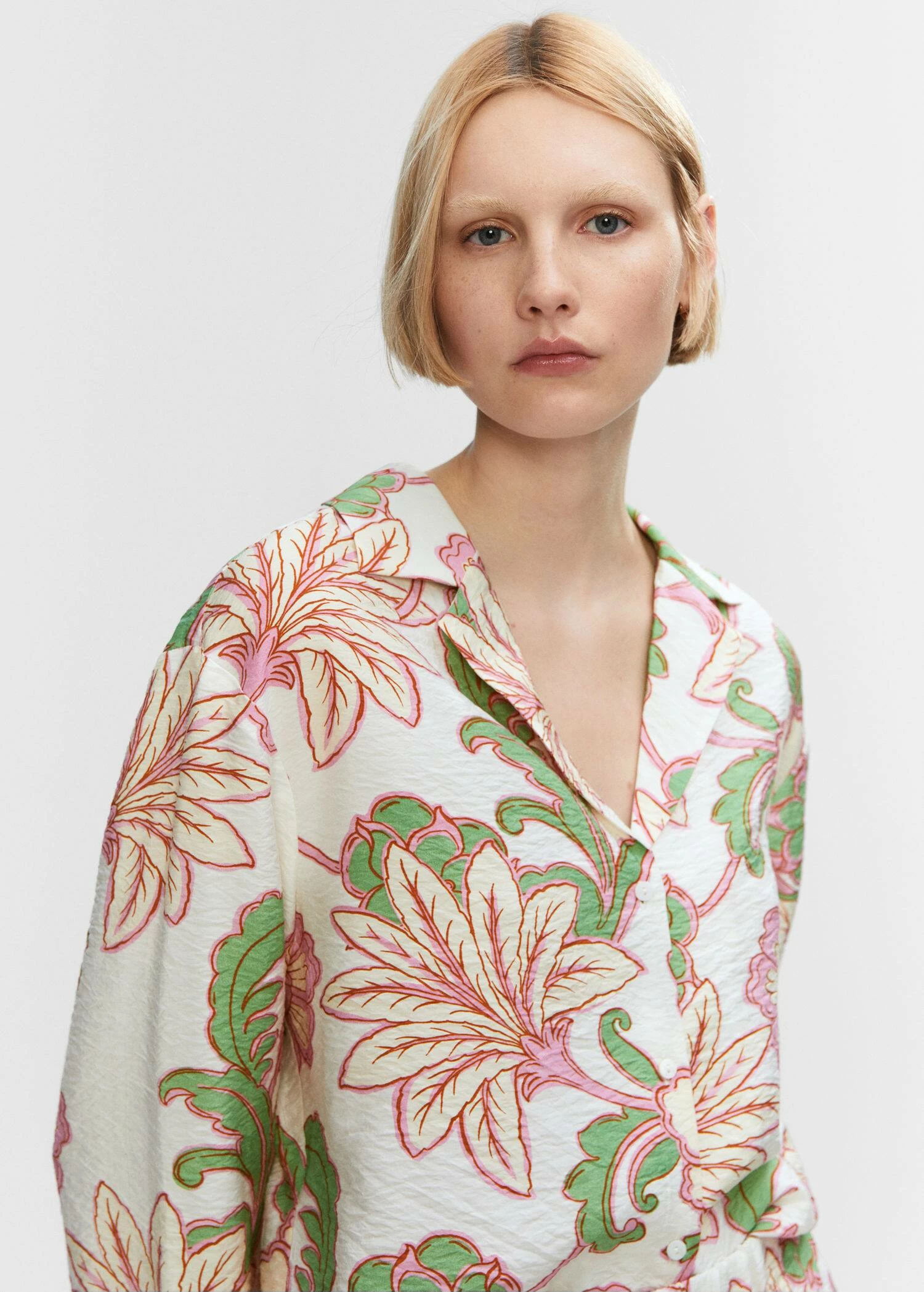 tissu fluide, tissu texture, coupe droite, imprime floral, col en v avec rabat, manches longues, fermeture boutonnee sur le devant, total lookComposition: 85% viscose,15% polyamide