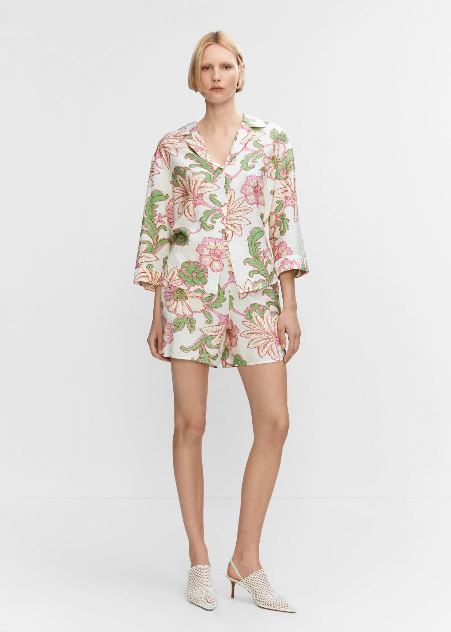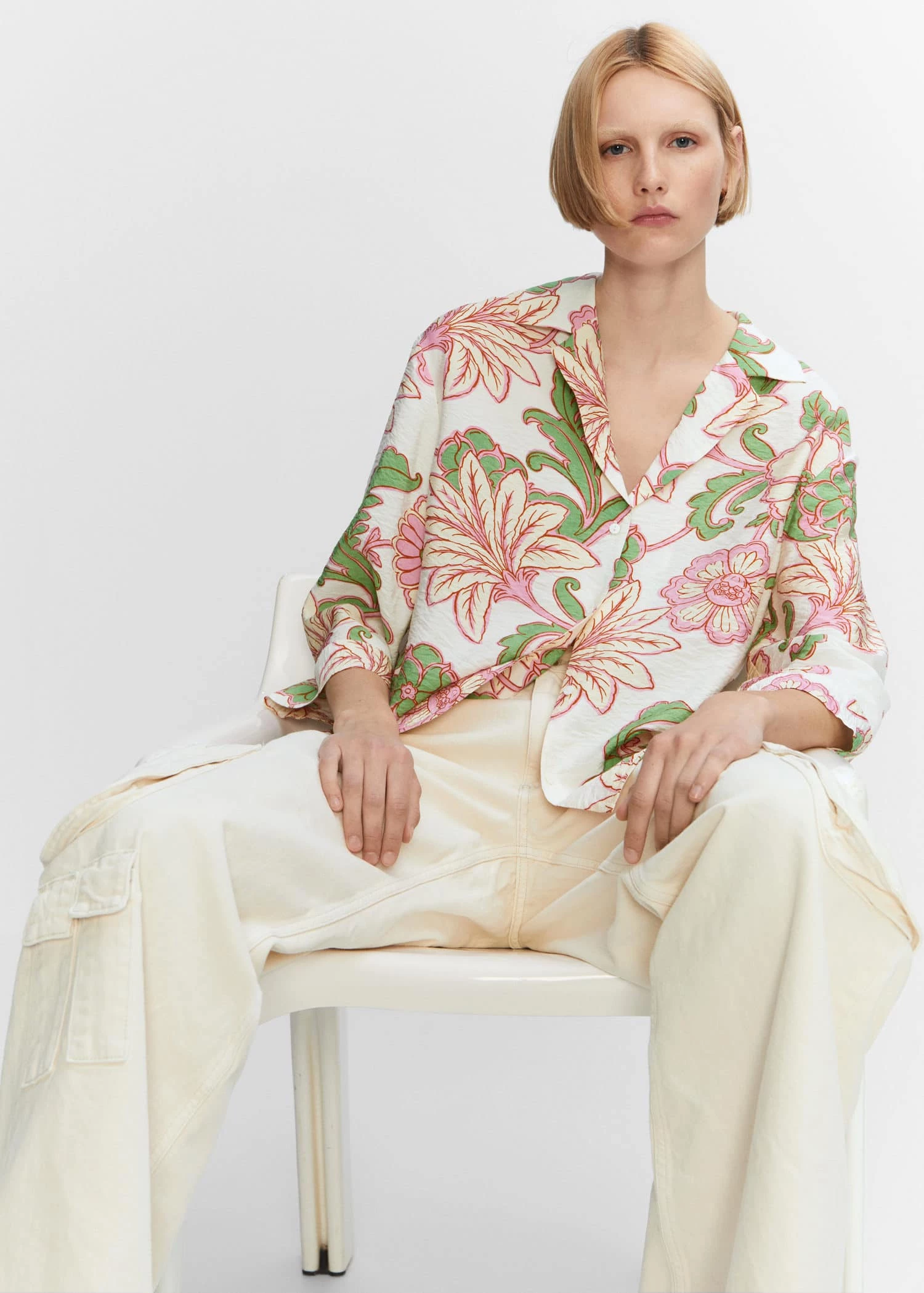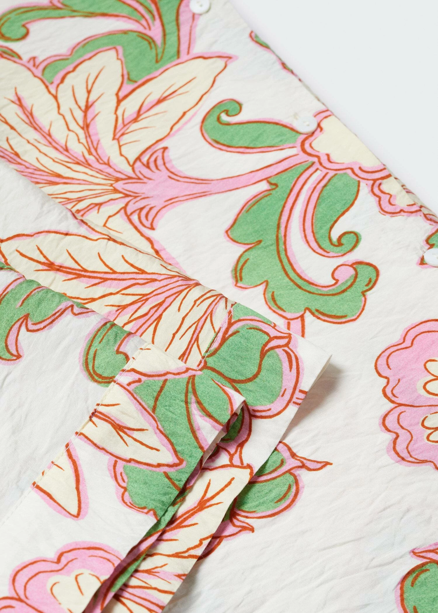 tissu fluide, tissu texture, coupe droite, imprime floral, col en v avec rabat, manches longues, fermeture boutonnee sur le devant, total lookComposition: 85% viscose,15% polyamide