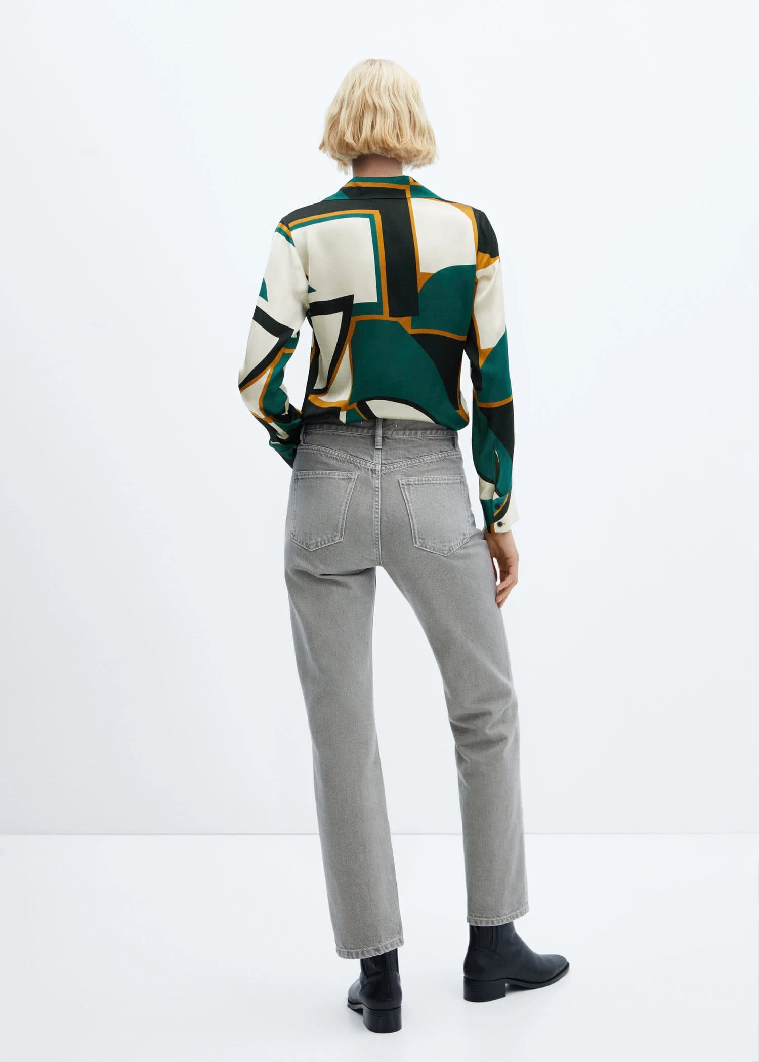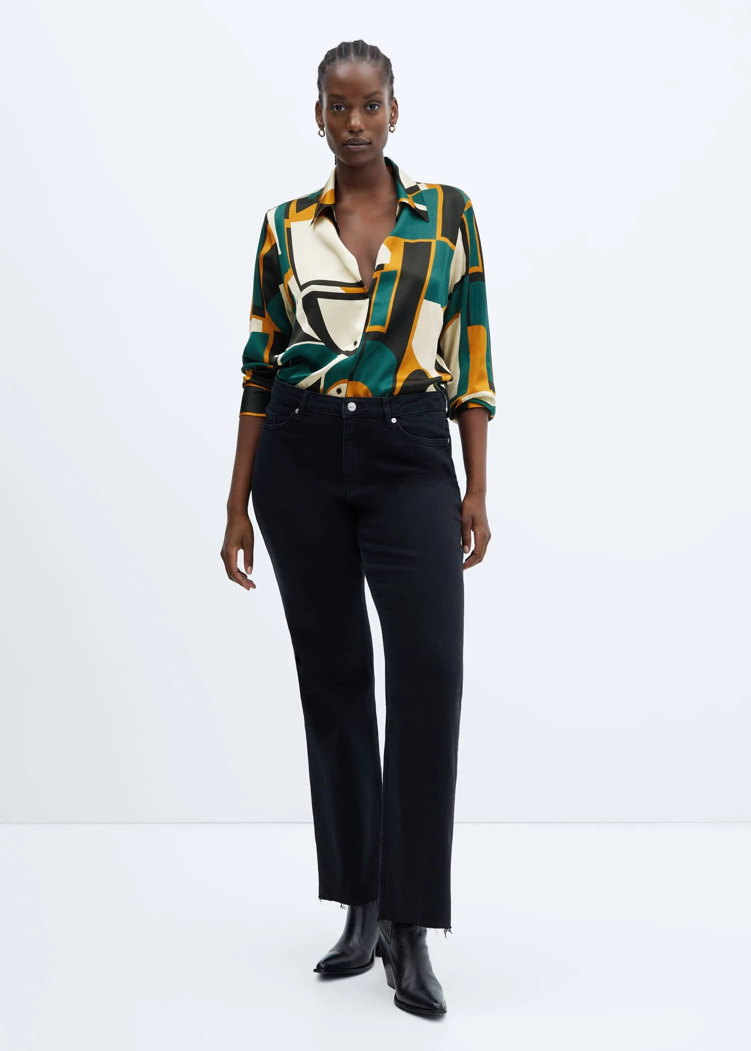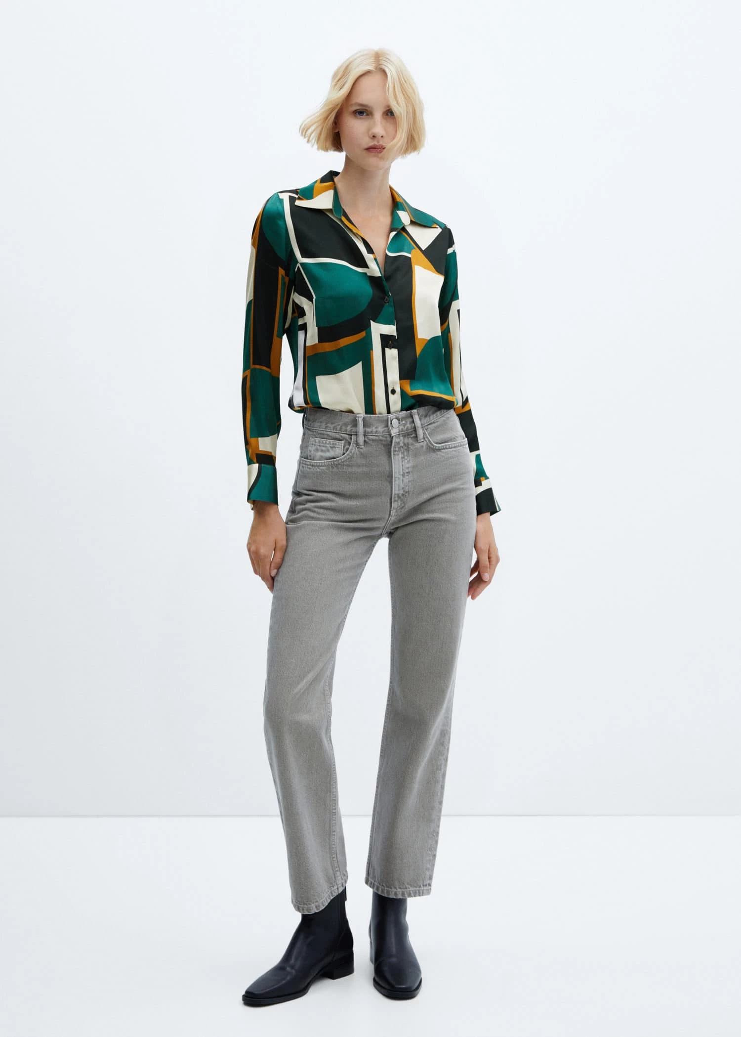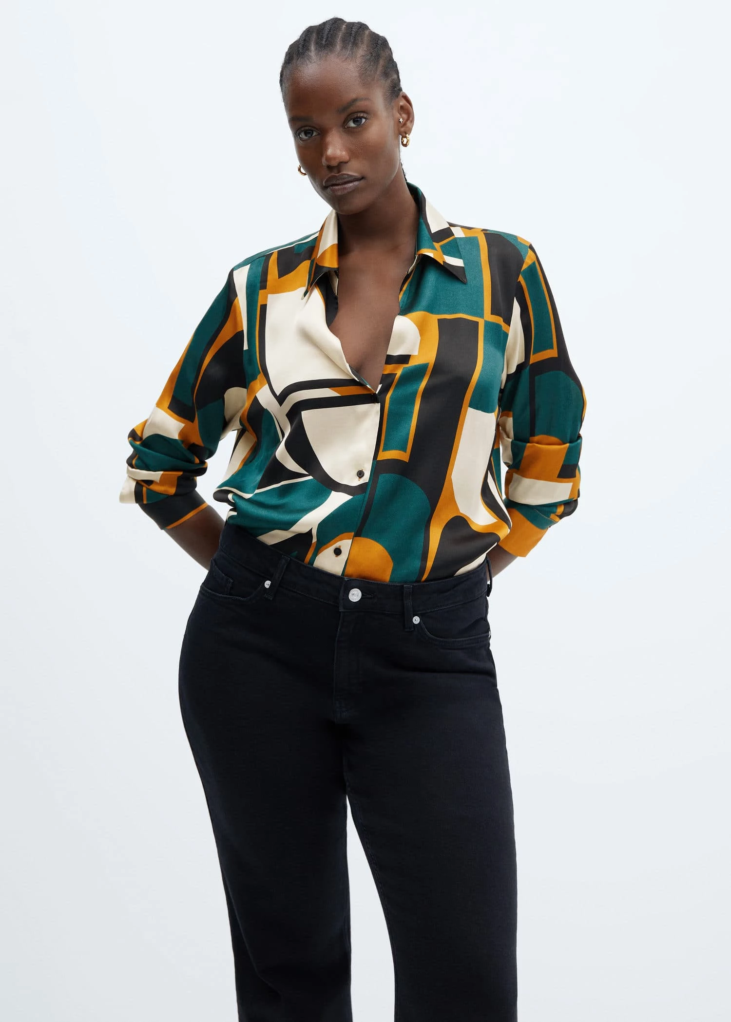 tissu satine, tissu fluide, coupe droite, motif geometrique, col rond, manches longues boutonnees, fermeture boutonnee sur le devant, disponible plusComposition: 100% viscose