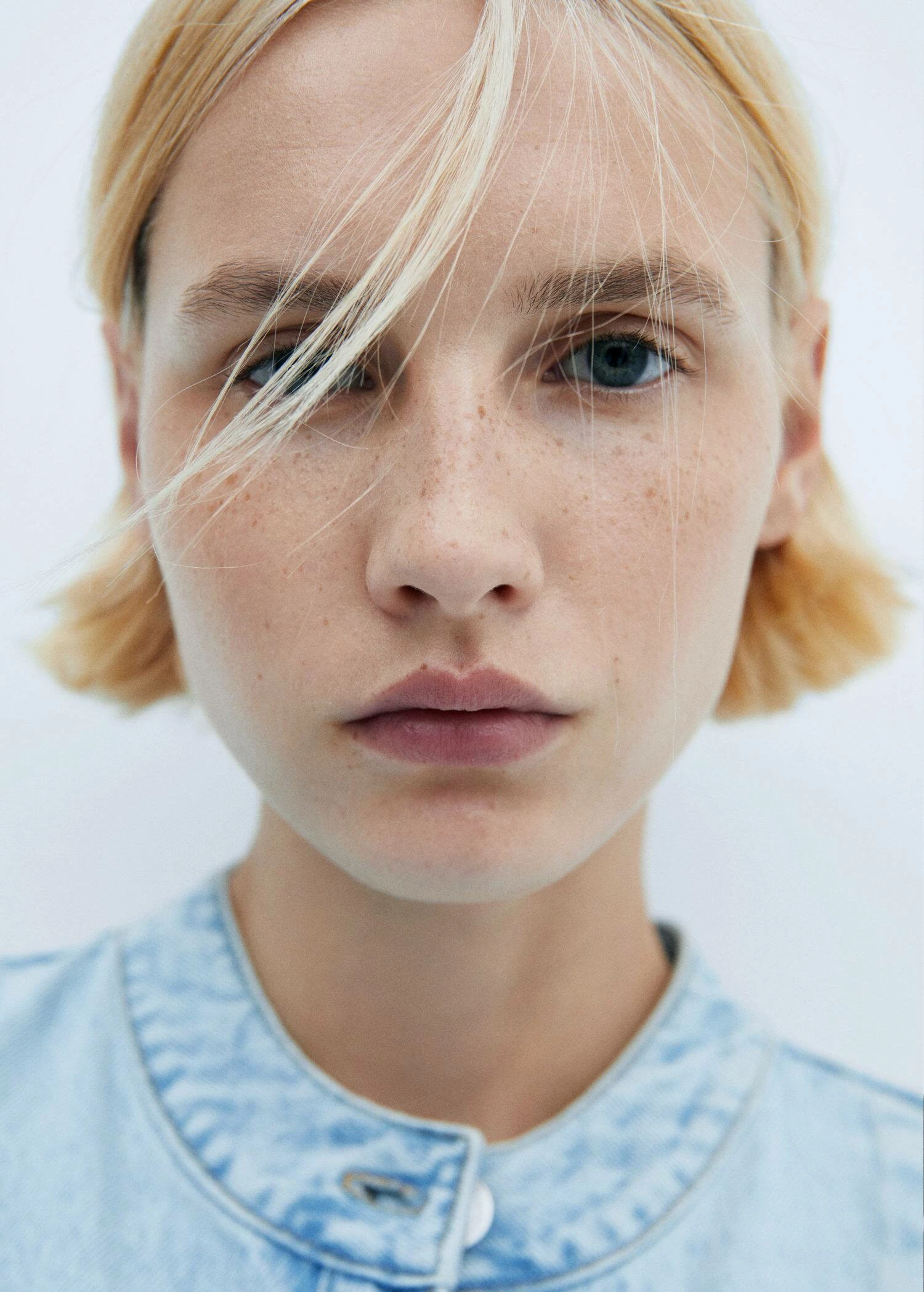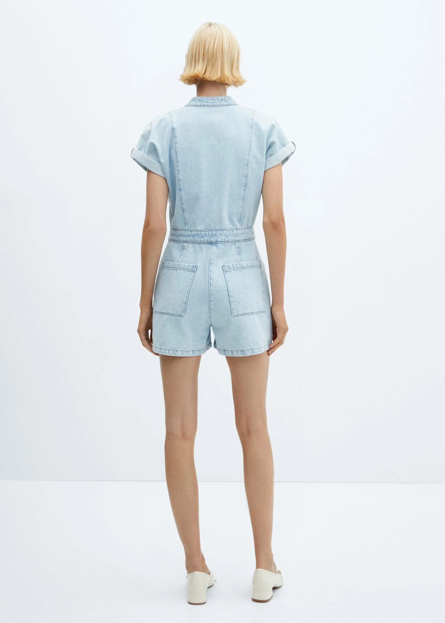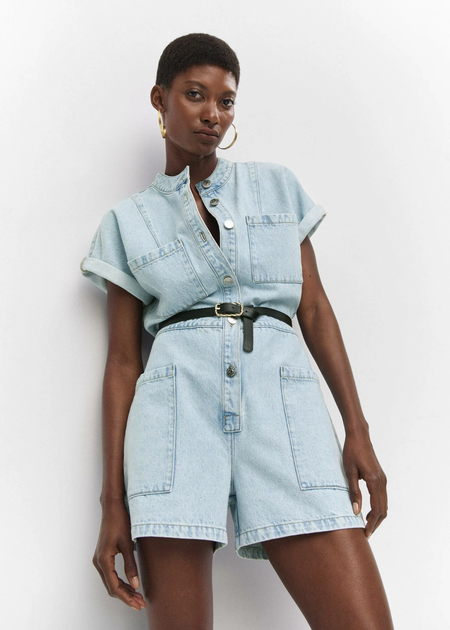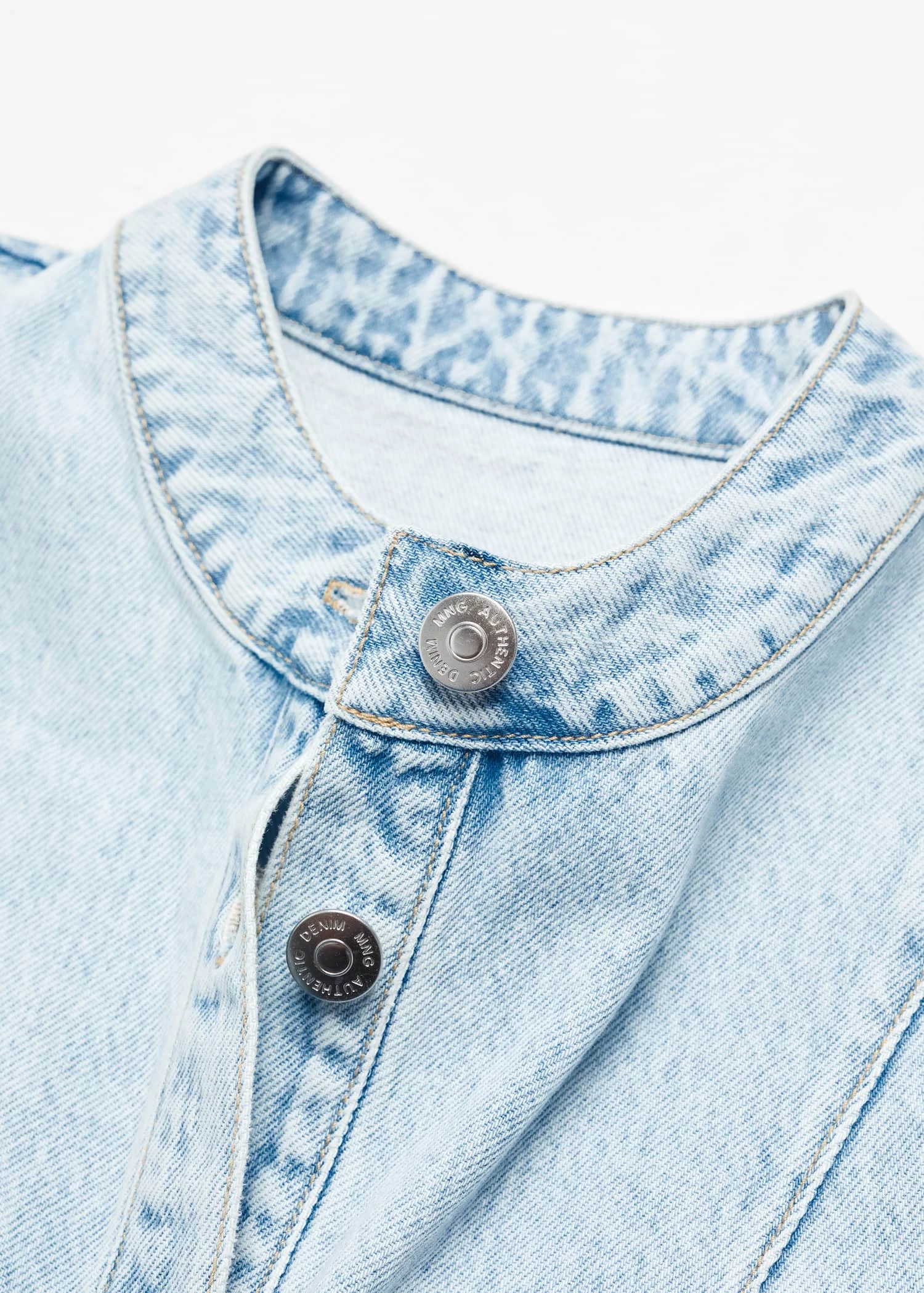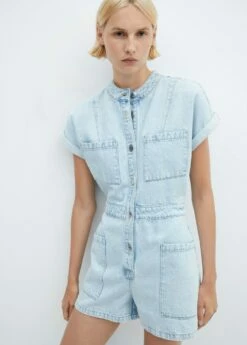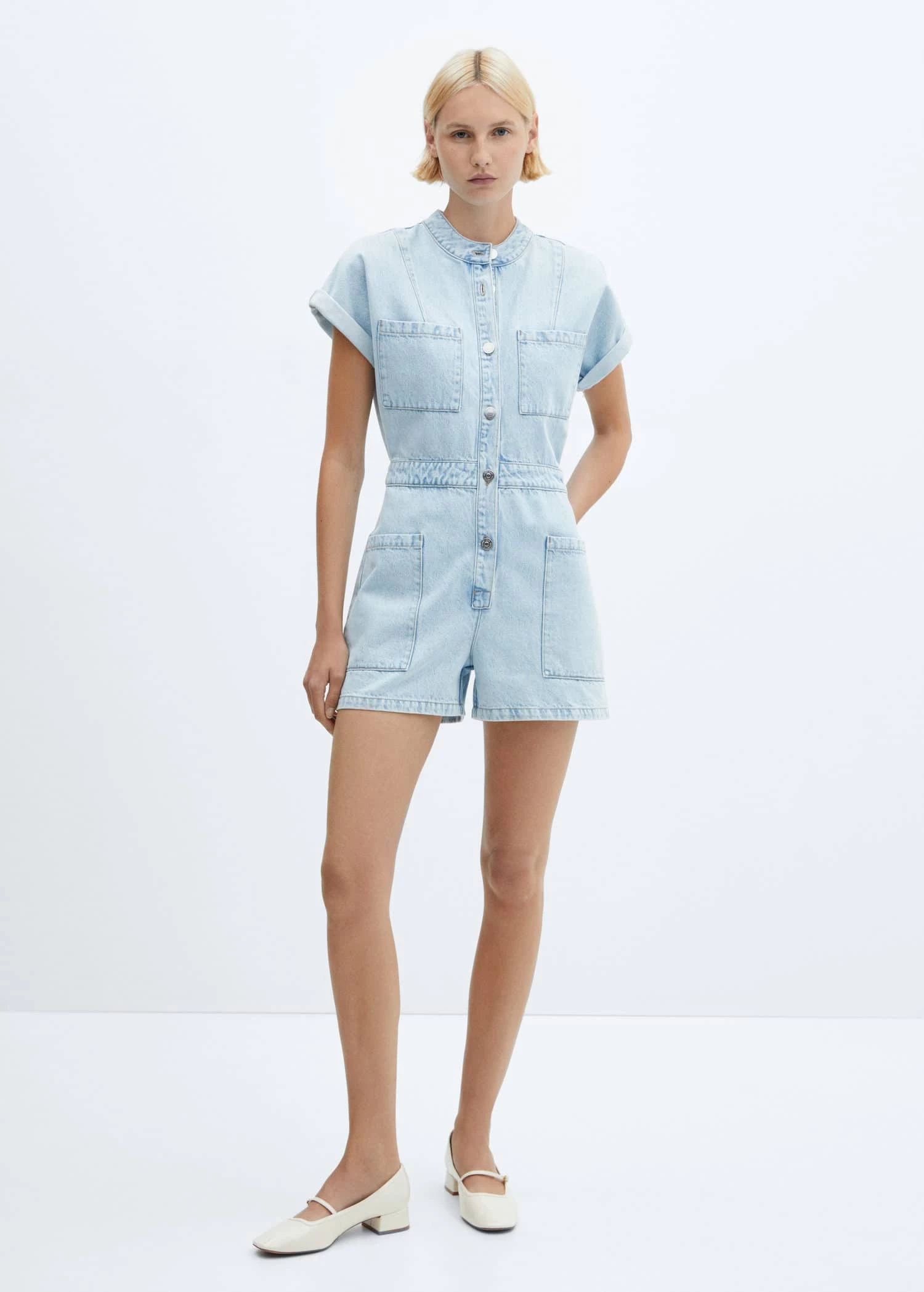 tissu en coton de style jean, coupe droite, coupe courte, col officier, manches courtes retournees, quatre poches plaquees a l’avant, fermeture boutonnee sur le devant, le mannequin mesure 179 cm et porte une taille 36Composition: 100% coton