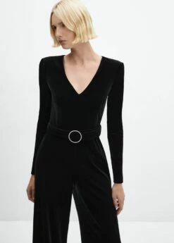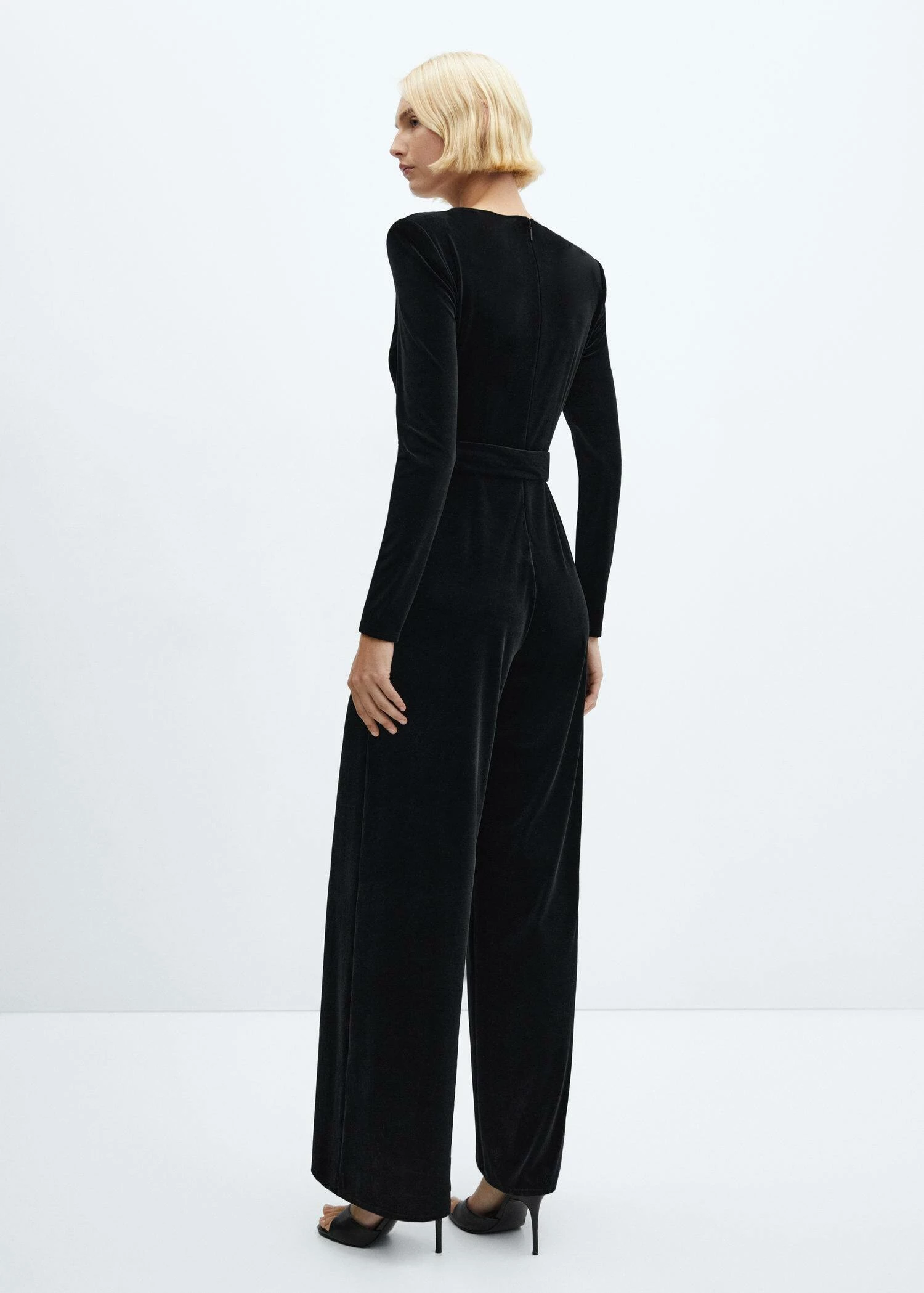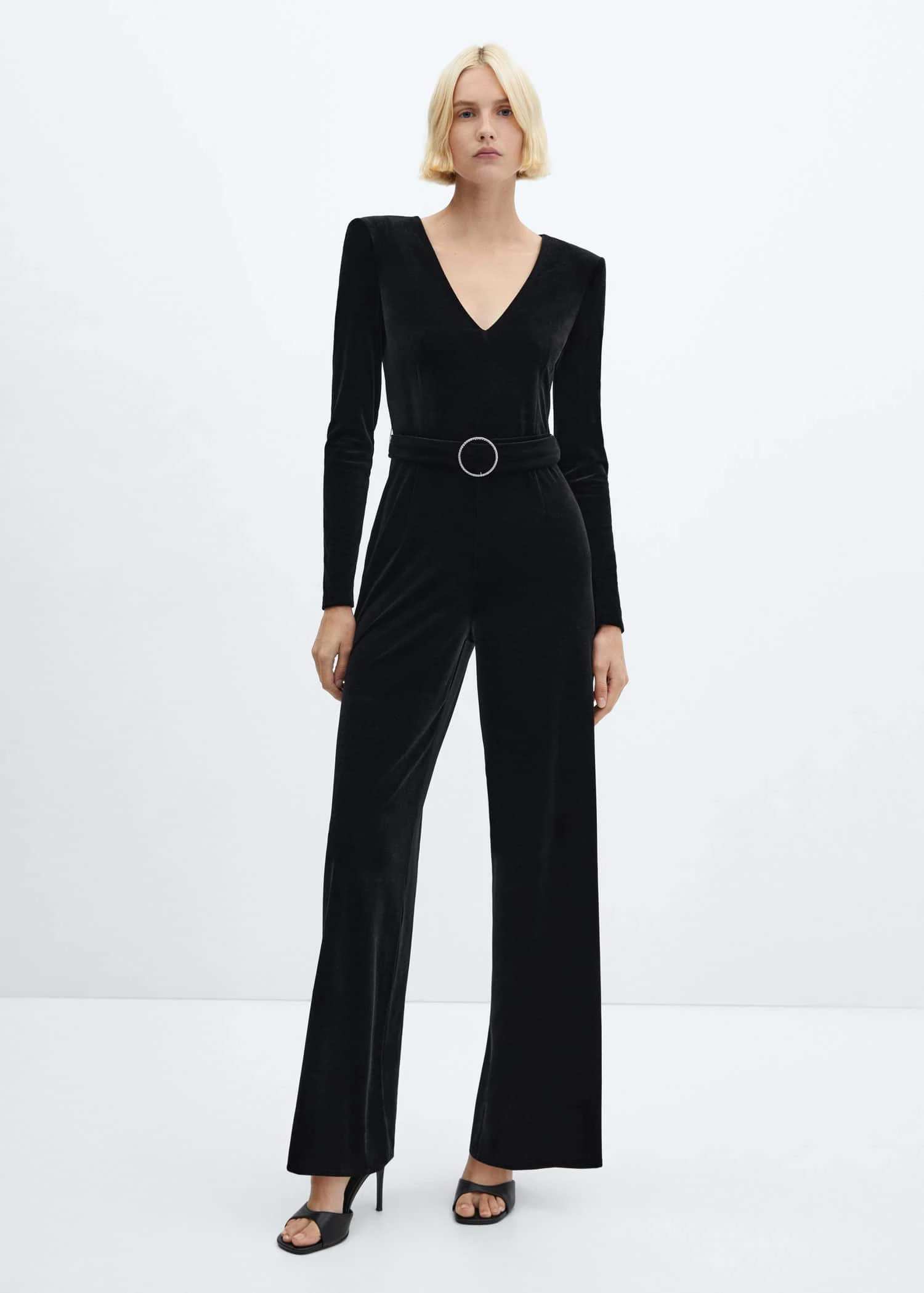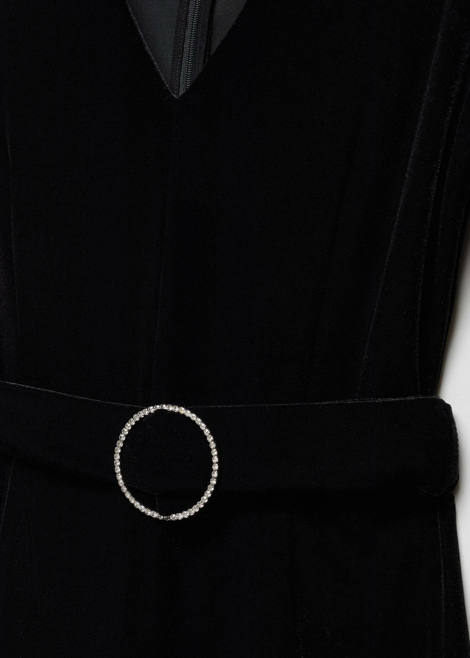 tissu en velours, coupe longue, coupe wideleg, col en v, manches longues, fermeture eclair invisible a l’arriere, ceinture amovible, ornement a strass, disponible plus, collection fetes et ceremonies.Composition: 92% polyester,8% elasthanne. Lisiere: 100% viscose