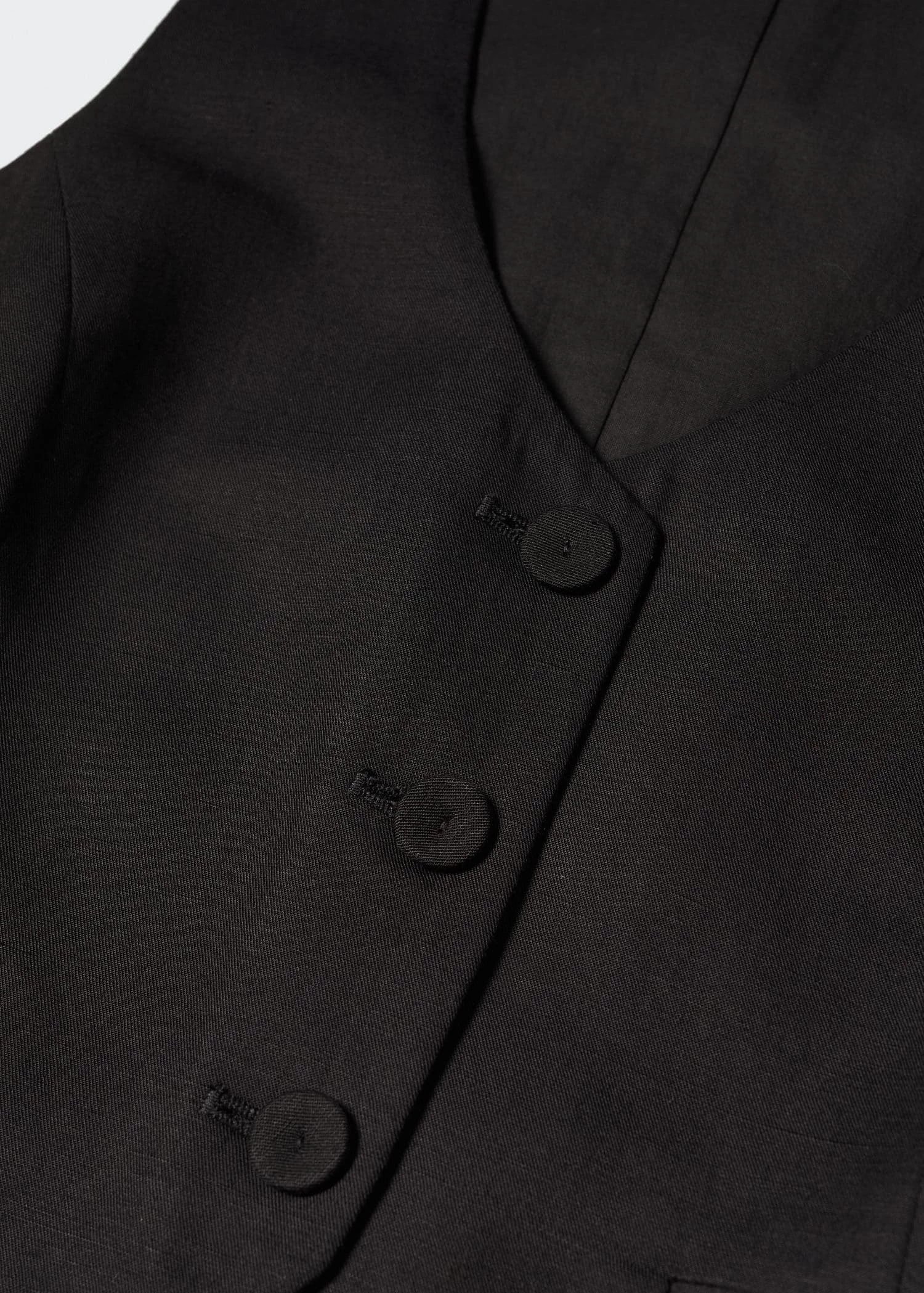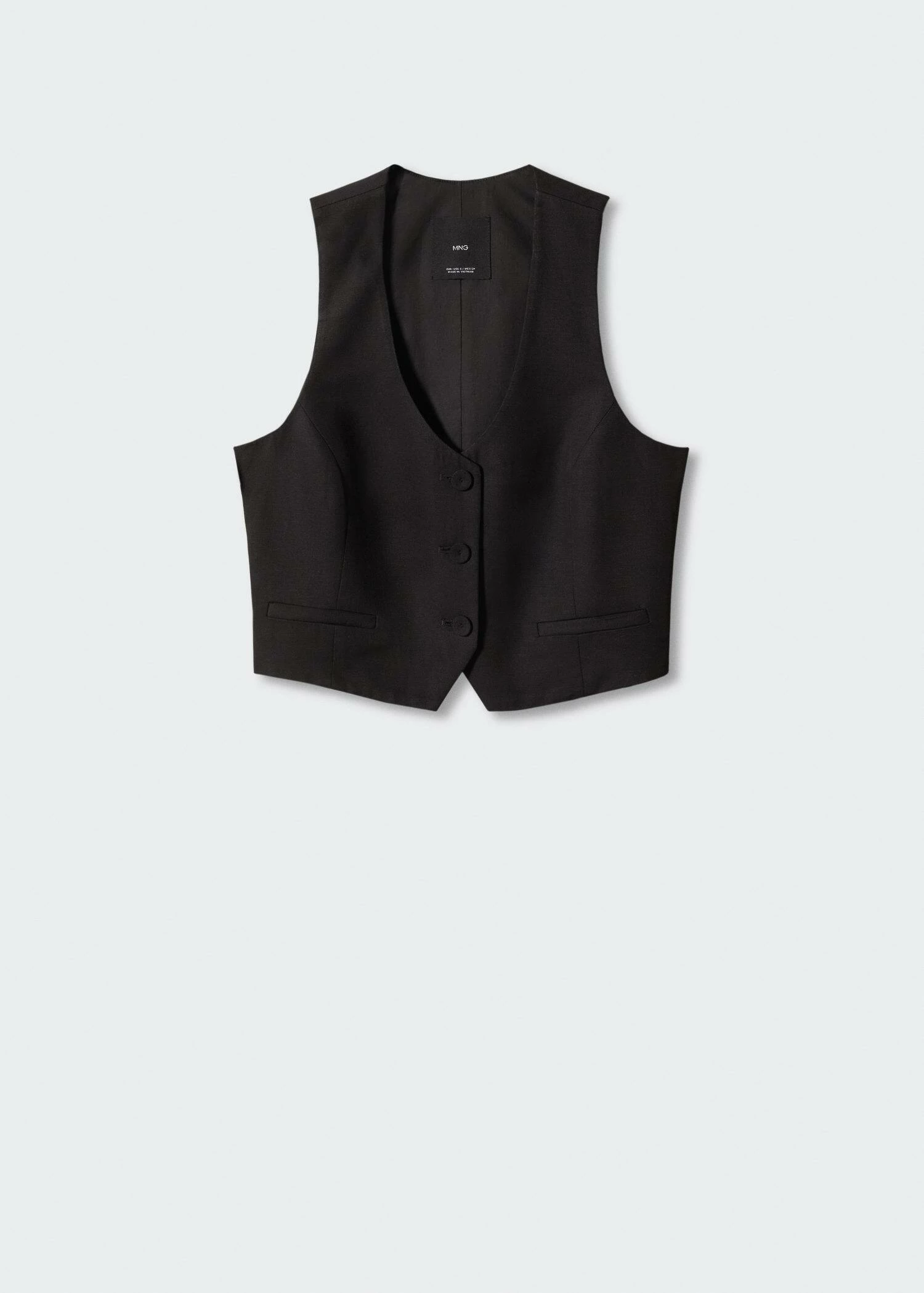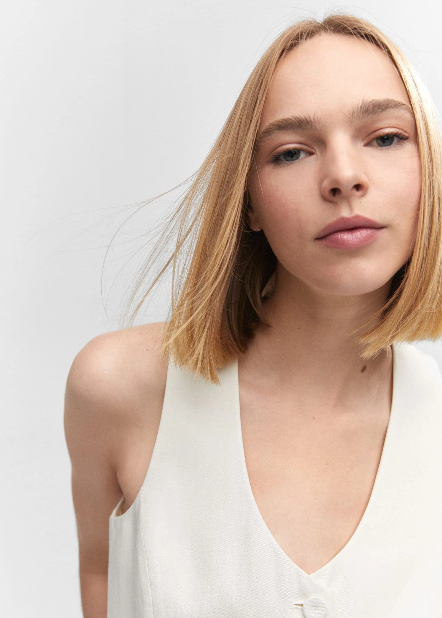 tissu fluide, ajuste, coupe courte, col en v, sans manches, deux poches passepoilees a l’avant, fermeture boutonnee sur le devant, doublure, total lookComposition: 61% viscose,28% lin,11% coton. Doublure: 100% coton