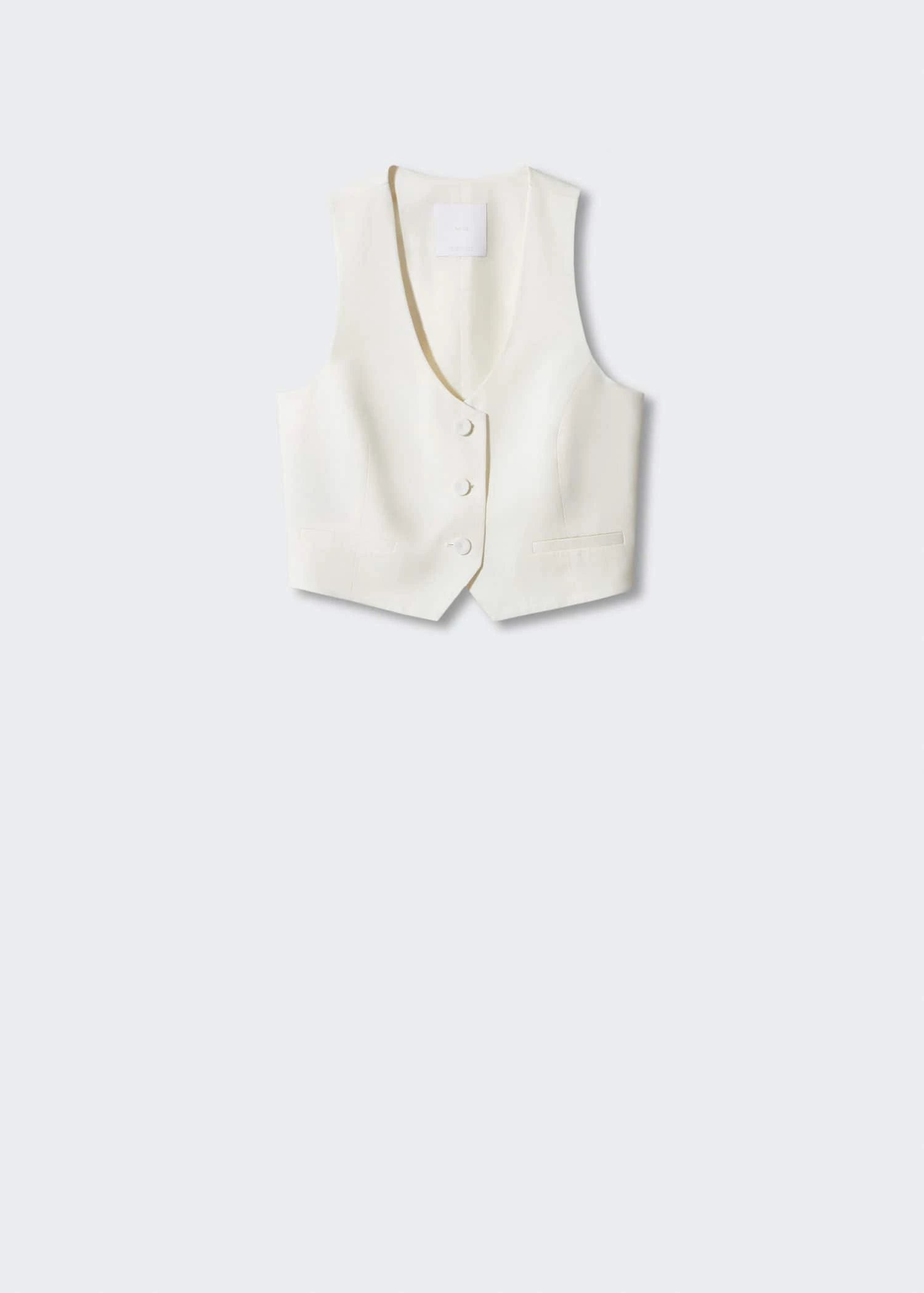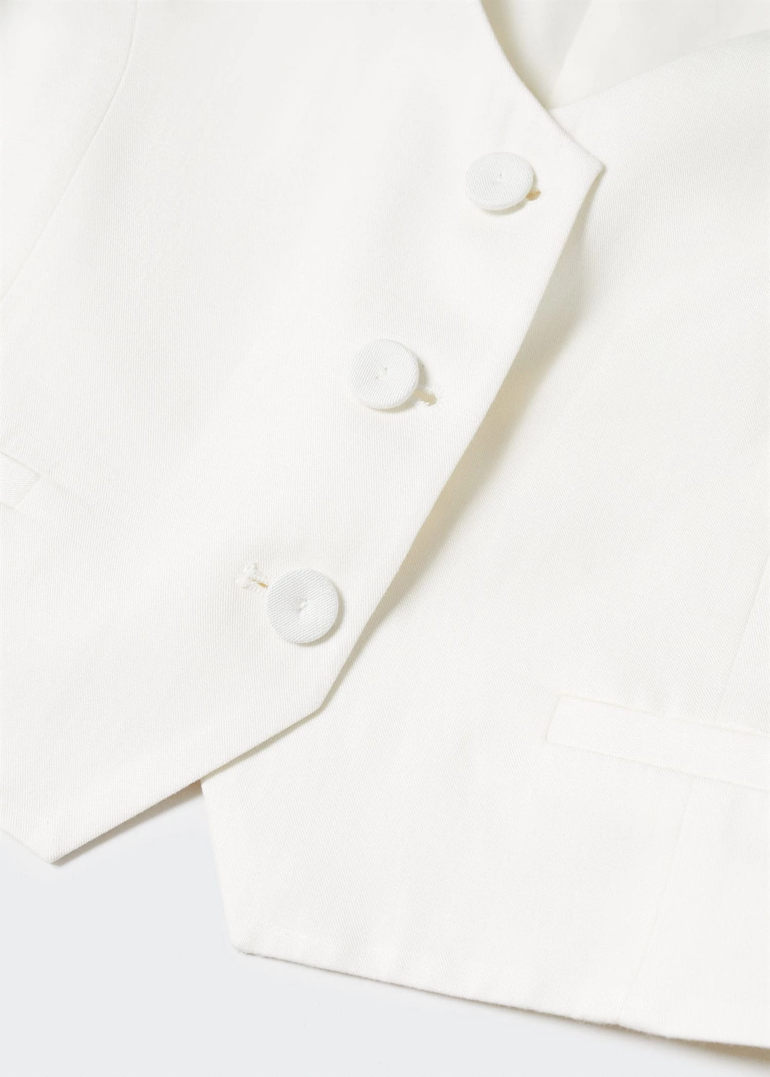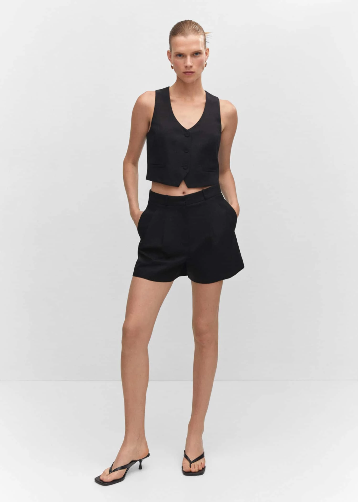 tissu fluide, ajuste, coupe courte, col en v, sans manches, deux poches passepoilees a l’avant, fermeture boutonnee sur le devant, doublure, total lookComposition: 61% viscose,28% lin,11% coton. Doublure: 100% coton