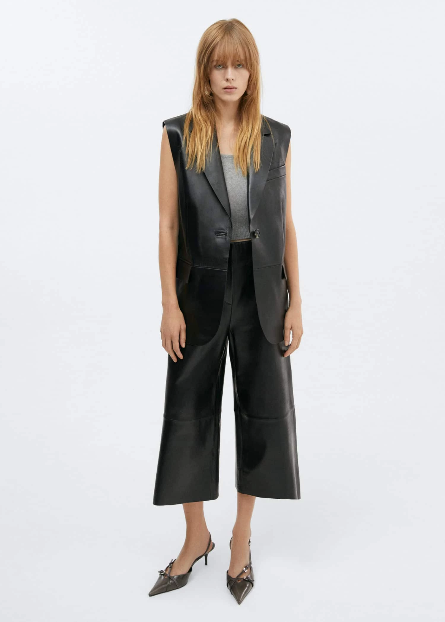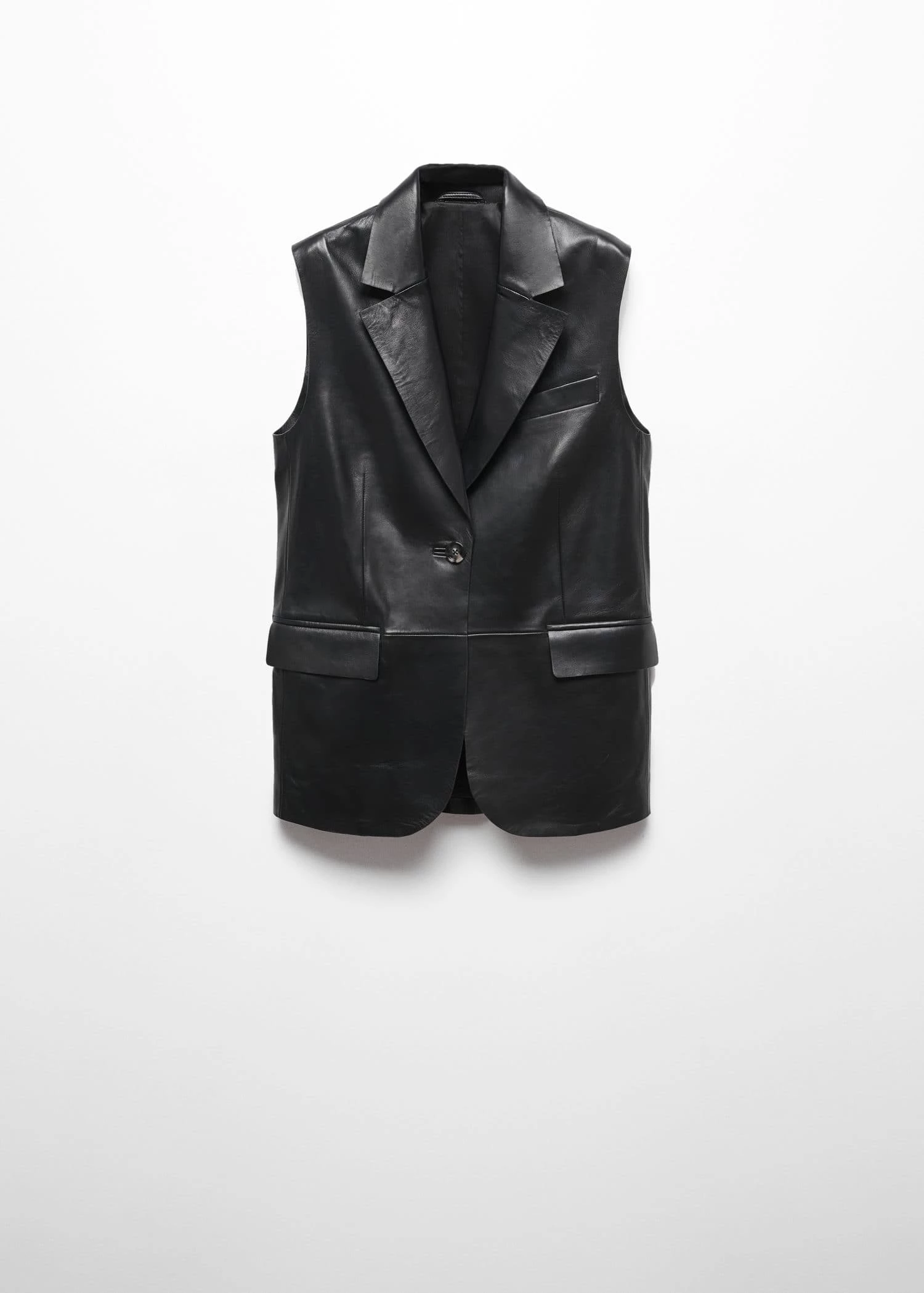 collection selection, 100 % cuir ovin, coupe droite, col en v avec rabat, sans manches, poche passepoilee sur la poitrine, deux poches passepoilees sur les cotes, fermeture a bouton sur le devant, coutures decoratives, doublure, total look, une selection de pieces qui vous accompagneront lors du retour au bureau. confectionnee avec des matieres de qualite pour creer une garde-robe feminine et contemporaine pour votre quotidien.