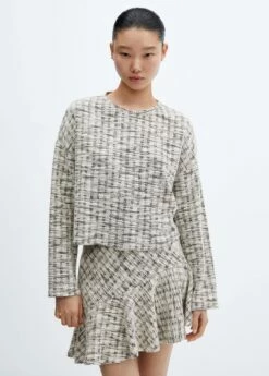 tissu de coton melange, tissu tweed, coupe courte, asymetrique, imprime jaspe, taille elastique, sans fermeture, base volantee, total lookComposition: 55% polyester,45% coton