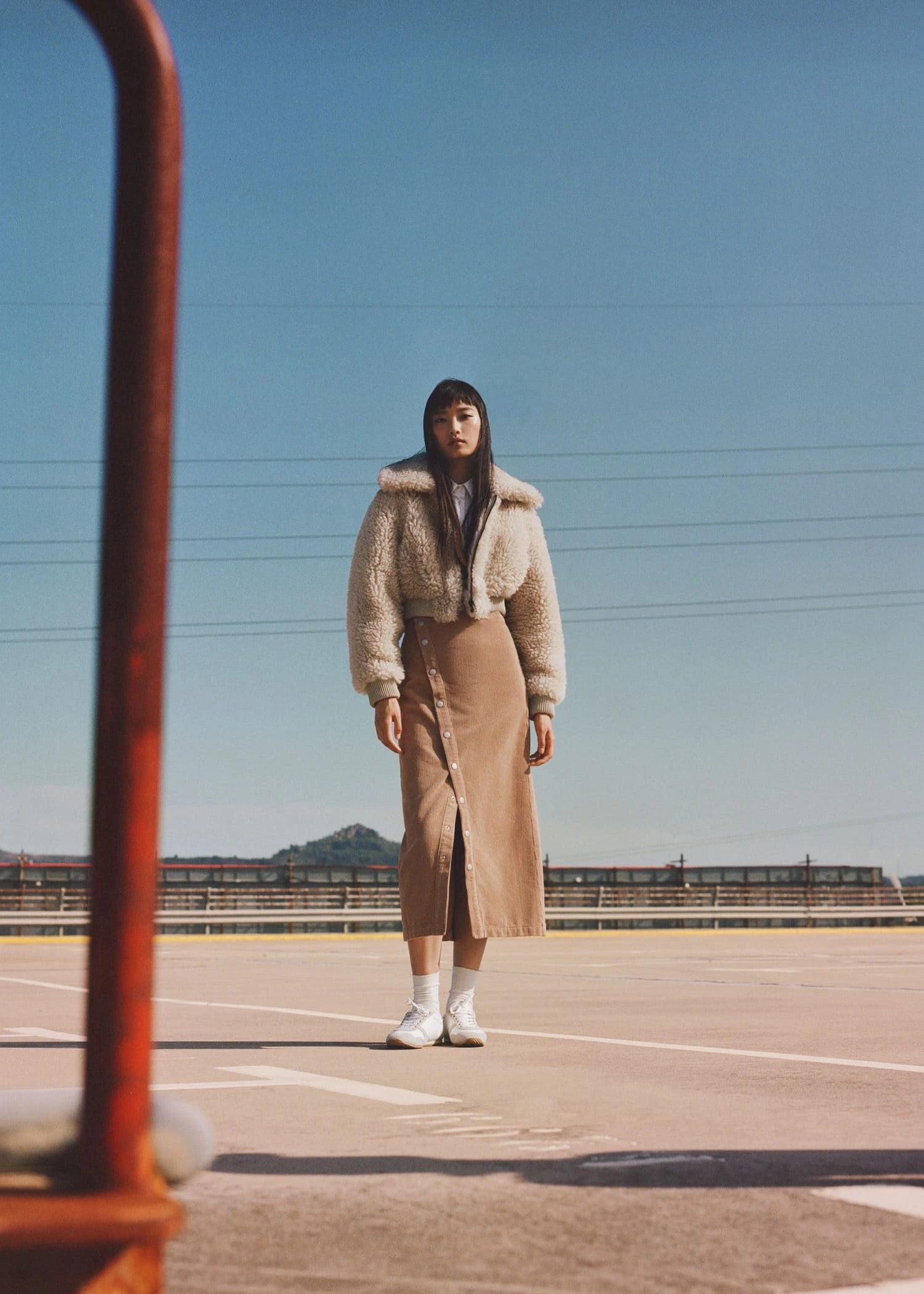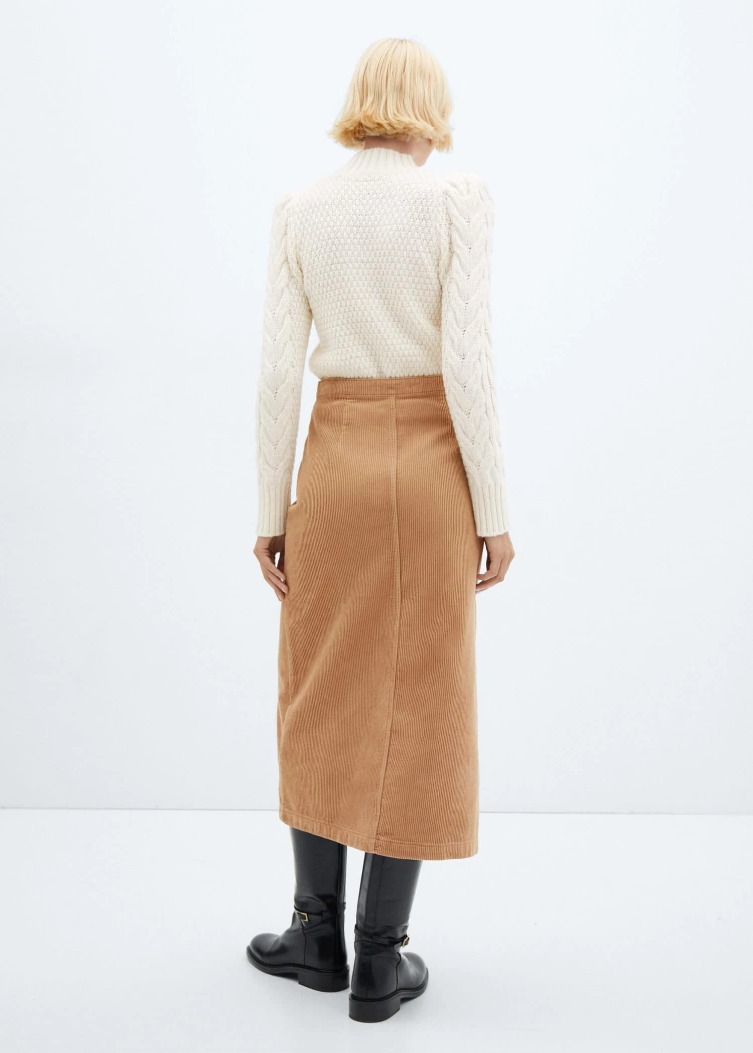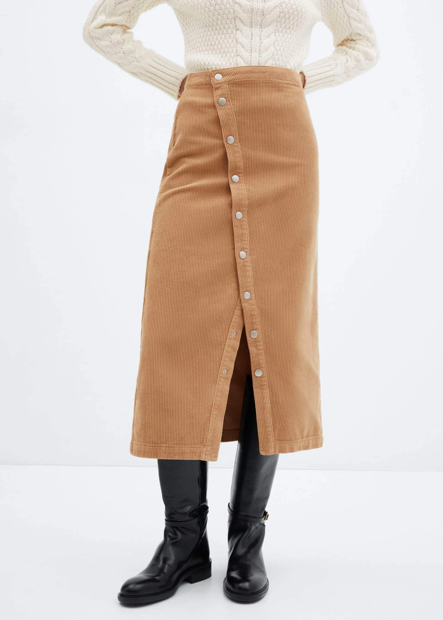100 % coton, tissu en velours cotele, coupe midi, coupe asymetrique, taille haute, fermeture a l’avant a boutons-pression, ouverture en bas a l’avantComposition: 100% coton