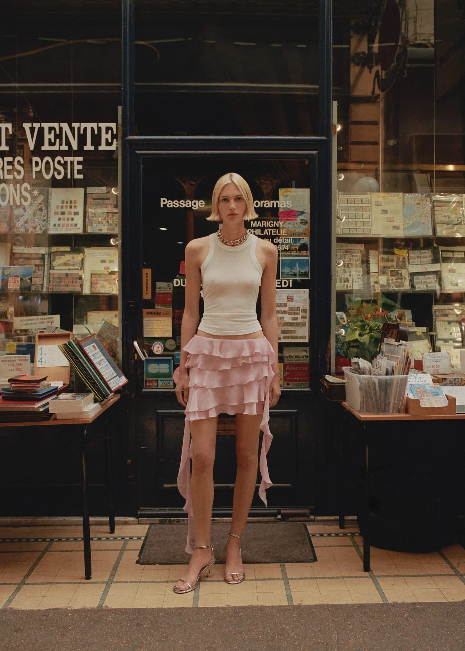tissu en gaze, tissu fluide, motif volants, droit, coupe courte, taille basse, bas asymetrique, fermeture eclair lateraleComposition: 100% viscose. Doublure: 100% polyester