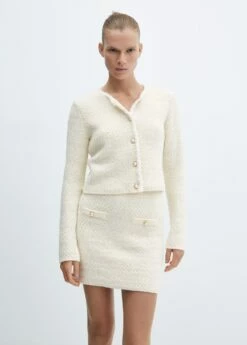 tissu en maille, droit, ajuste, coupe courte, deux poches passepoilees a l’avant, taille elastiquee, sans fermeture, boutons effet bijoux, total lookComposition: 39% acrylique,32% polyester,22% coton,5% polyamide,2% polyester avec revêtement de cuivre