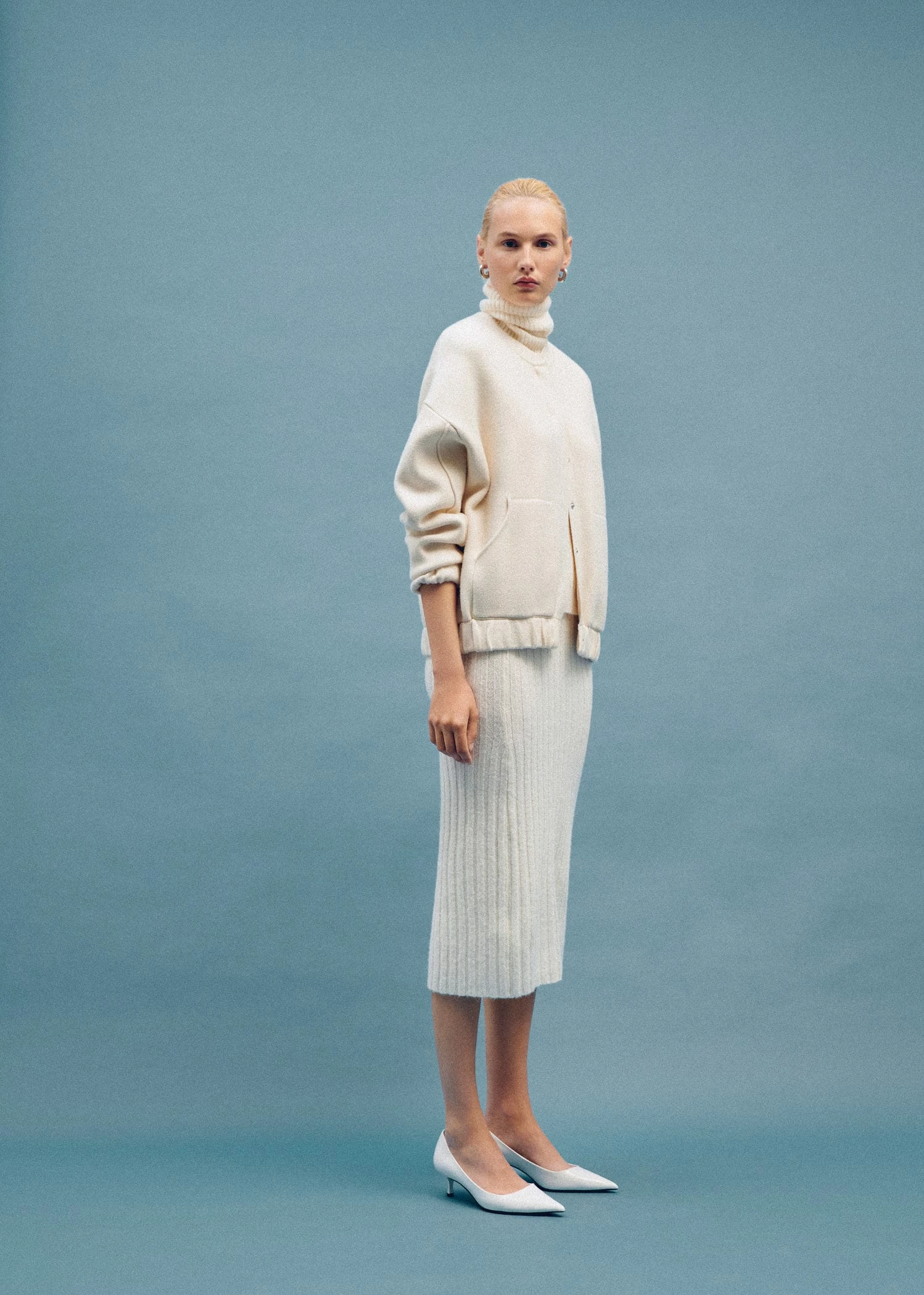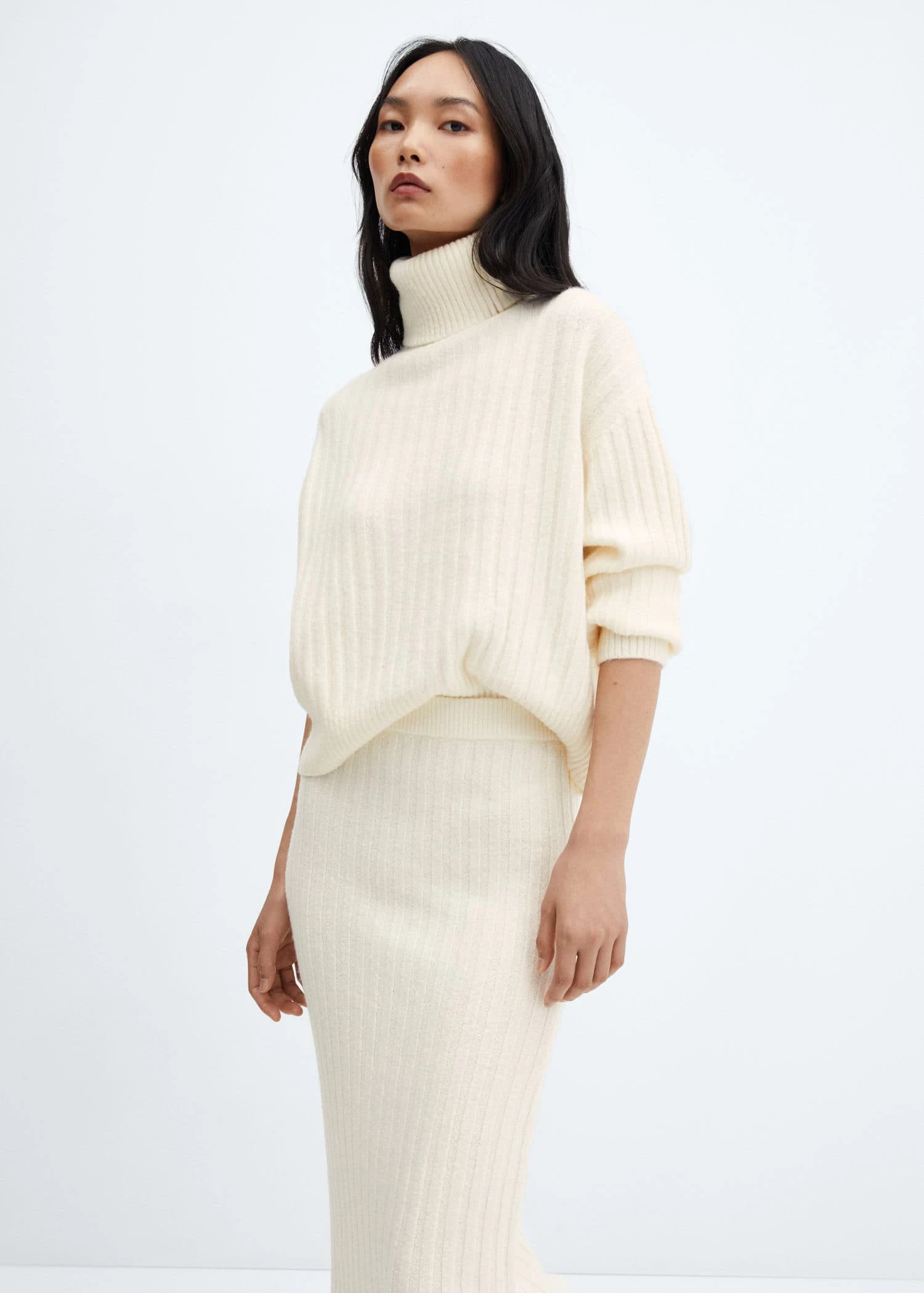 tissu de laine melange, tissu en grosse maille, coupe midi, coupe droite, cotele, taille normale, sans fermeture, taille elastiqueComposition: 50% acrylique,44% polyester,5% laine,1% elasthanne