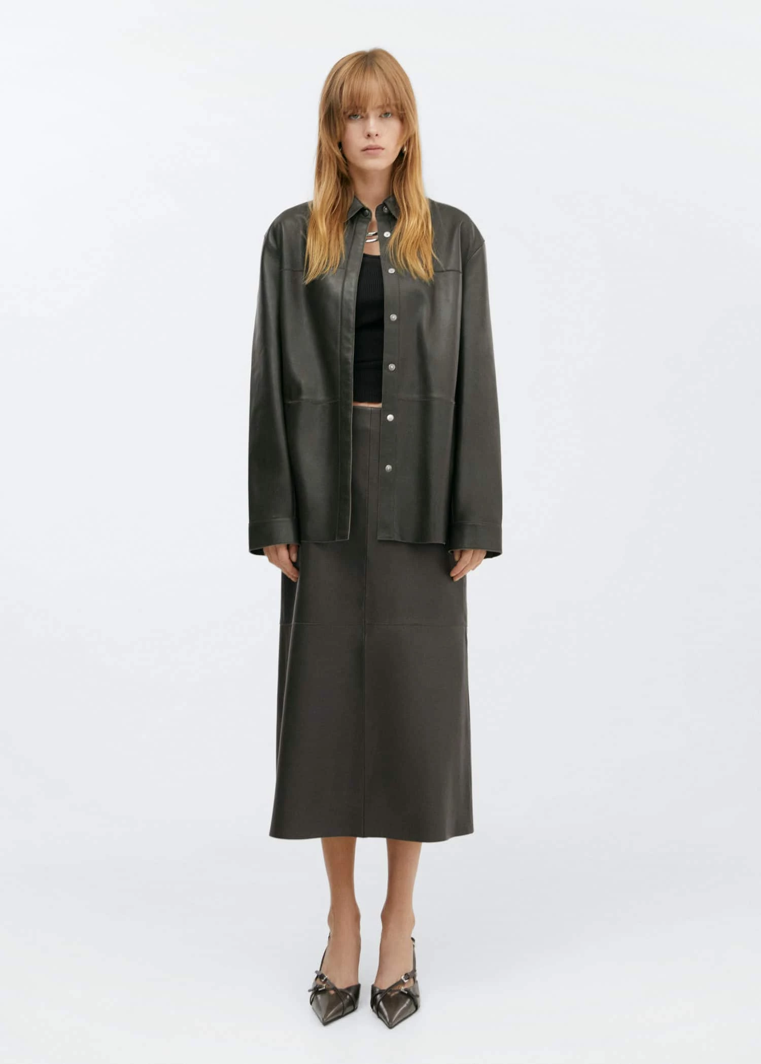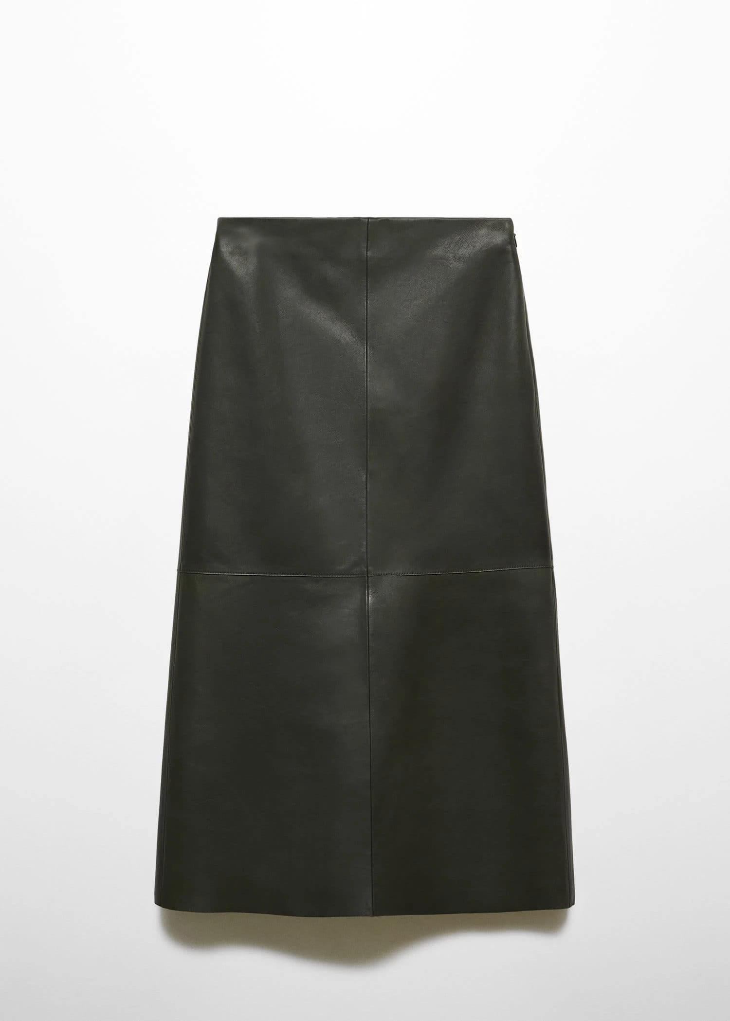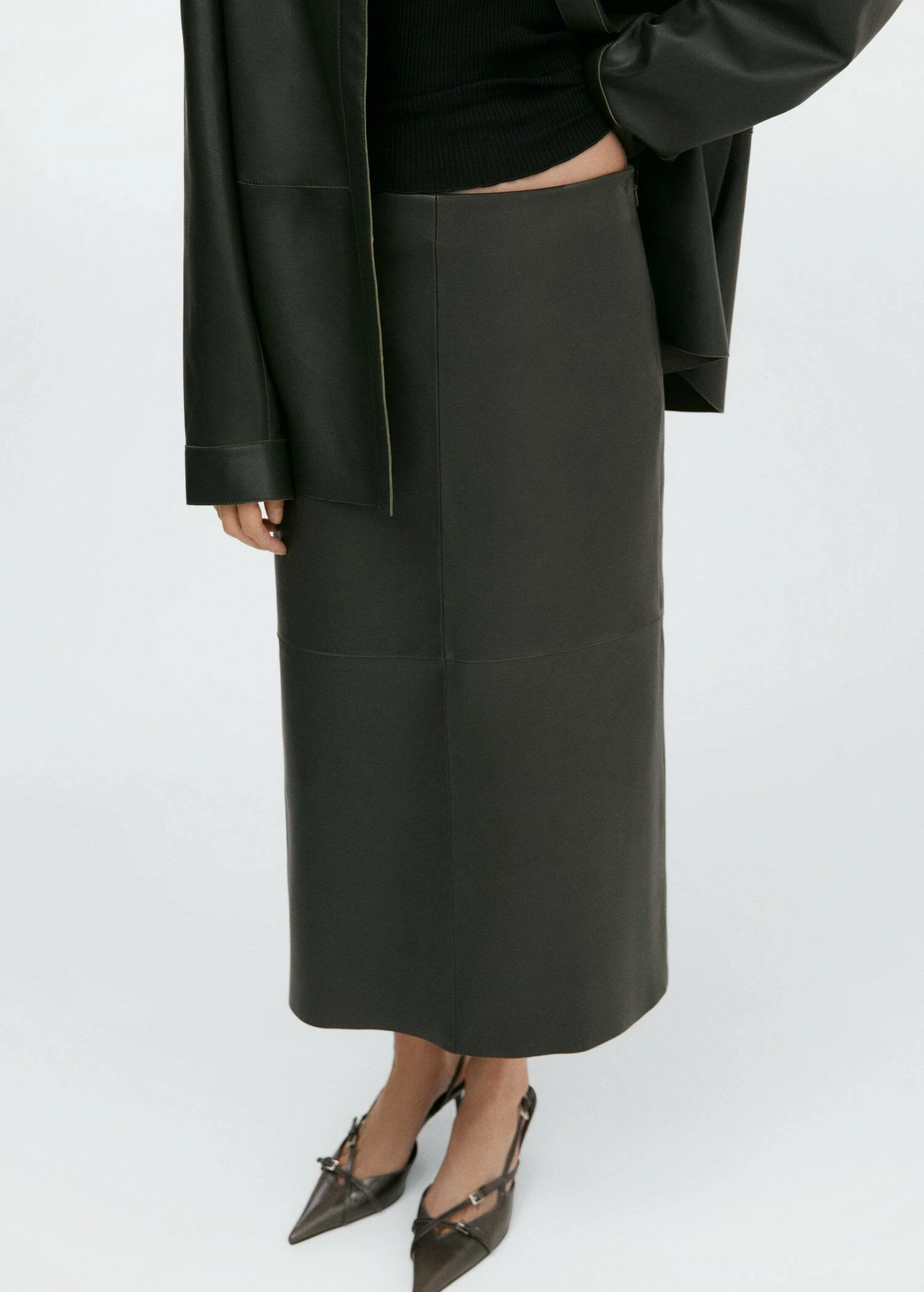 collection selection, 100 % cuir ovin, coupe midi, coupe droite, fermeture eclair laterale, detail d’ouverture au dos, coutures decoratives, doublure, une selection de pieces qui vous accompagneront lors du retour au bureau. confectionnee avec des matieres de qualite pour creer une garde-robe feminine et contemporaine pour votre quotidien.