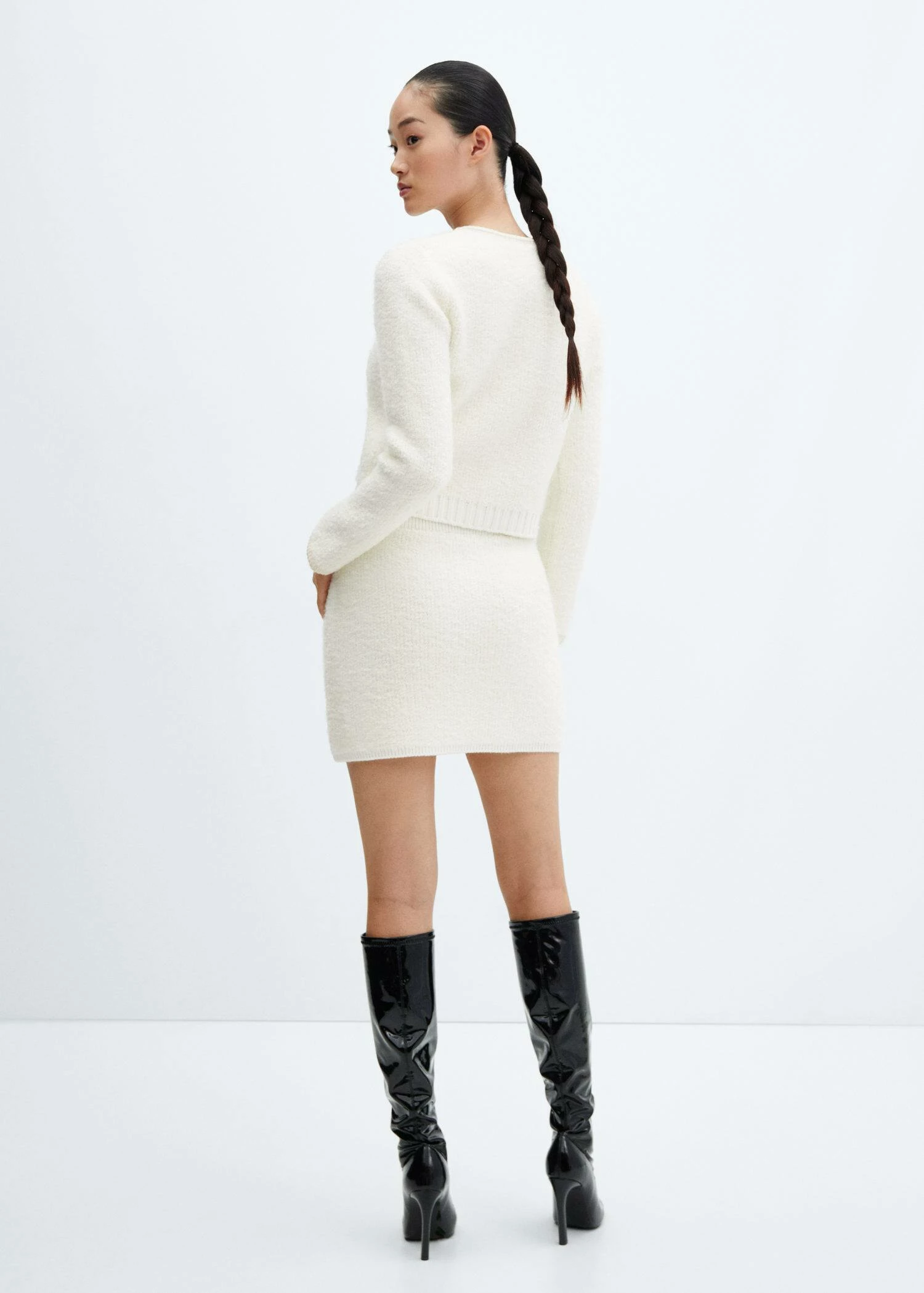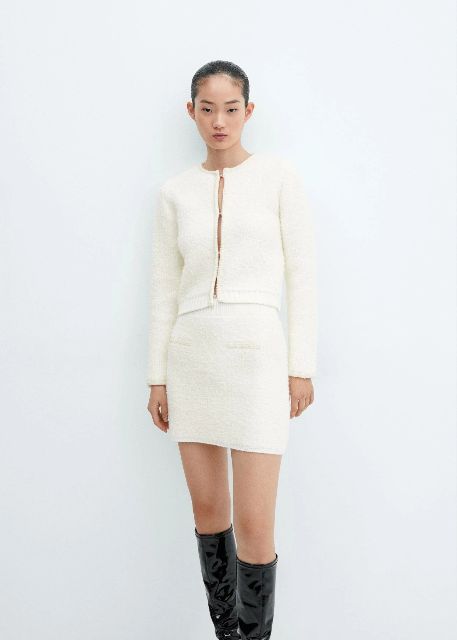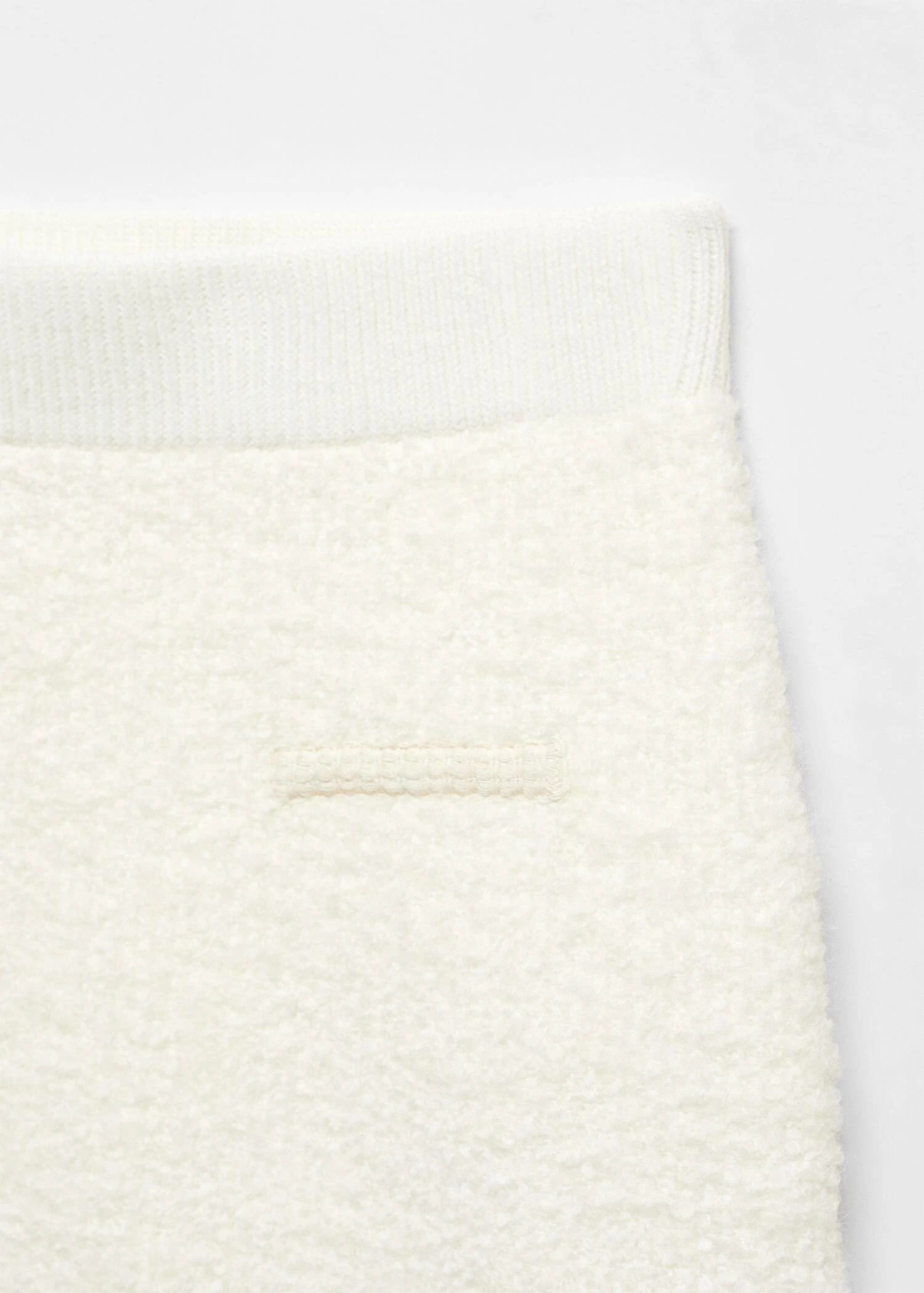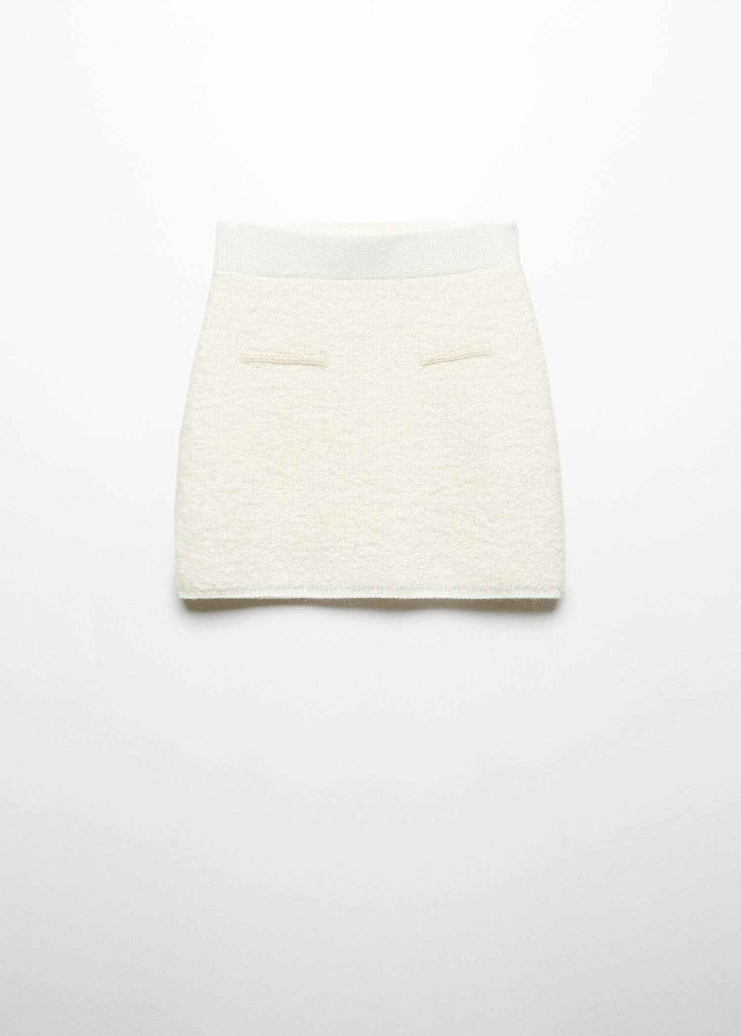 tissu tweed, maille moyenne, coupe courte, coupe cintree, taille elastique, deux poches passepoilees a l’avant, sans fermeture, liseres contrastantsComposition: 80% acrylique,13% polyester,4% polyamide,3% alpaca