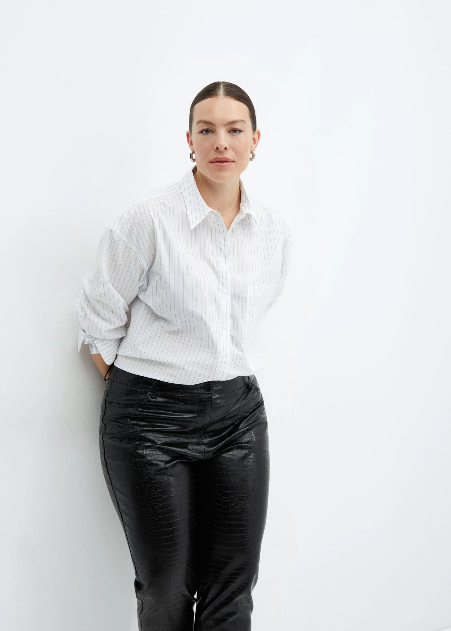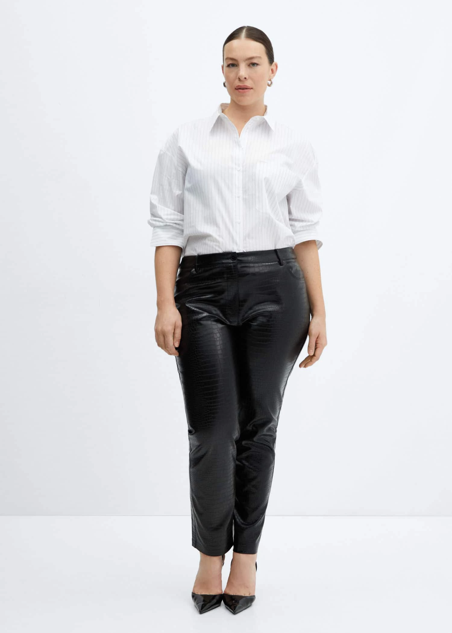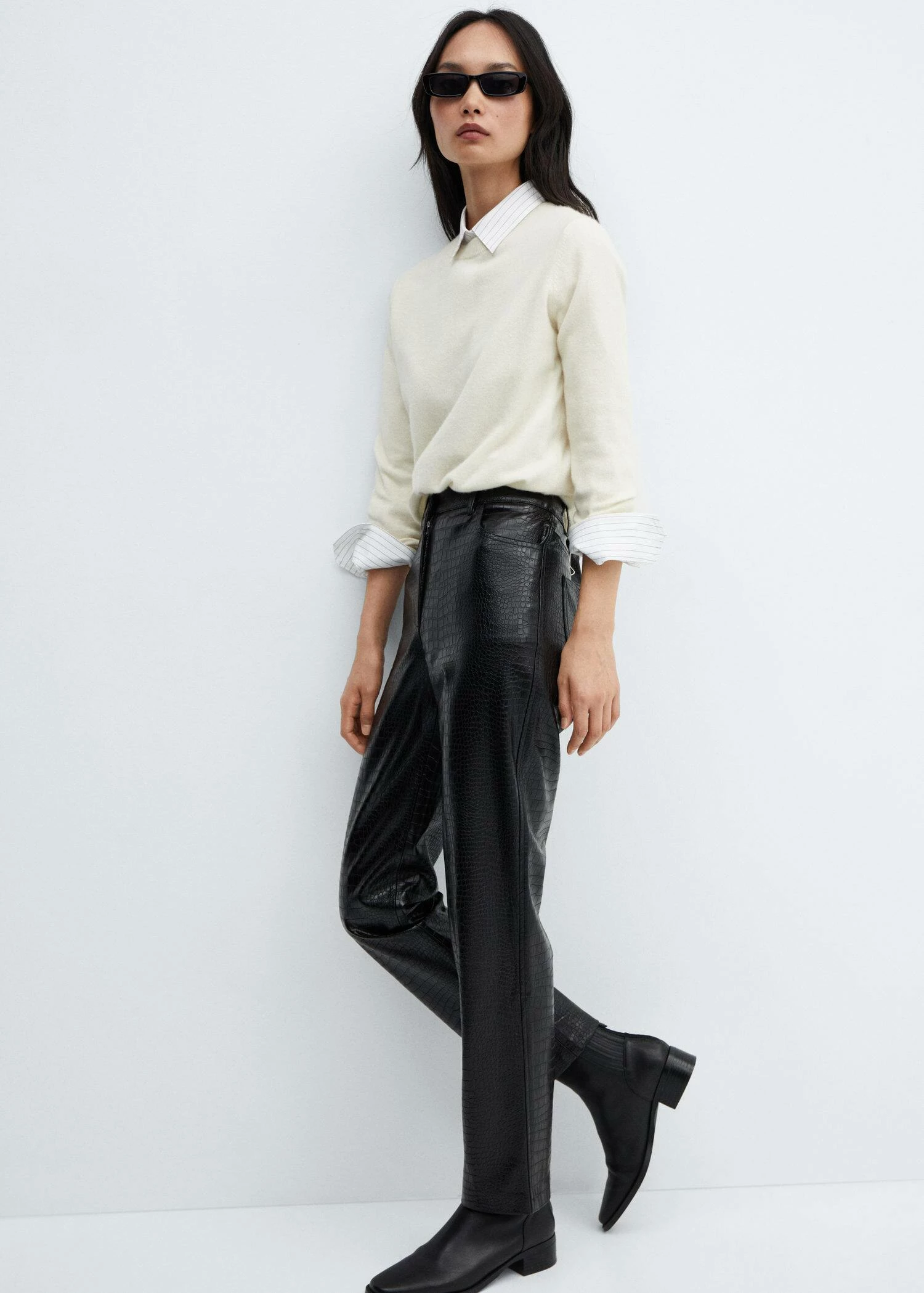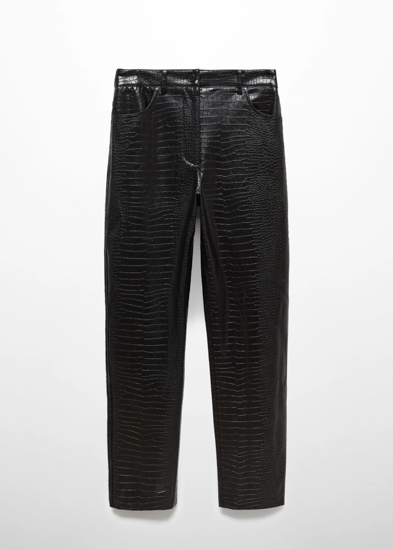 effet peau de crocodile, droit, taille normale, deux poches laterales, deux poches plaquees a l’arriere, fermeture eclair avec bouton, passants pour la ceinture, doublure, disponible plusComposition: 100% viscose. Doublure: 52% polyester,48% viscose. RevĂŞtement: 100% polyurethane