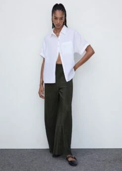 tissu satine, tissu fluide, design plisse, coupe droite, taille haute, fermeture eclair laterale, nœud amovible a la taille, total lookComposition: 100% polyester
