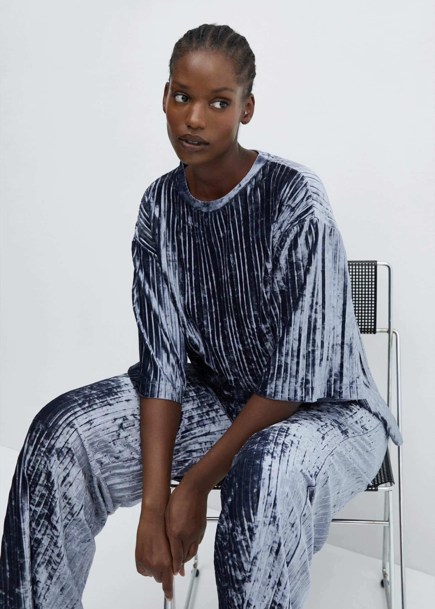 tissu en velours, coupe longue, coupe droite, design plisse, taille normale, taille elastique, sans fermeture, total look, disponible plus, collection fetes et ceremoniesComposition: 93% polyester,7% elasthanne
