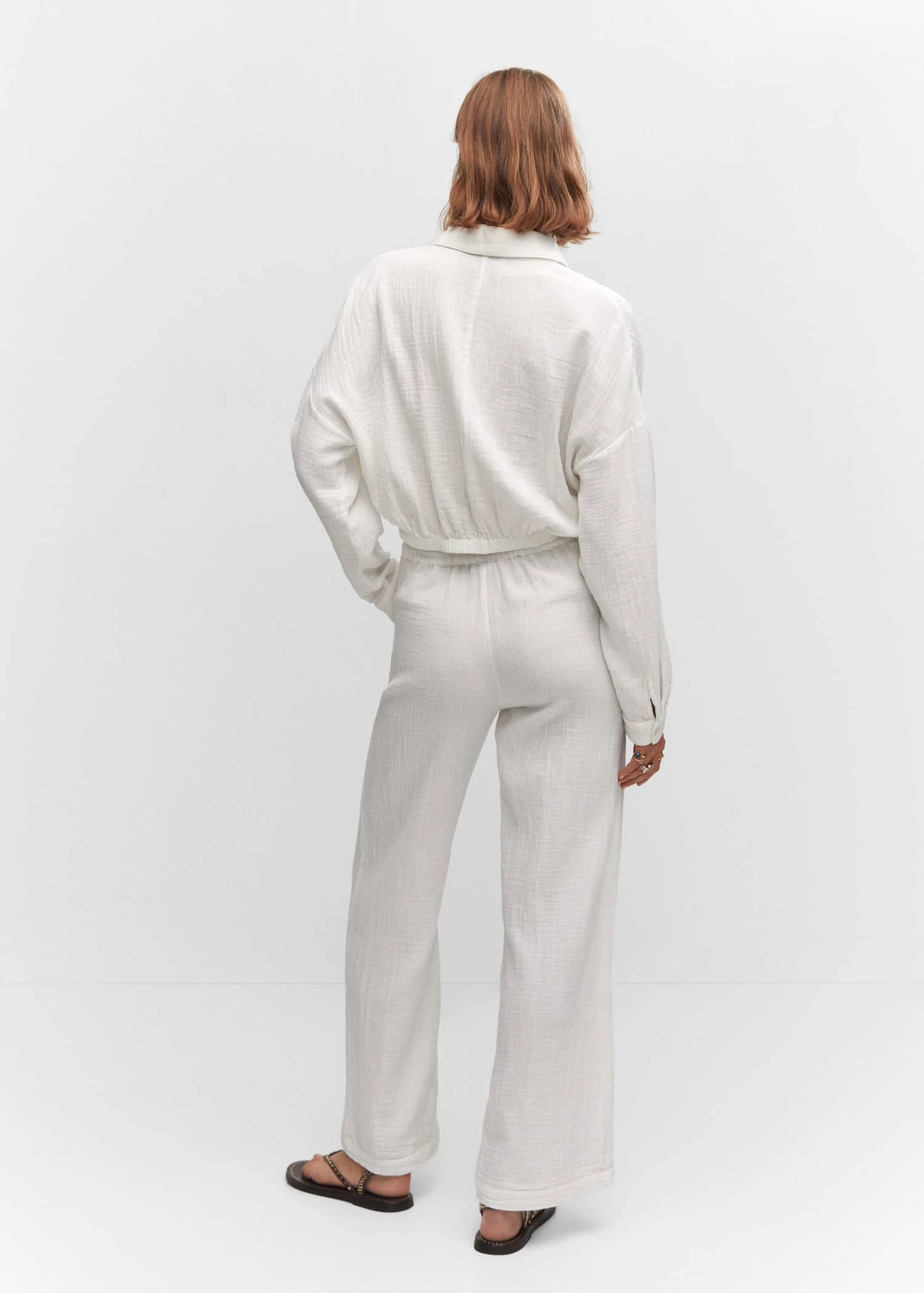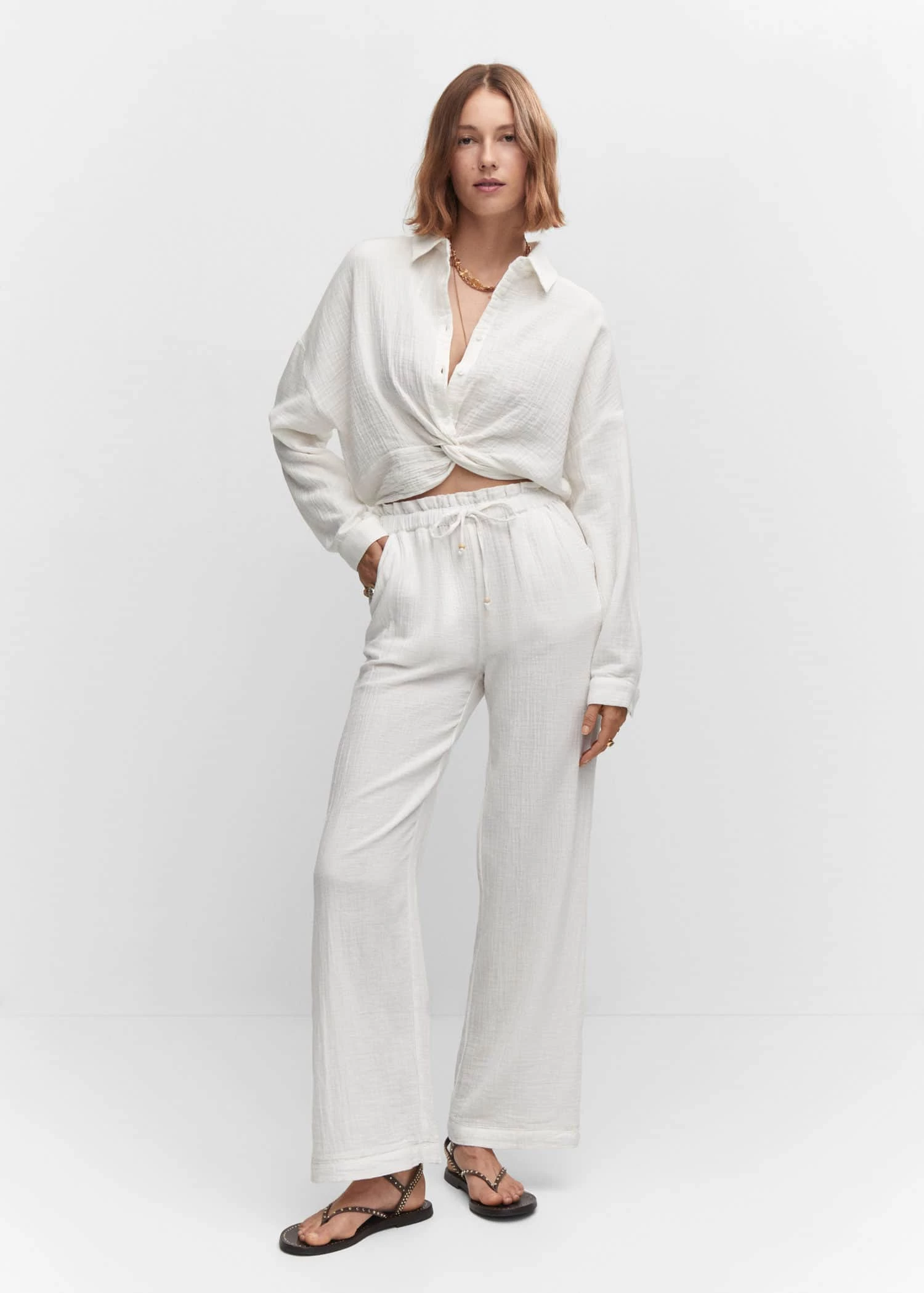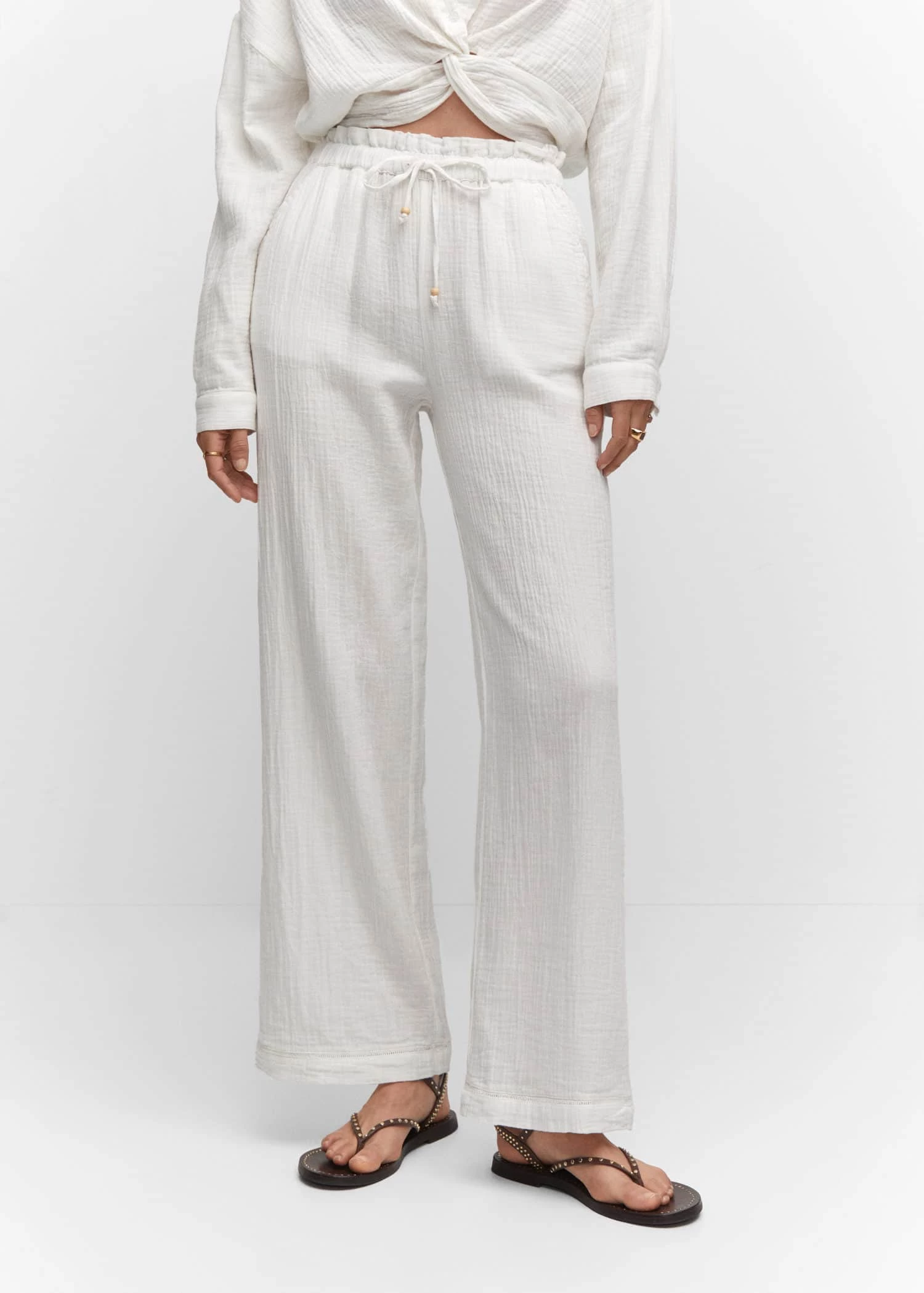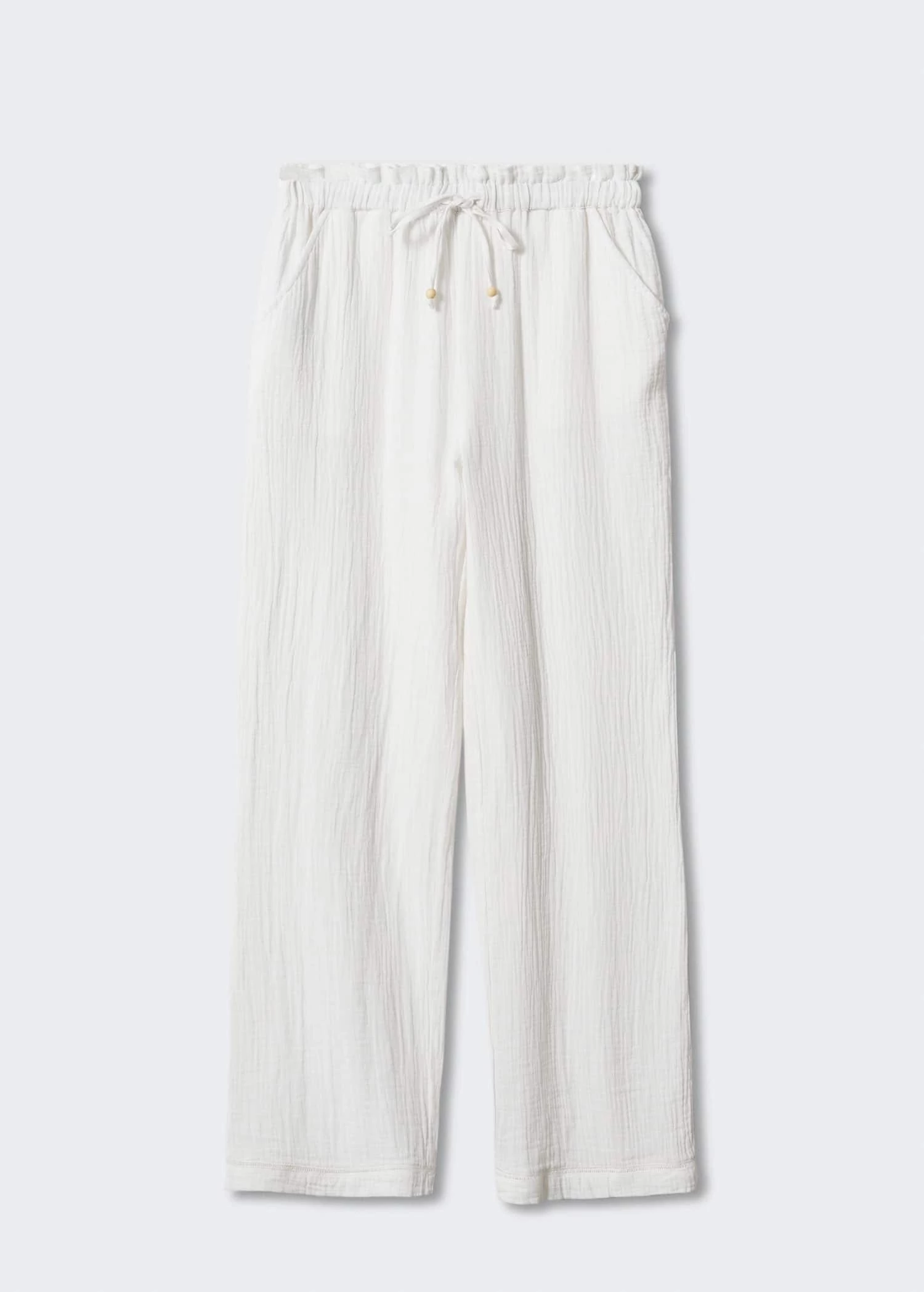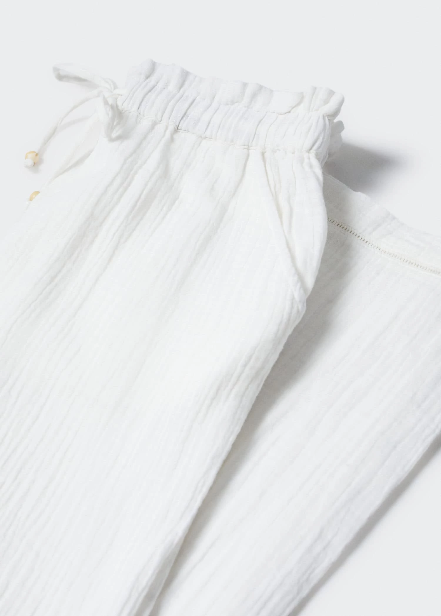 tissu 100 % coton, tissu texture, coupe droite, poches laterales, taille elastiquee, fermeture a nœud reglable, total lookComposition: 100% coton
