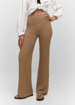 tissu de coton melange, tissu texture, coupe wideleg, coupe longue, taille haute, taille elastiquee, total lookComposition: 61% coton,37% polyamide,2% elasthanne