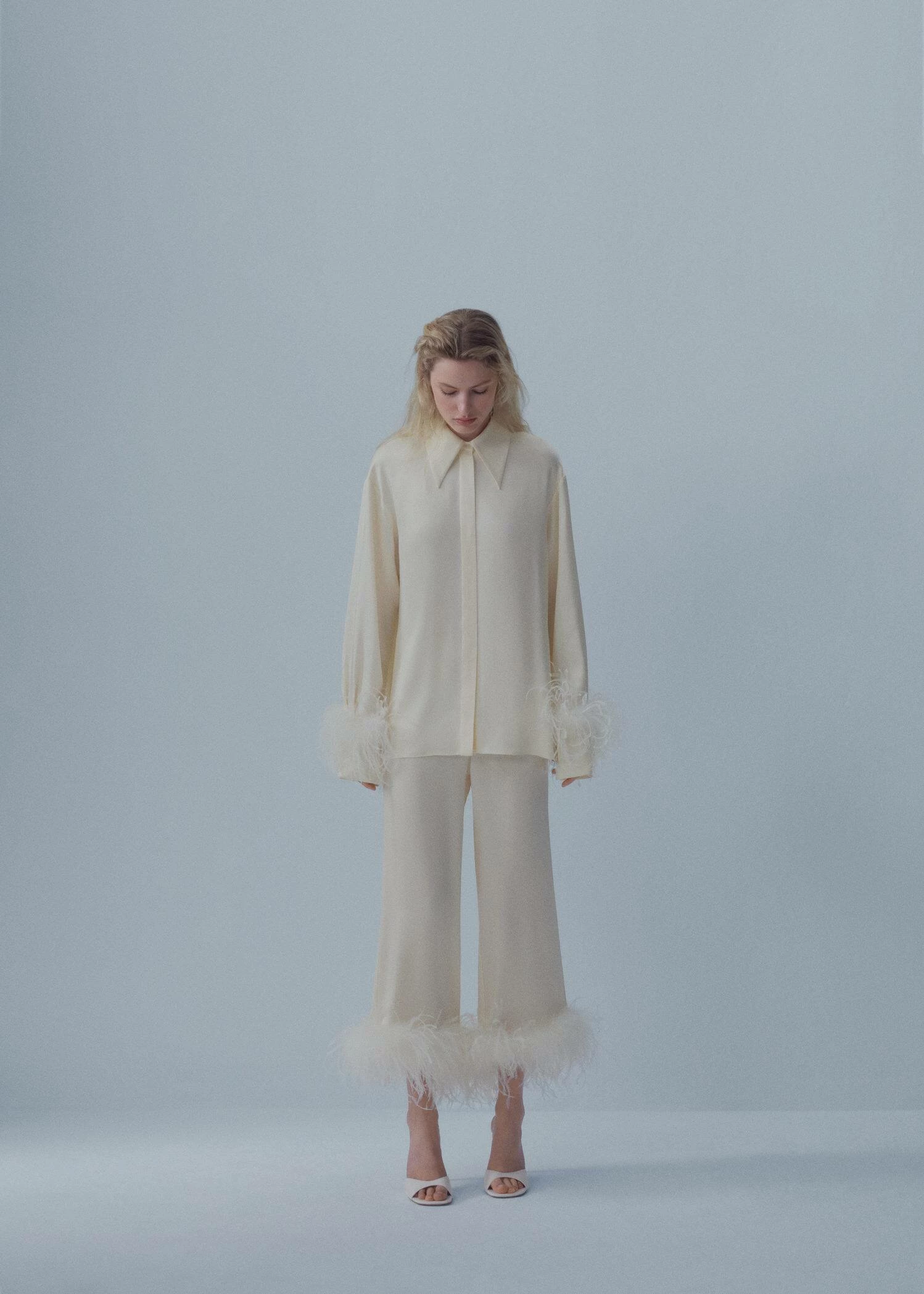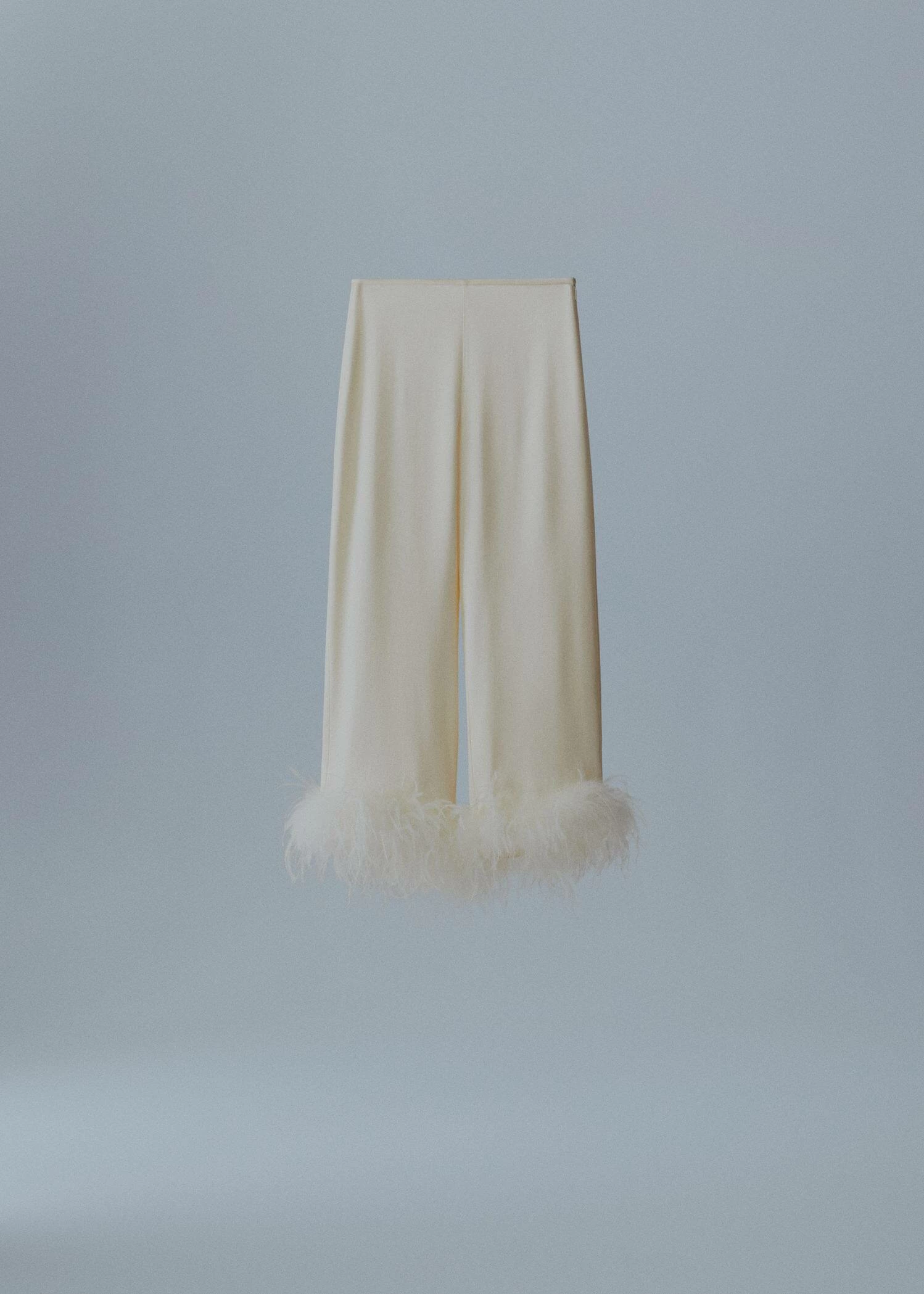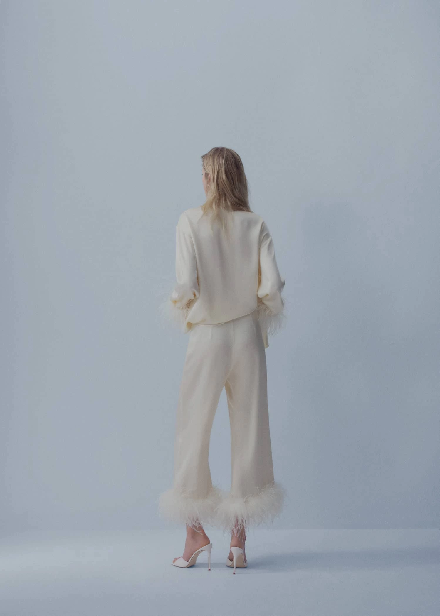 nous reinventons un classique en incorporant un detail de plumes qui apporte de la sophistication, mais egalement une touche amusante, jeune et originale. ce vetement a ete fabrique au maroc avec des tissus italiens qui lui conferent une qualite superieure., tissu fluide avec finition satinee, motif palazzo, style crop, taille haute, detail de plumes, fermeture eclair a l’arriere, tissus fabriques en italie, fabrique au maroc, short denim fleurs, collection fetes et ceremonies, capsule : une collection de vetements en edition limitee, fabriques avec les meilleurs tissus et le plus grand soin en matiere de patrons, afin d’obtenir les meilleures finitions. cette collection exclusive est concue pour les evenements et les occasions les plus chics.Composition: 71% acetate,29% viscose