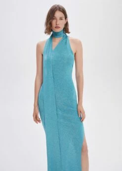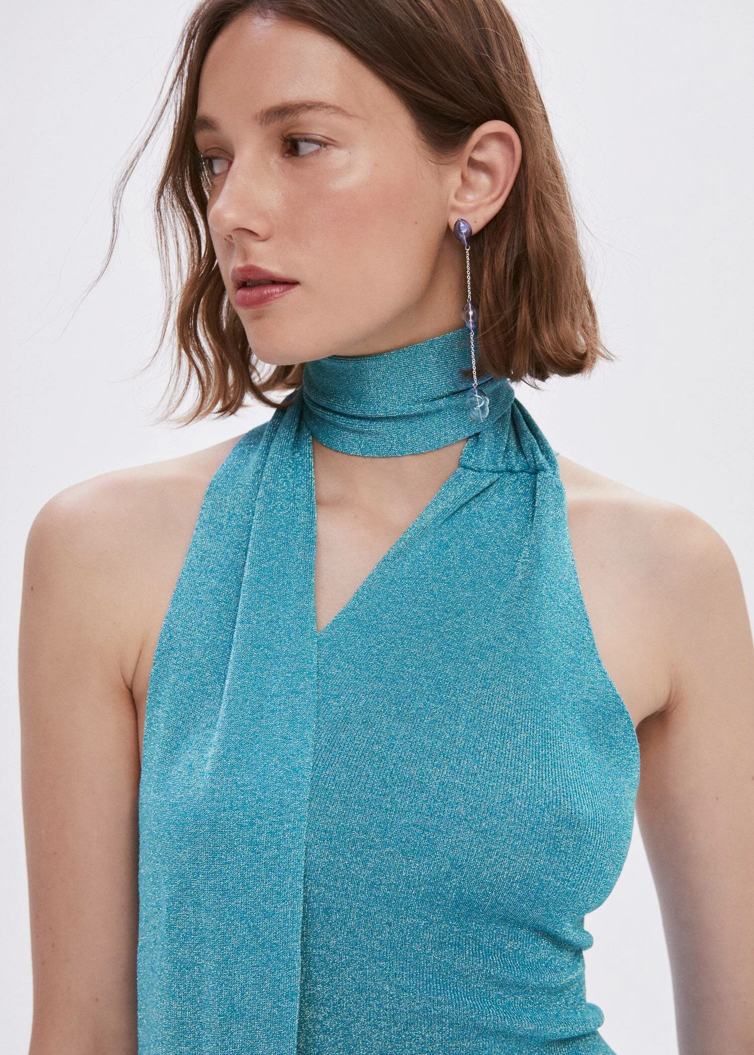 tissu lurex, asymetrique, coupe cintree, coupe longue, col asymetrique, col en forme de choker, bretelles fines, sans fermeture, fente laterale, collection fetes et ceremonies, une selection de pieces raffinees, fabriquees a partir de materiaux de qualite pour creer une garde-robe feminine et contemporaine pour les grandes occasionsComposition: 88% viscose,12% polyester avec revêtement de cuivre