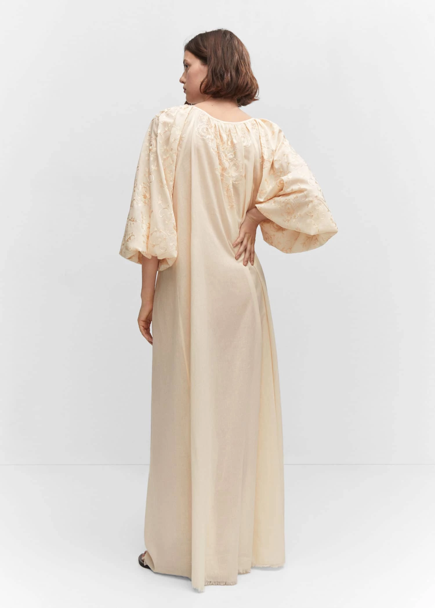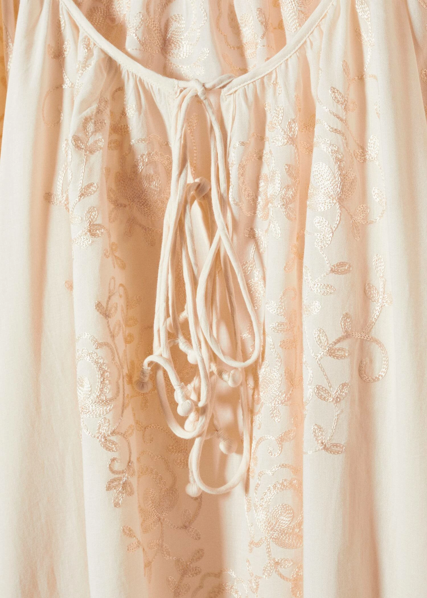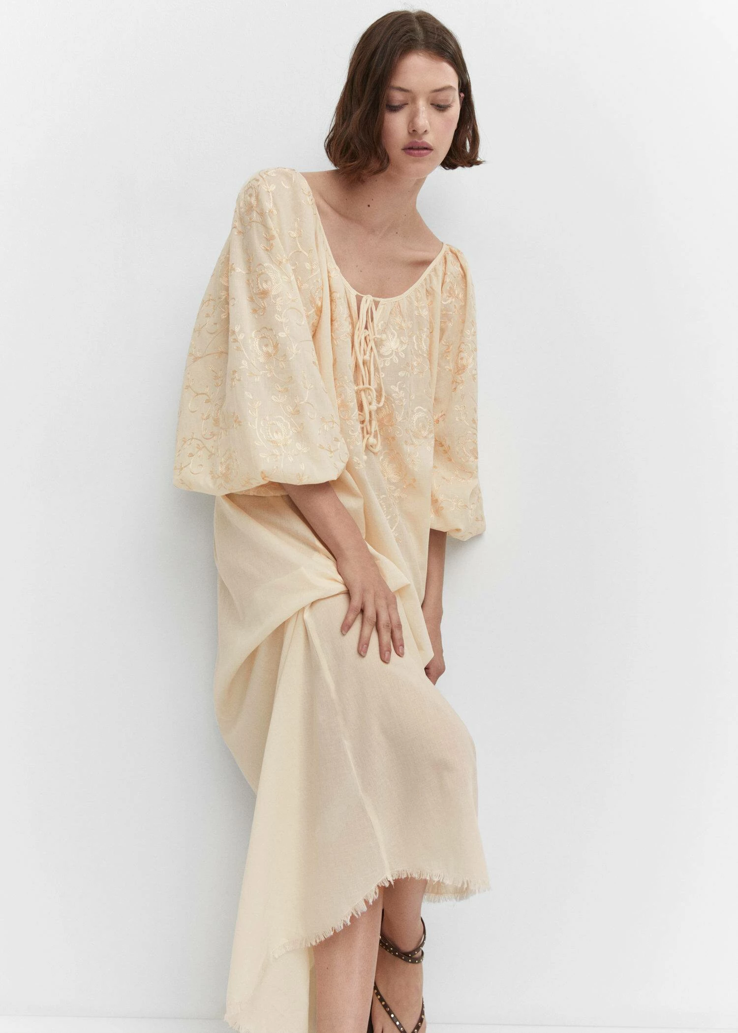 tissu 100 % coton, style oversize, coupe longue, col rond, nœud au col, manches trois-quarts bouffantes, bas effiloche, sans fermeture, details brodesComposition: 100% coton. Broderie: 100% soie