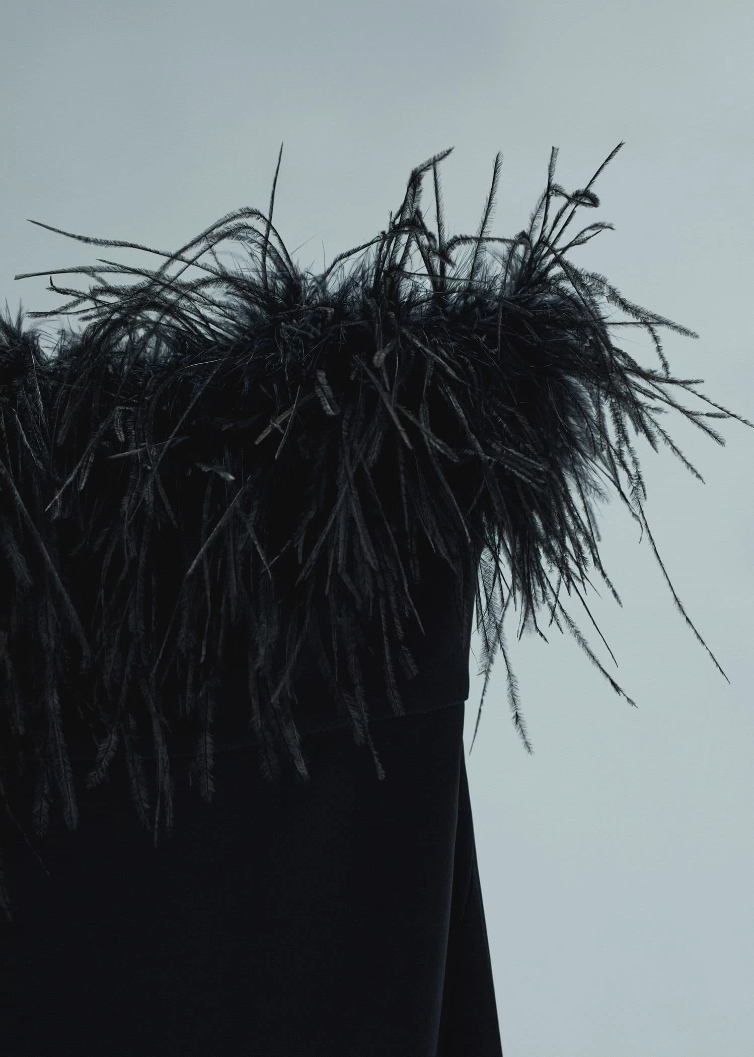 tissu fluide, coupe cintree, coupe longue, bustier, ornement en plumes, sans manches, fermeture eclair a l’arriere, doublure, fabrique au maroc, collection fetes et ceremonies, capsule : une collection de vetements en edition limitee, fabriques avec les meilleurs tissus et le plus grand soin en matiere de patrons, afin d’obtenir les meilleures finitions. cette collection exclusive est concue pour les evenements et les occasions les plus chics.Composition: 97% viscose,3% elasthanne. Doublure: 89% polyester,11% elasthanne