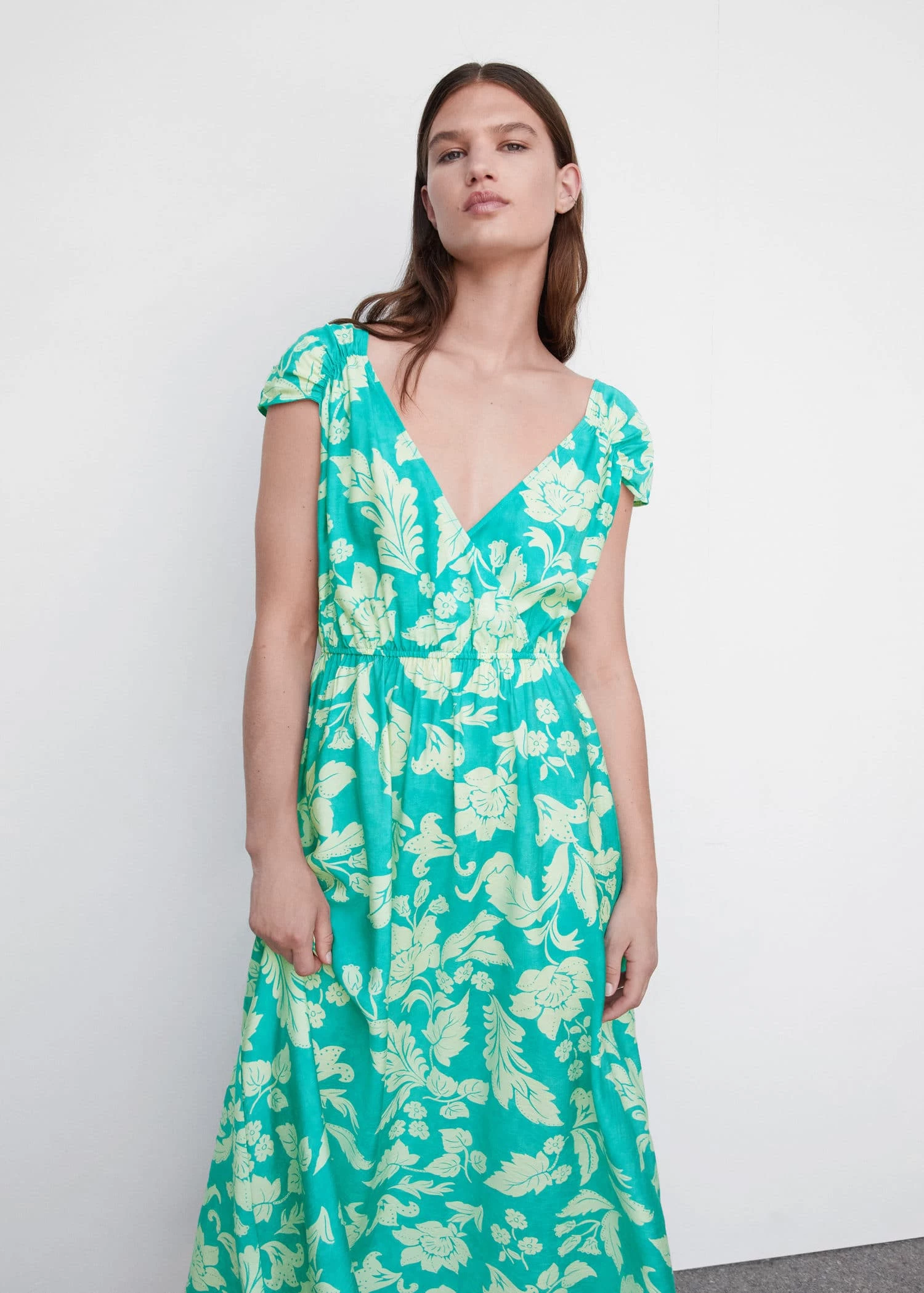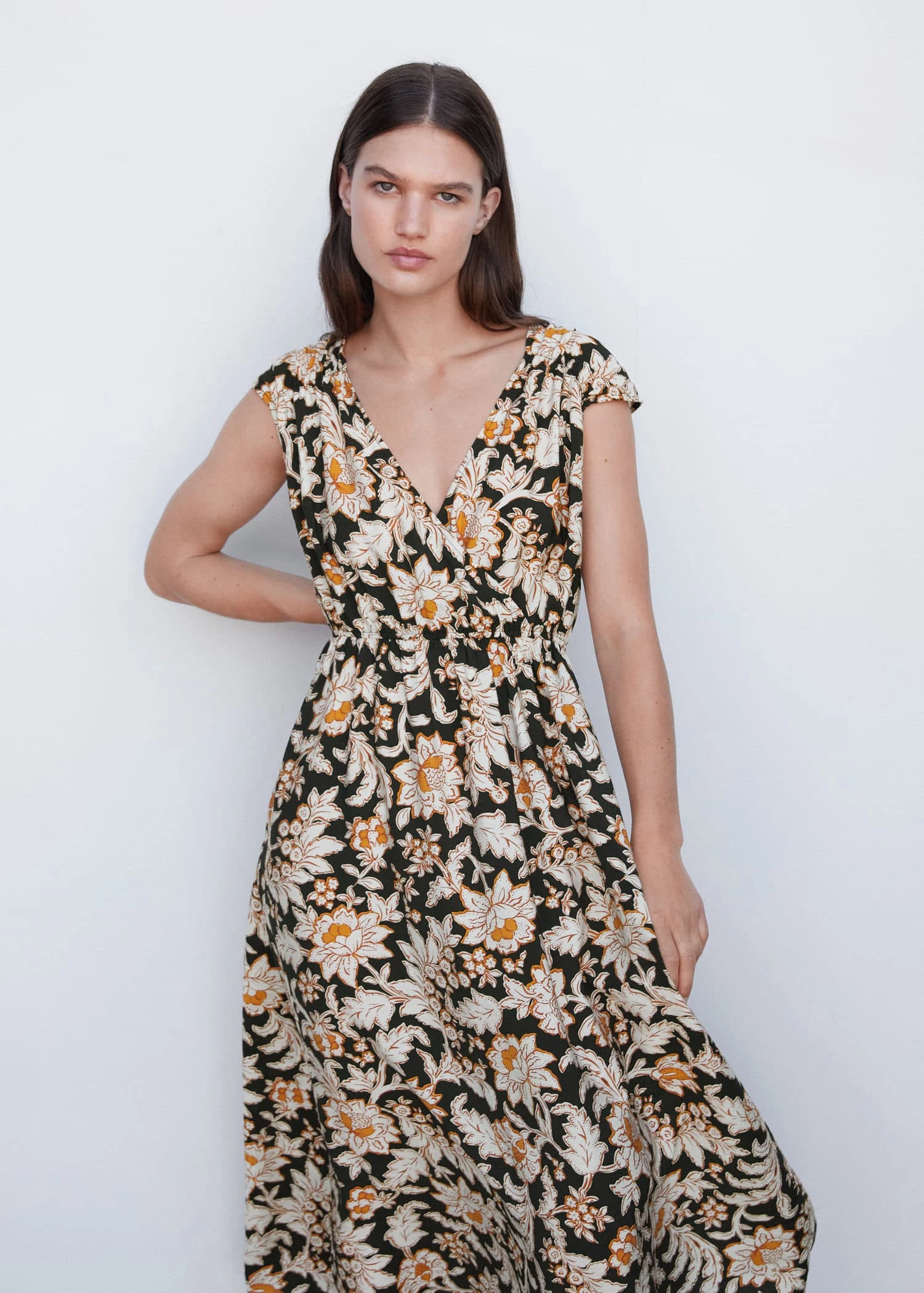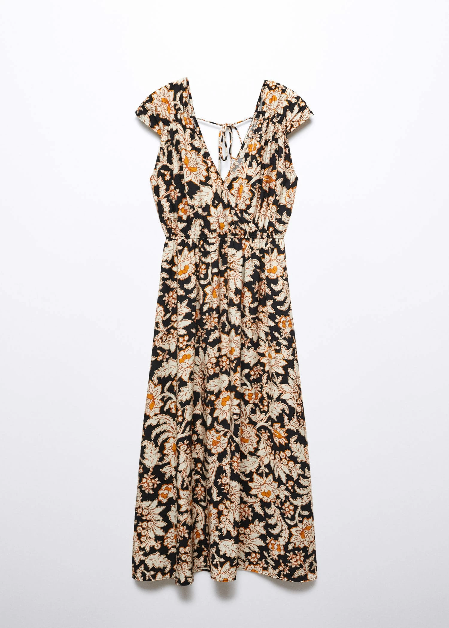 tissu fluide, croise, motif floral, coupe longue, col en v, manches courtes, decollete en v dans le dos, lien a nouer au dos, taille elastiqueeComposition: 84% viscose,16% polyamide