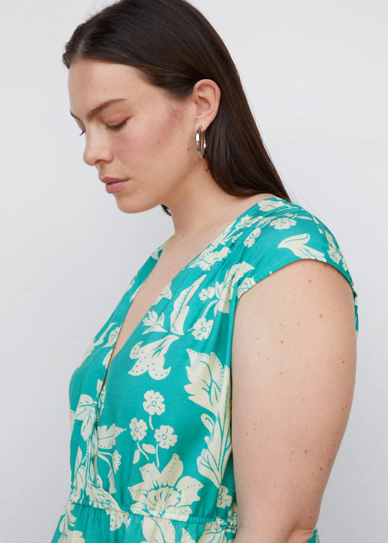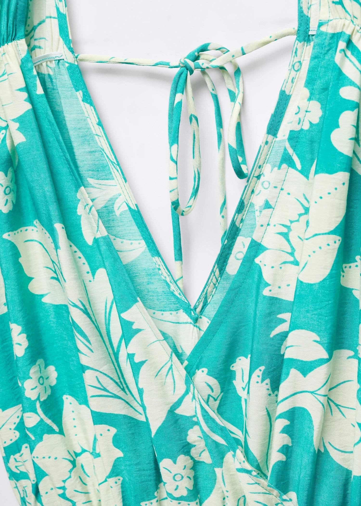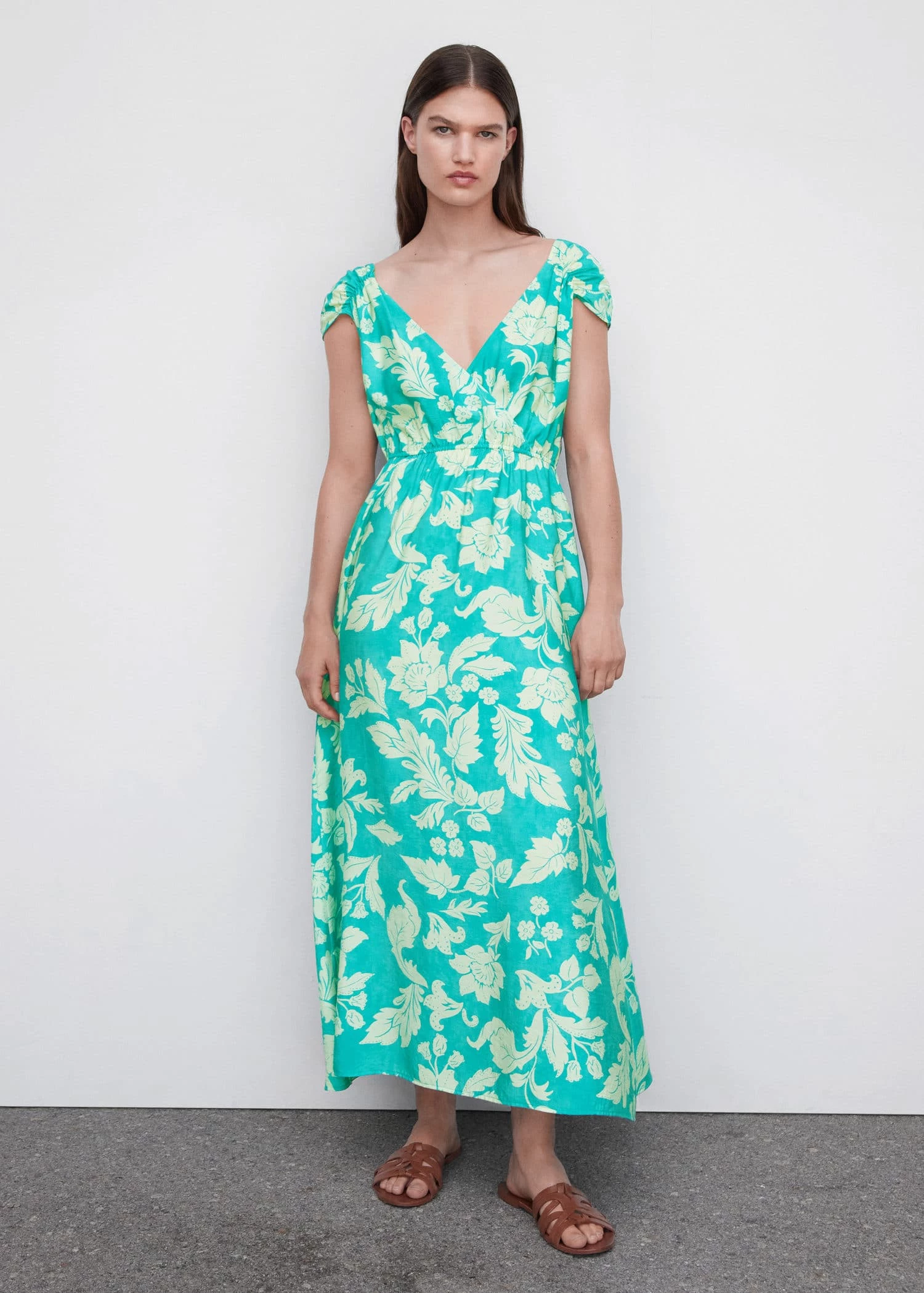 tissu fluide, croise, motif floral, coupe longue, col en v, manches courtes, decollete en v dans le dos, lien a nouer au dos, taille elastiqueeComposition: 84% viscose,16% polyamide