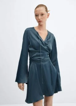 tissu fluide, effet satine, croise, coupe courte, evase, col en v, manches longues cloche, lien a nouer autour du cou, ruban a la taille avec fermeture a nœudComposition: 100% viscose