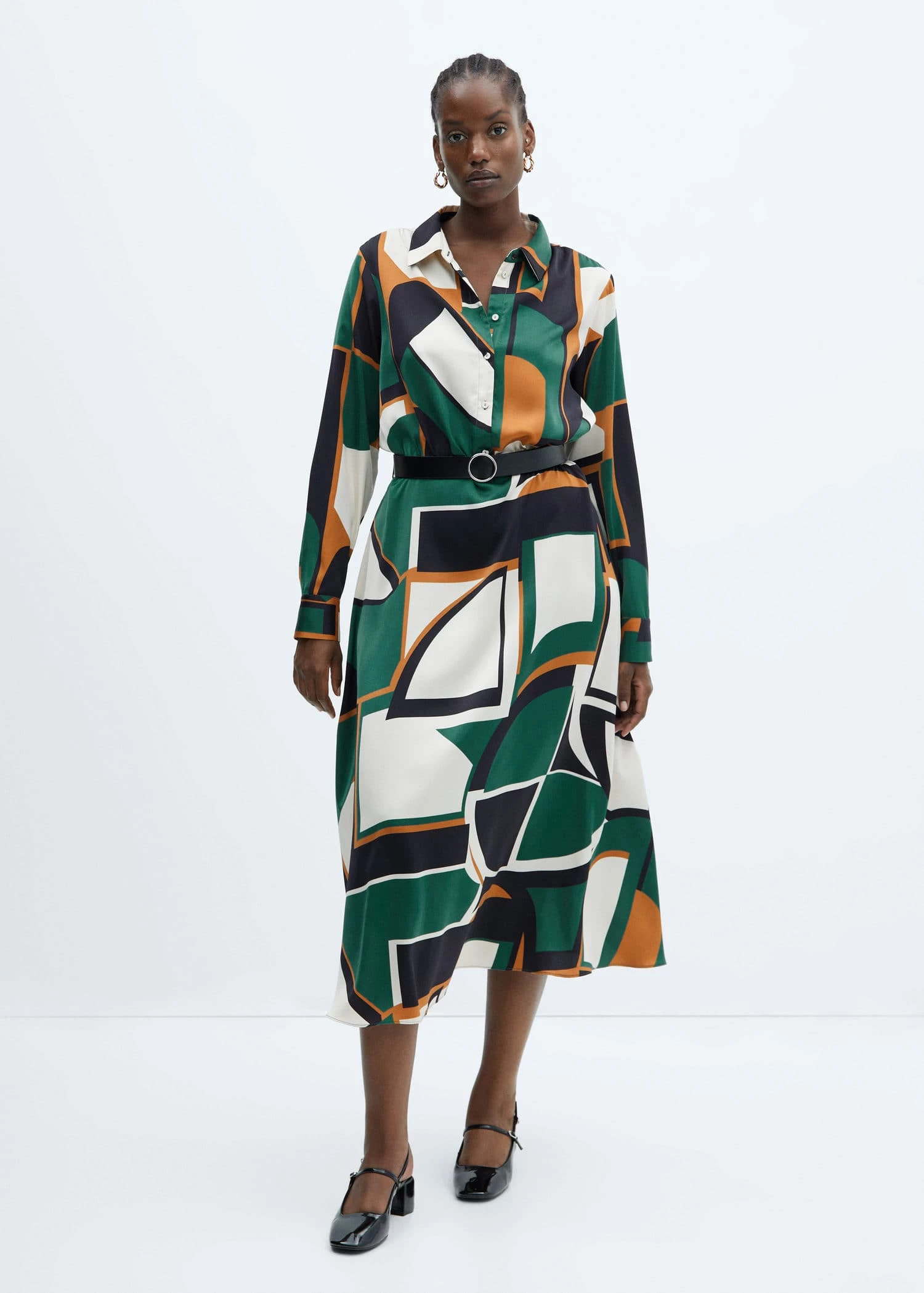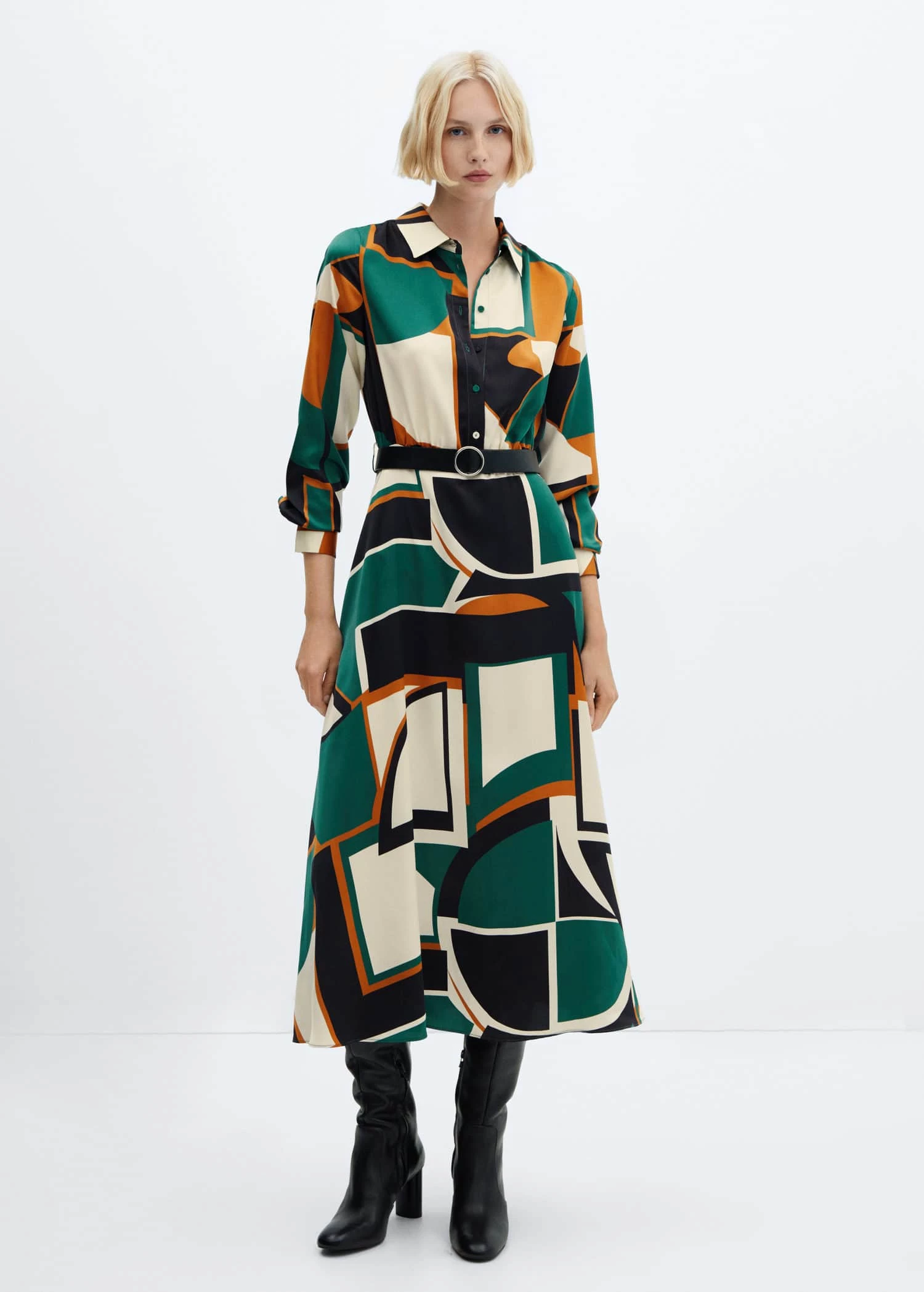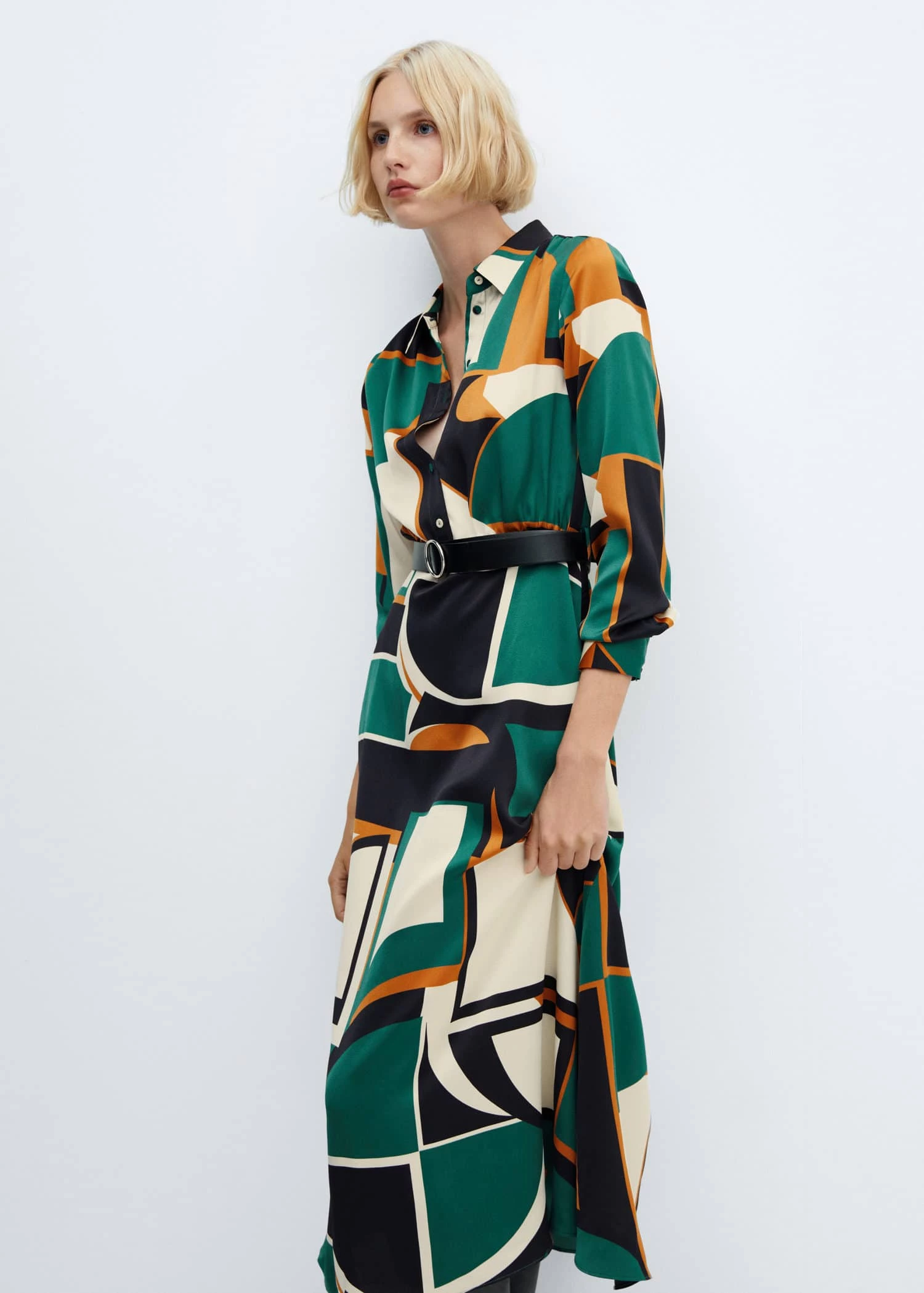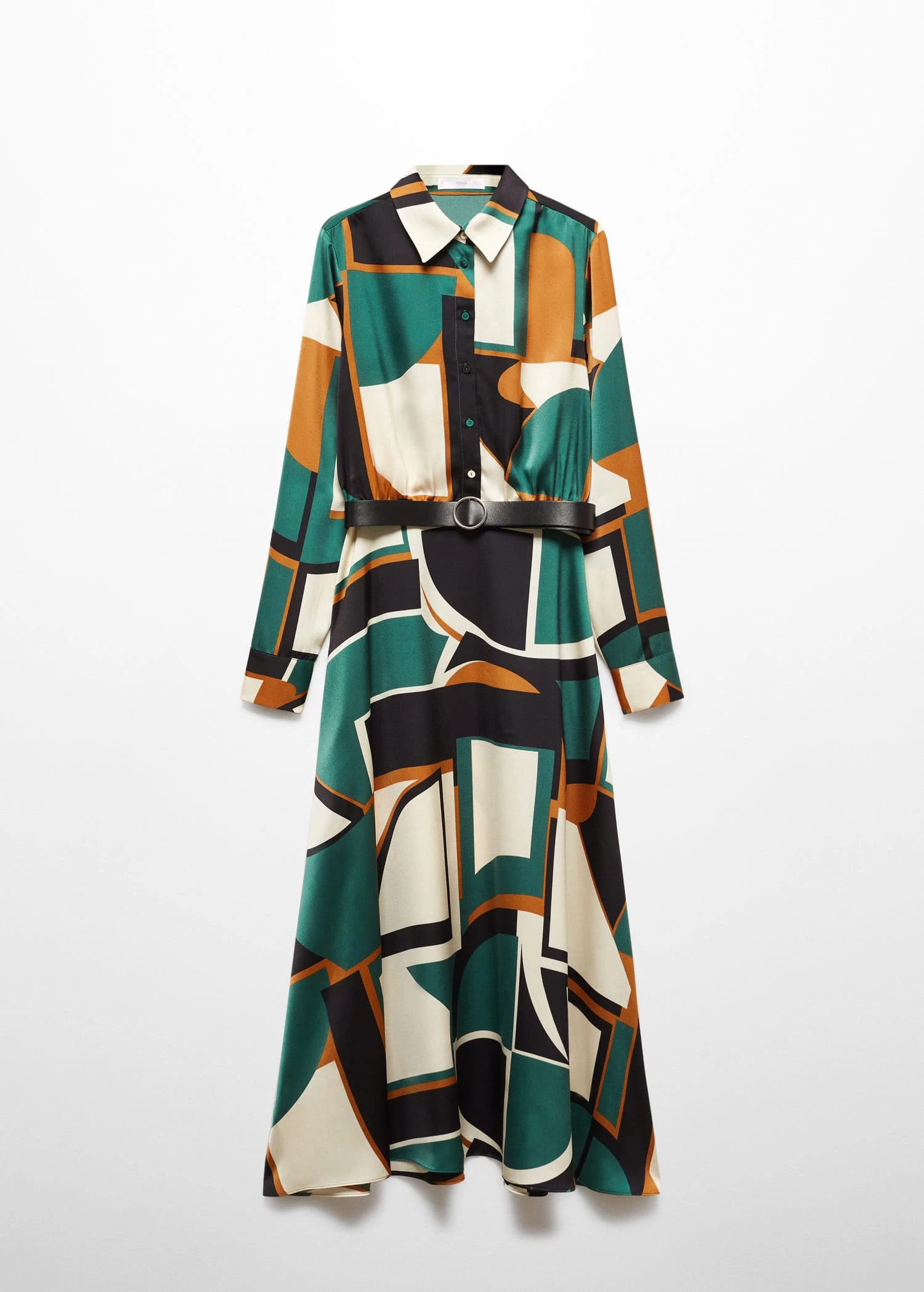 tissu fluide, evase, coupe longue, motif geometrique, col chemise, manches longues avec poignets boutonnes, fermeture a bouton sur le devant, ceinture amovible, disponible plusComposition: 100% polyester. Boucle: 95% zinc,4% aluminium,1% cuivre. Ceinture: 100% polyurethane