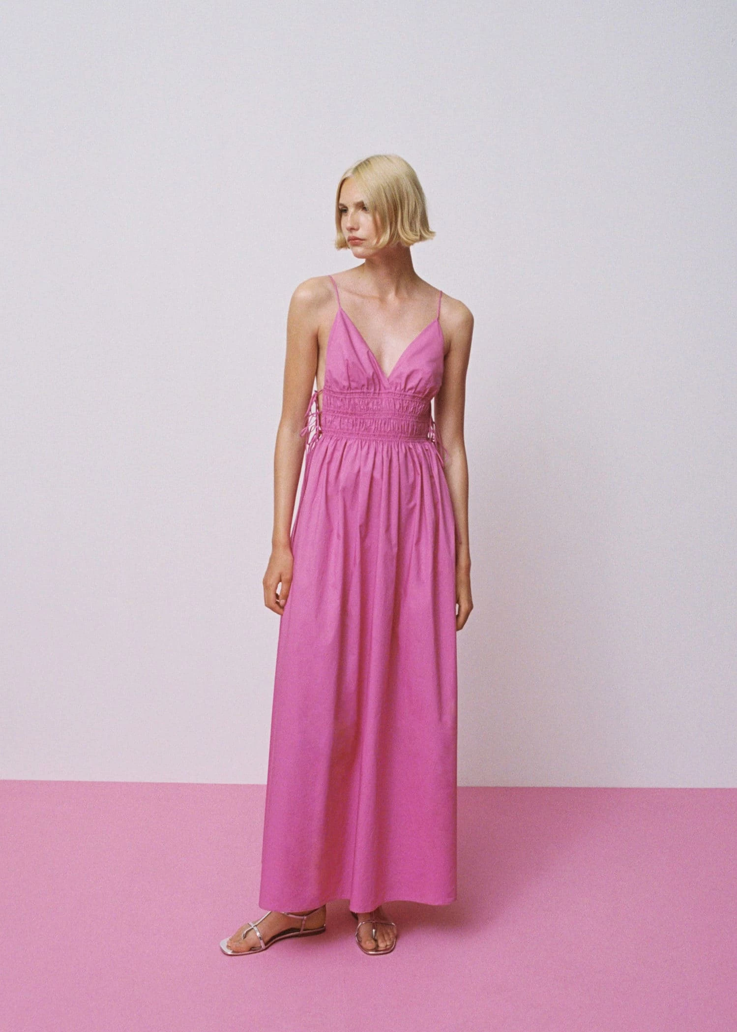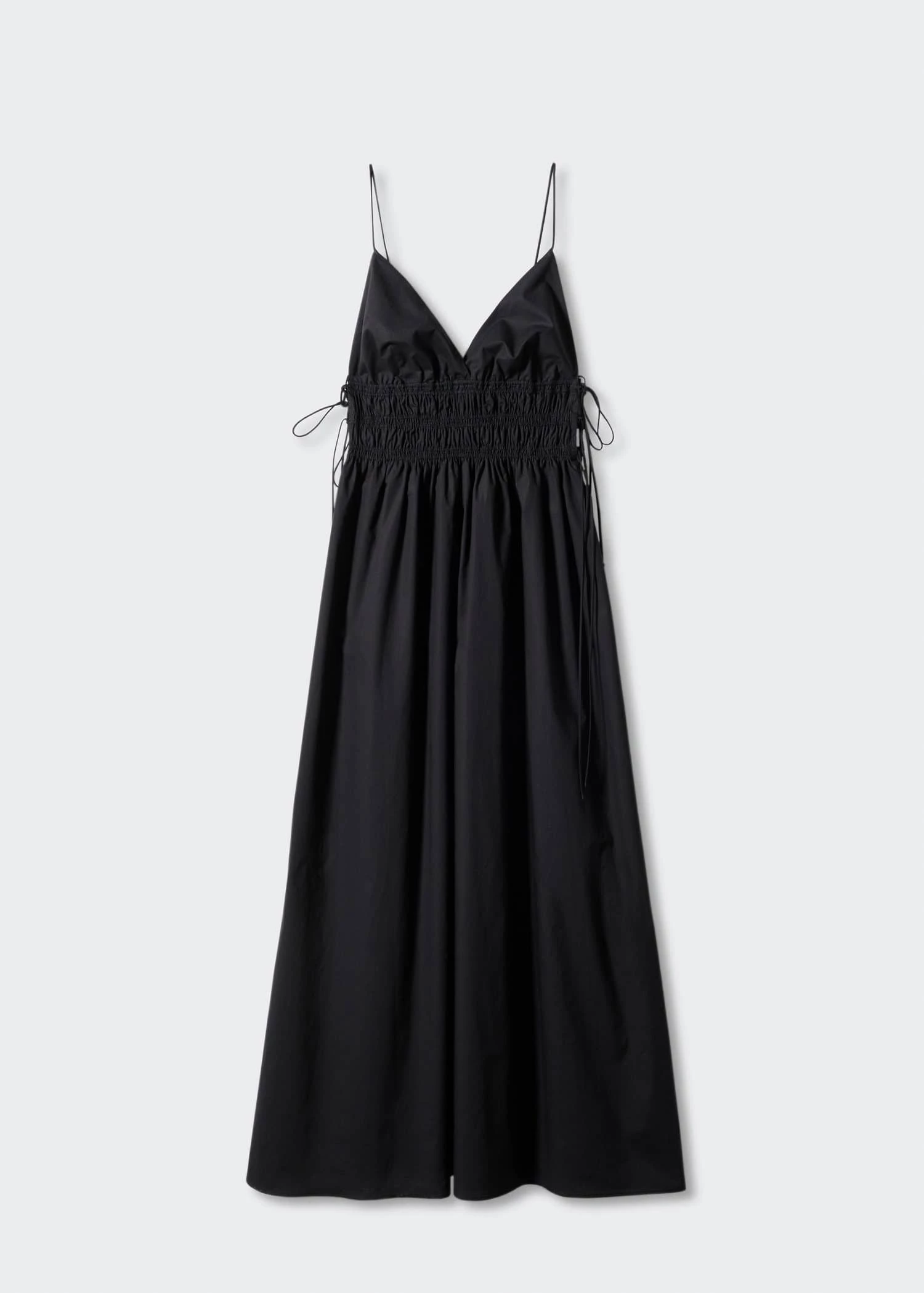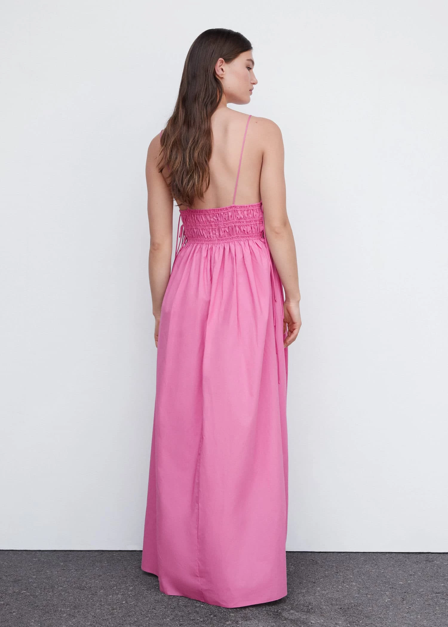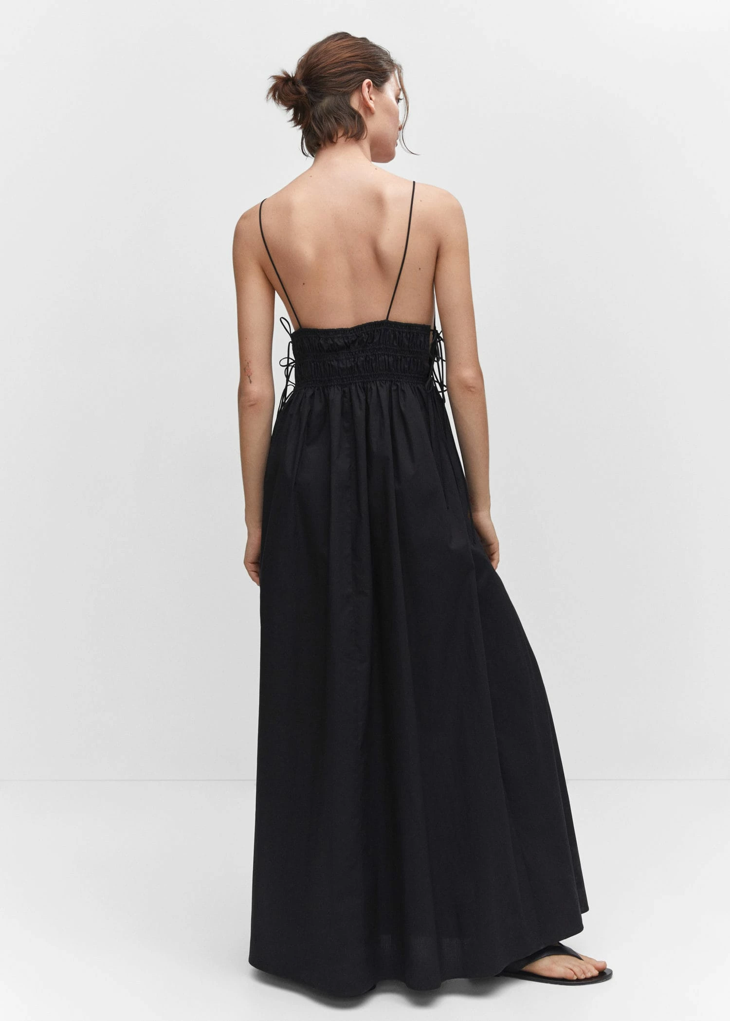 tissu 100 % coton, tissu fluide, coupe longue, evase, col en v, bretelles fines, fermeture a nœuds sur les cotes, detail fronce sur le devant, detail fronce a l’arriere, collection fetes et ceremoniesComposition: 100% coton