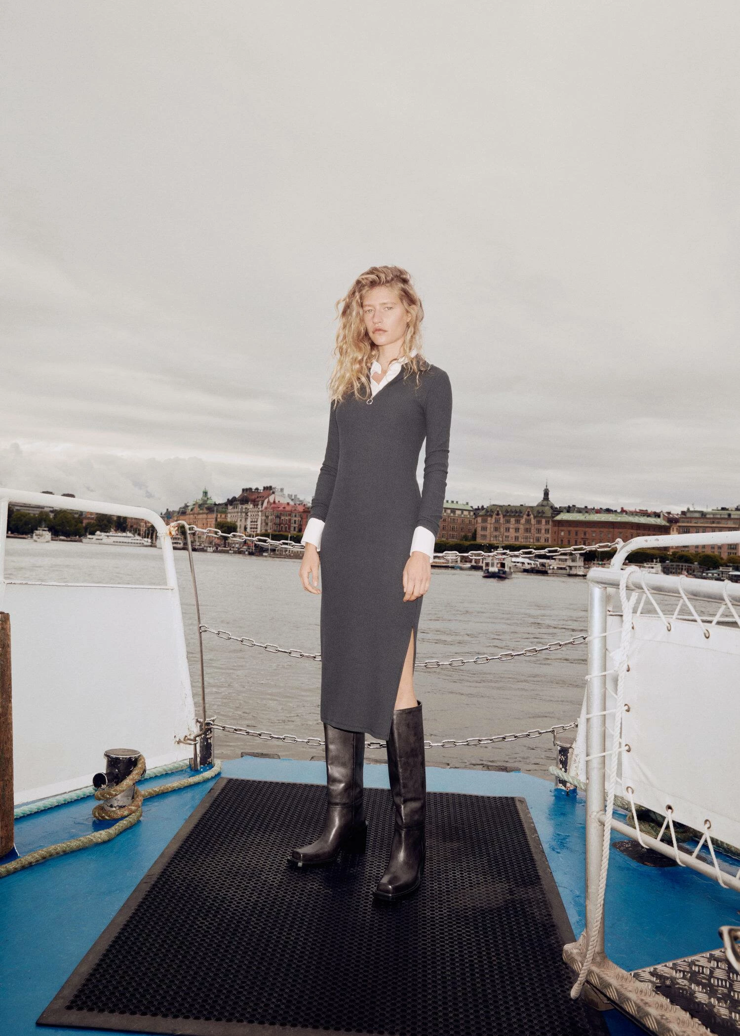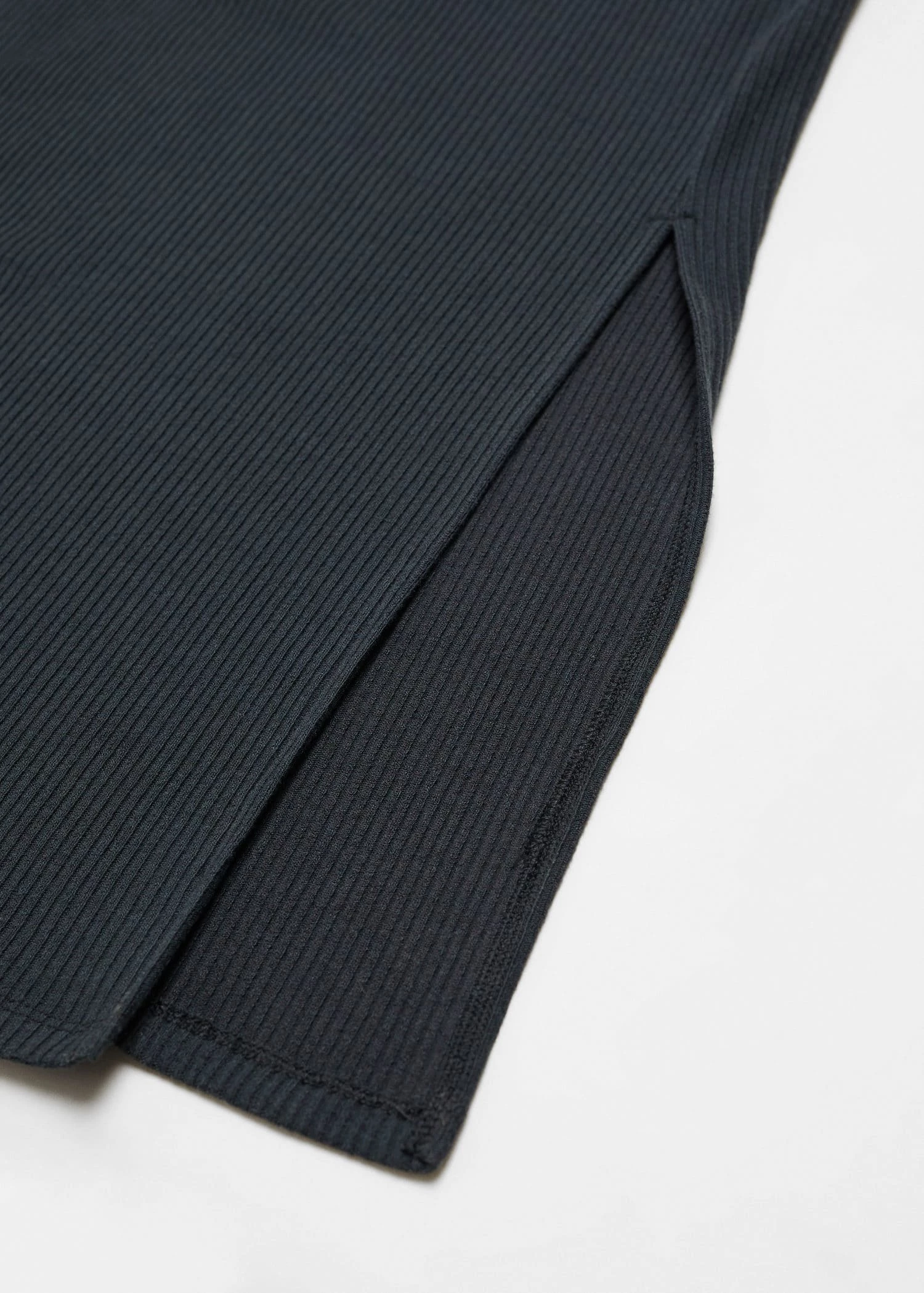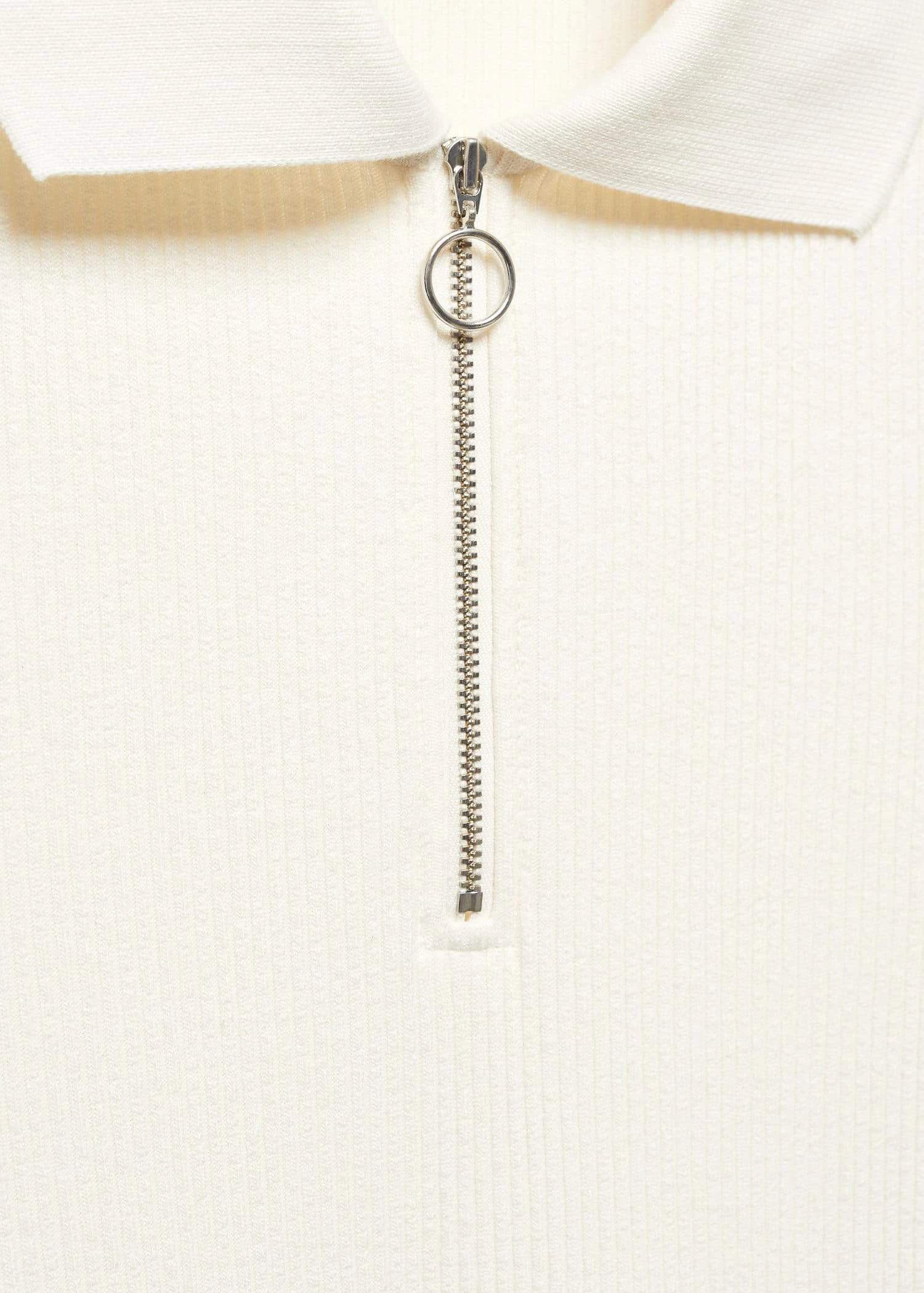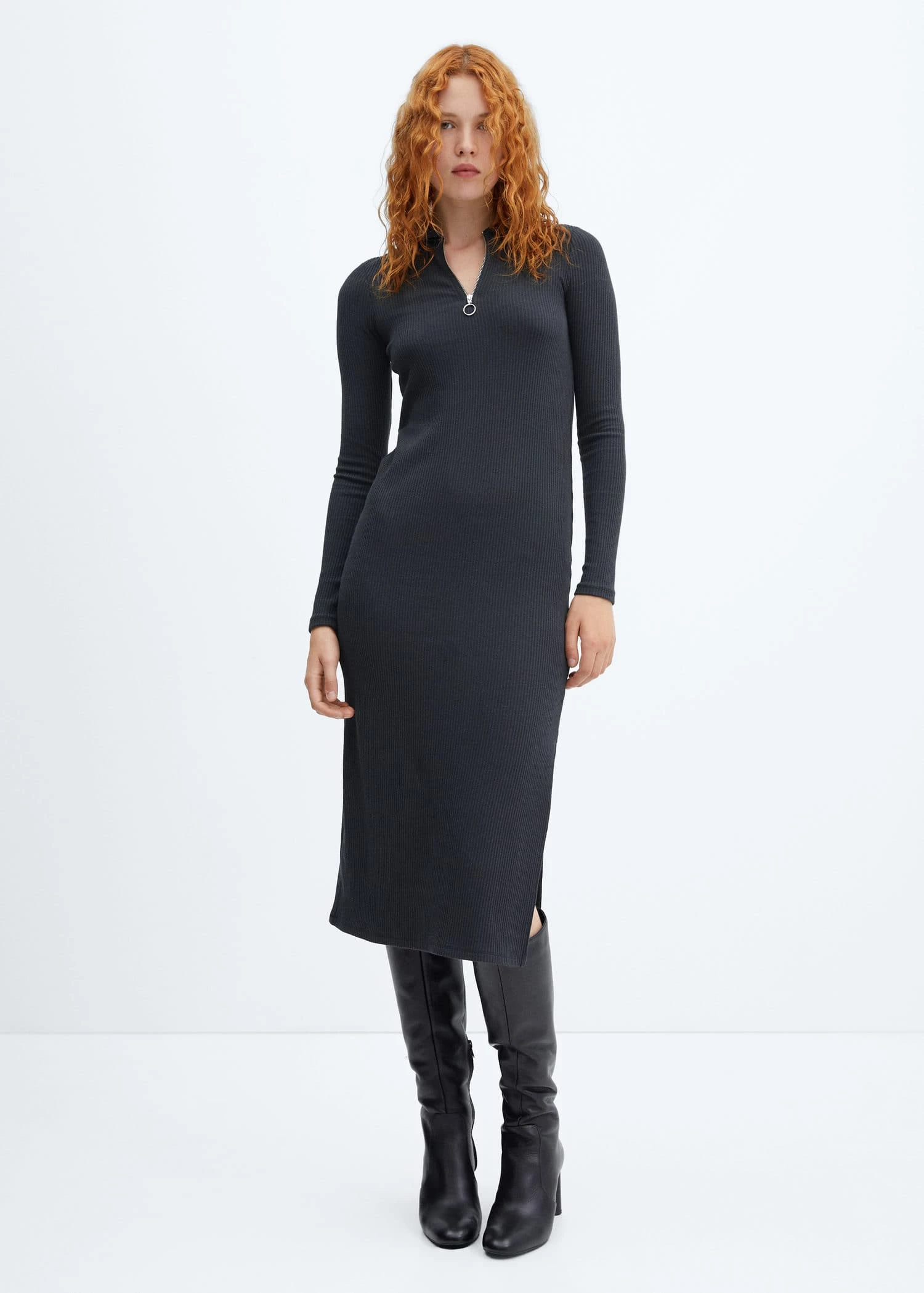 tissu en maille fine, coupe midi, ajuste, cotele, col polo a fermeture eclair, manches longues, sans fermeture, fente lateraleComposition: 52% polyester,44% coton,4% elasthanne. Col: 100% coton. Lisiere: 97% viscose,3% elasthanne