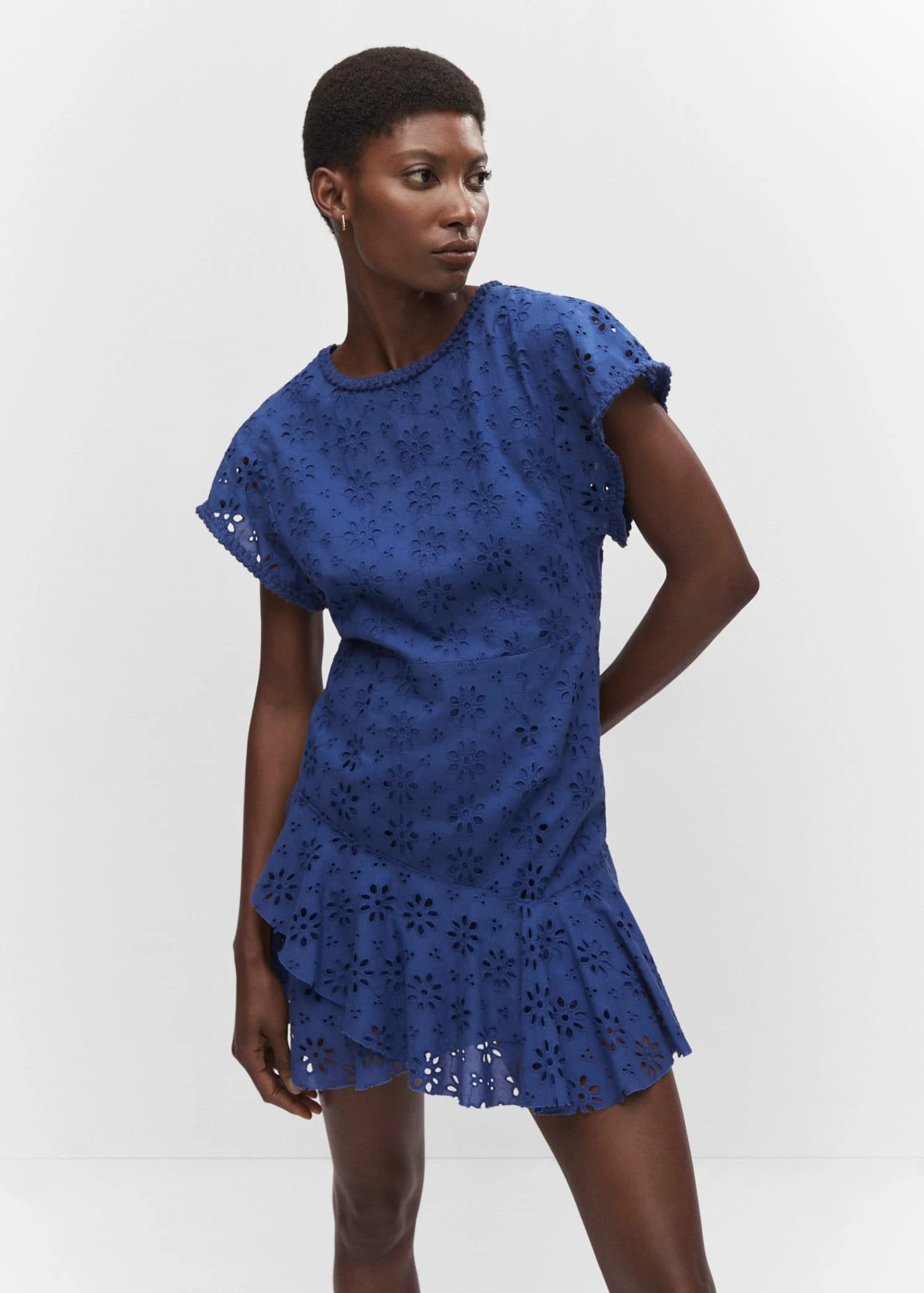 tissu 100 % coton, coupe droite, coupe courte, col rond, manches courtes, bas asymetrique, bas evase, fermeture eclair a l’arriere, details ajoures, details brodesComposition: 100% coton. Doublure: 100% coton. Broderie: 100% coton
