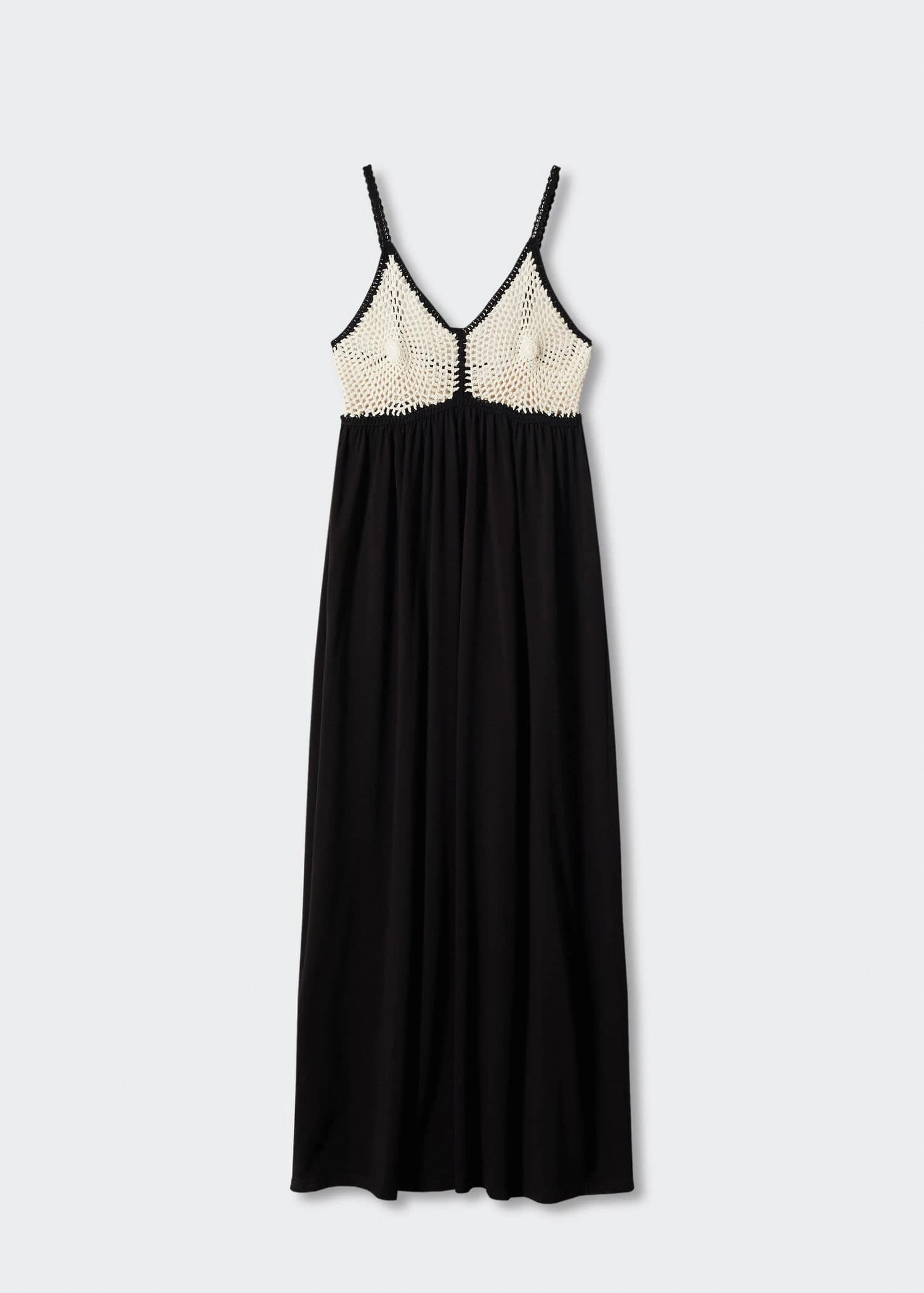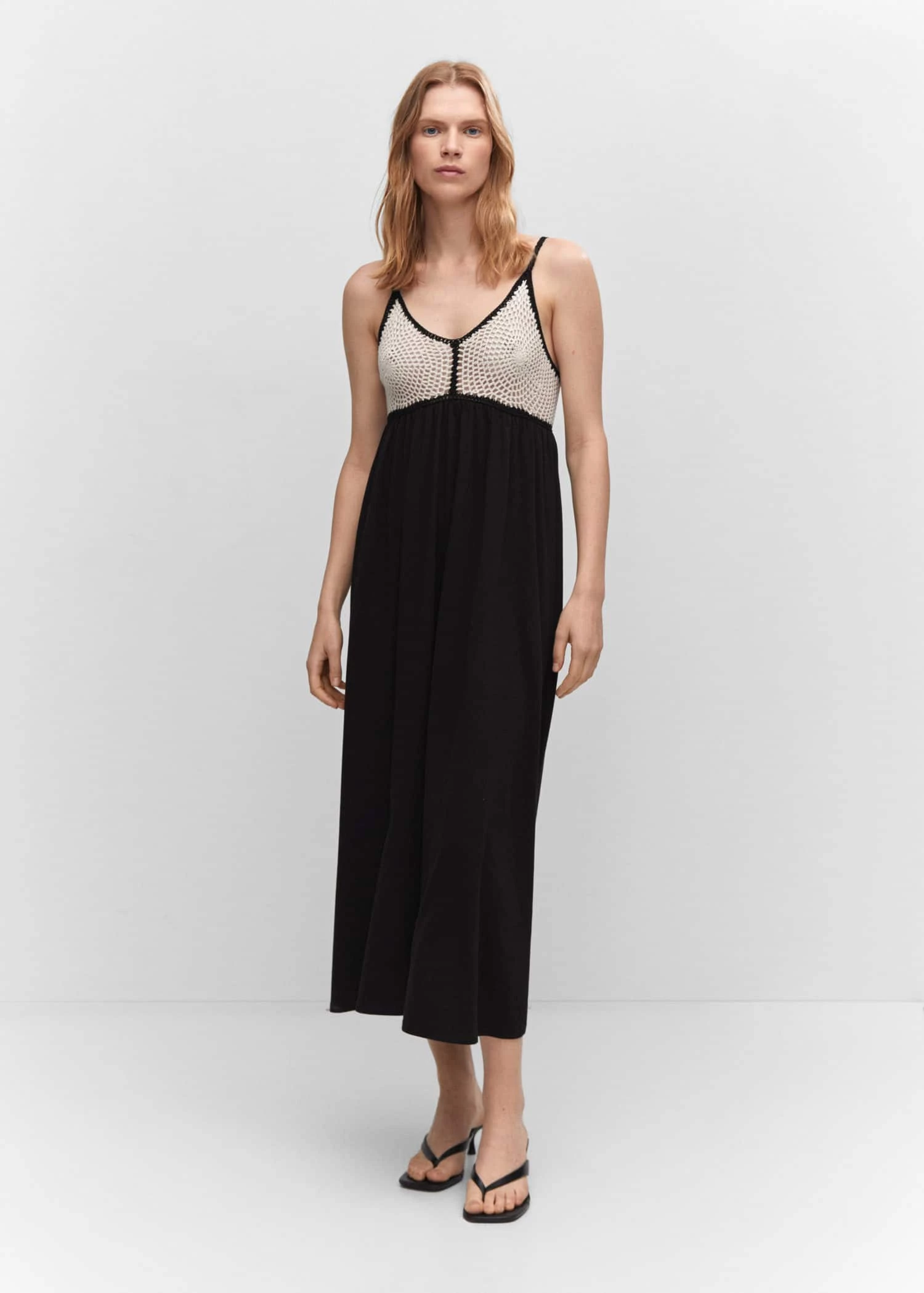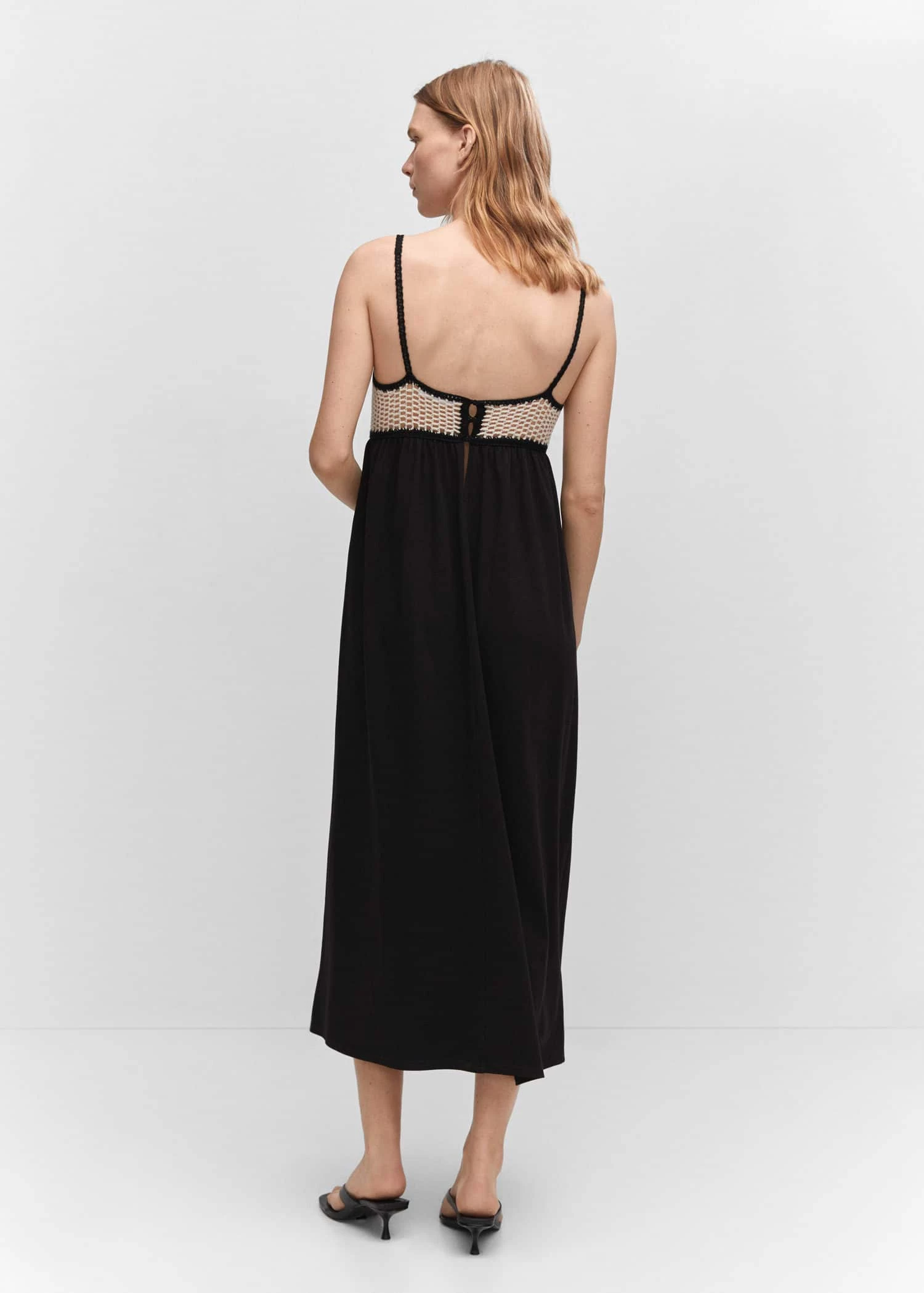 tissu de coton melange, tissu fluide, coupe droite, coupe midi, col echancre, bretelles fines, encolure au dos, bouton de fermeture a l’arriere, detail en crochetComposition: 54% acrylique,46% coton. Partie inferieure: 97% coton,3% elasthanne