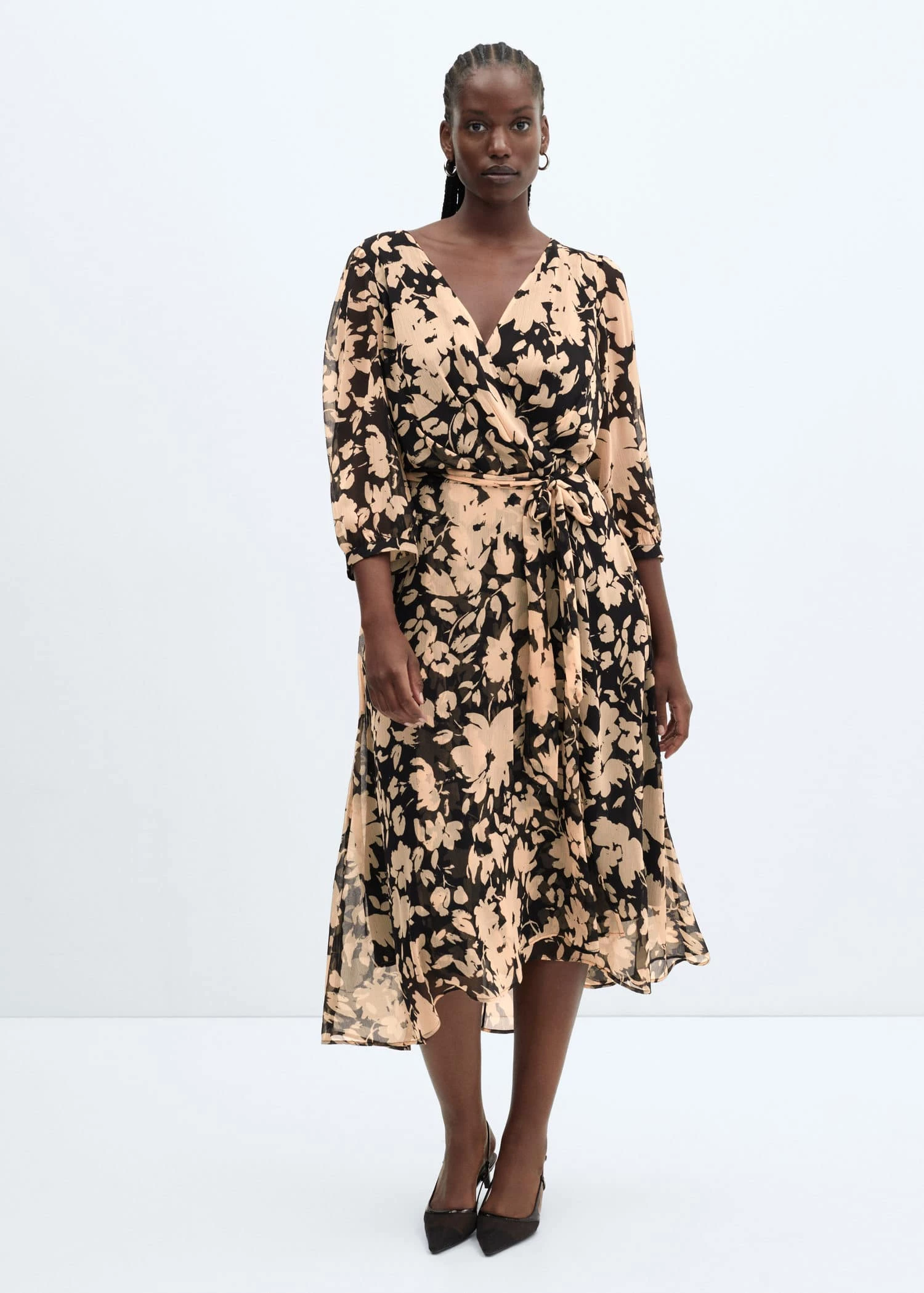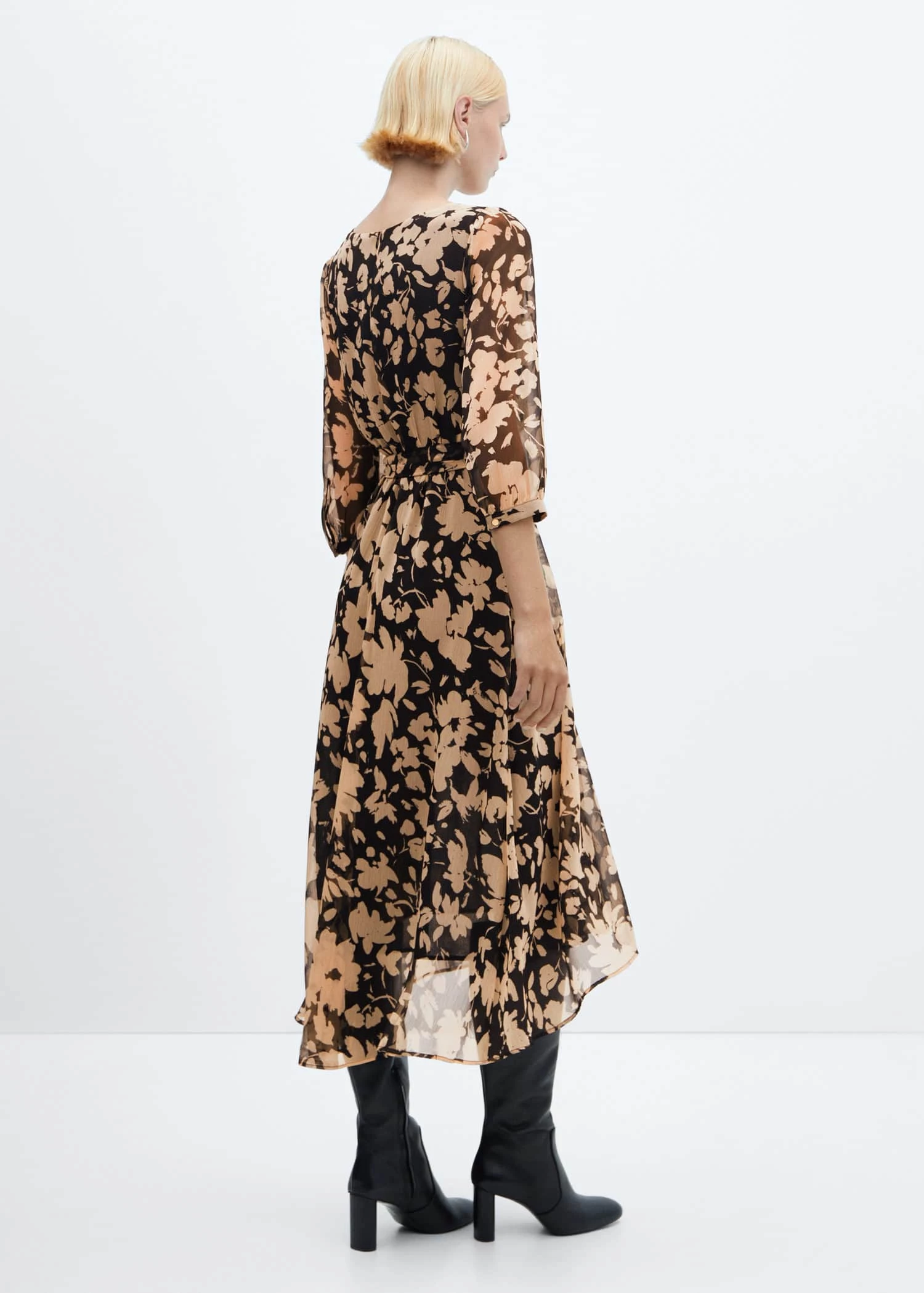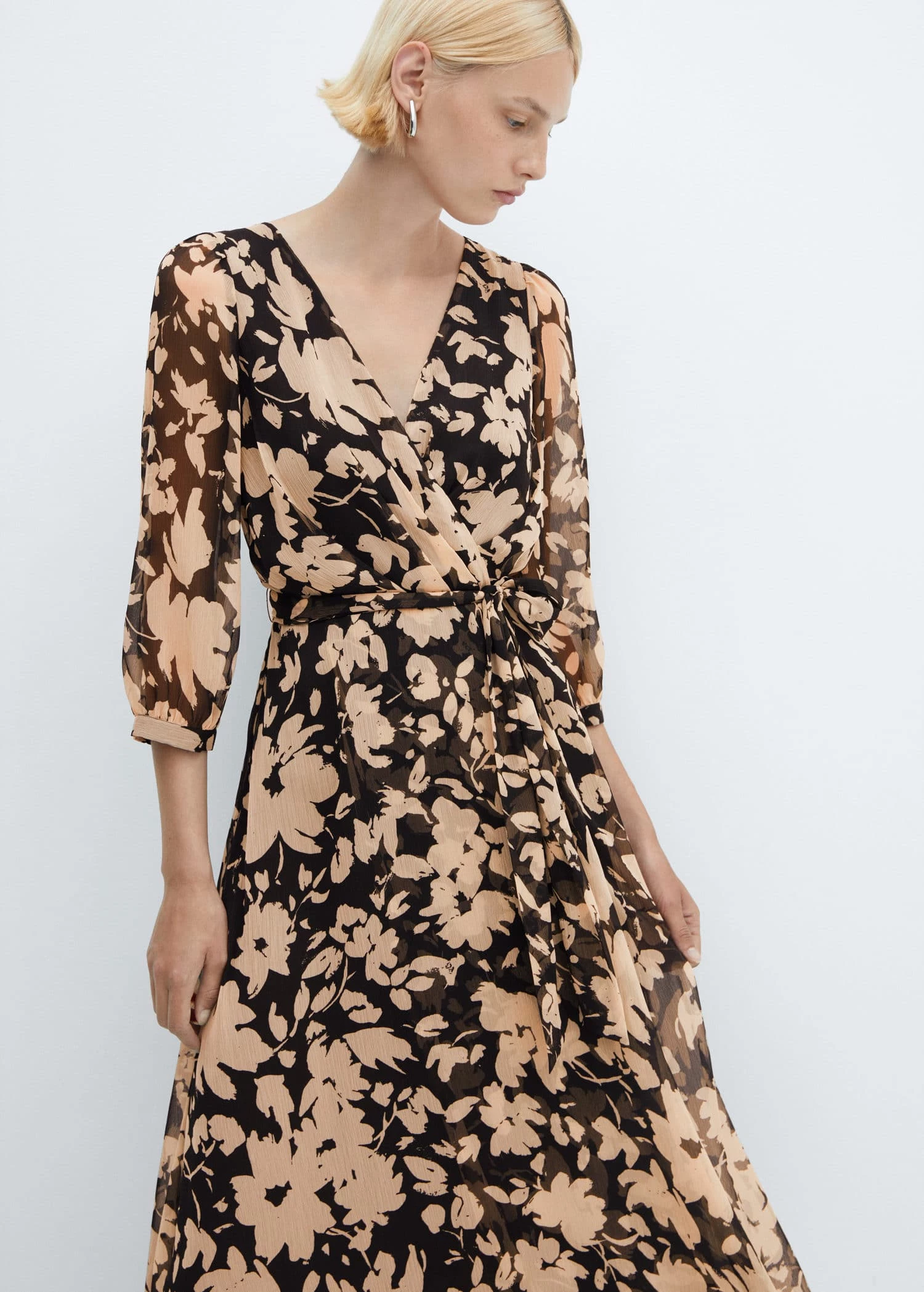 tissu fluide, coupe midi, evase, imprime fleurs, col en v, manches trois quarts, fermeture eclair a l’arriere, ruban a la taille avec fermeture a nœud, doublure, disponible plusComposition: 100% polyester. Doublure: 100% polyester