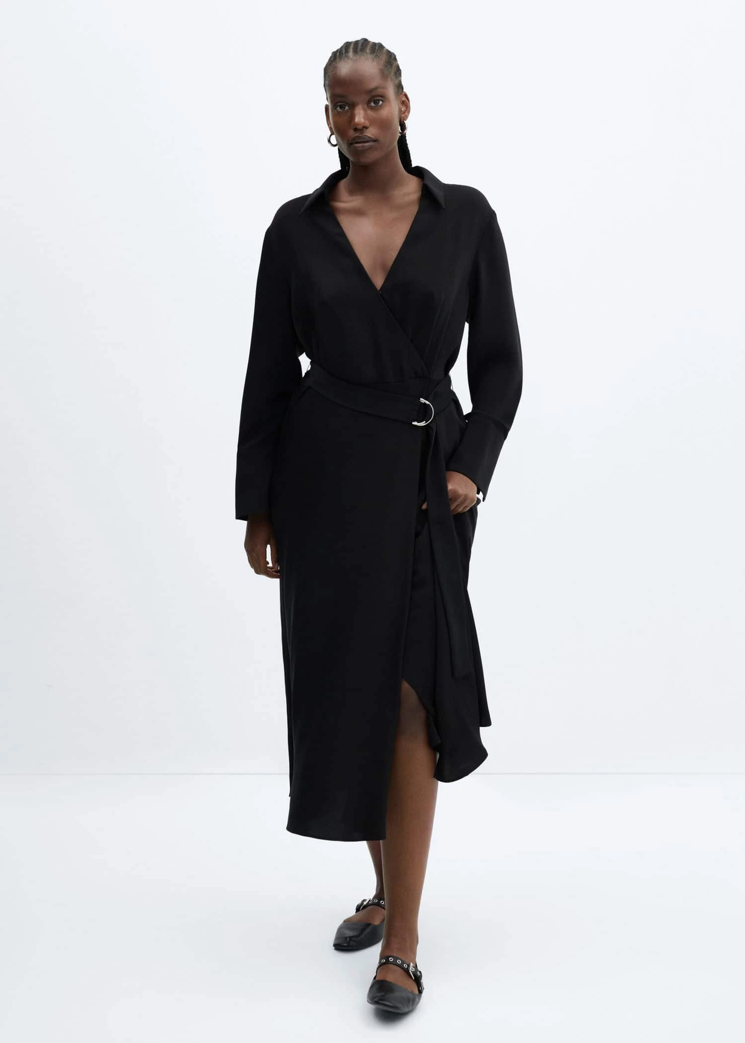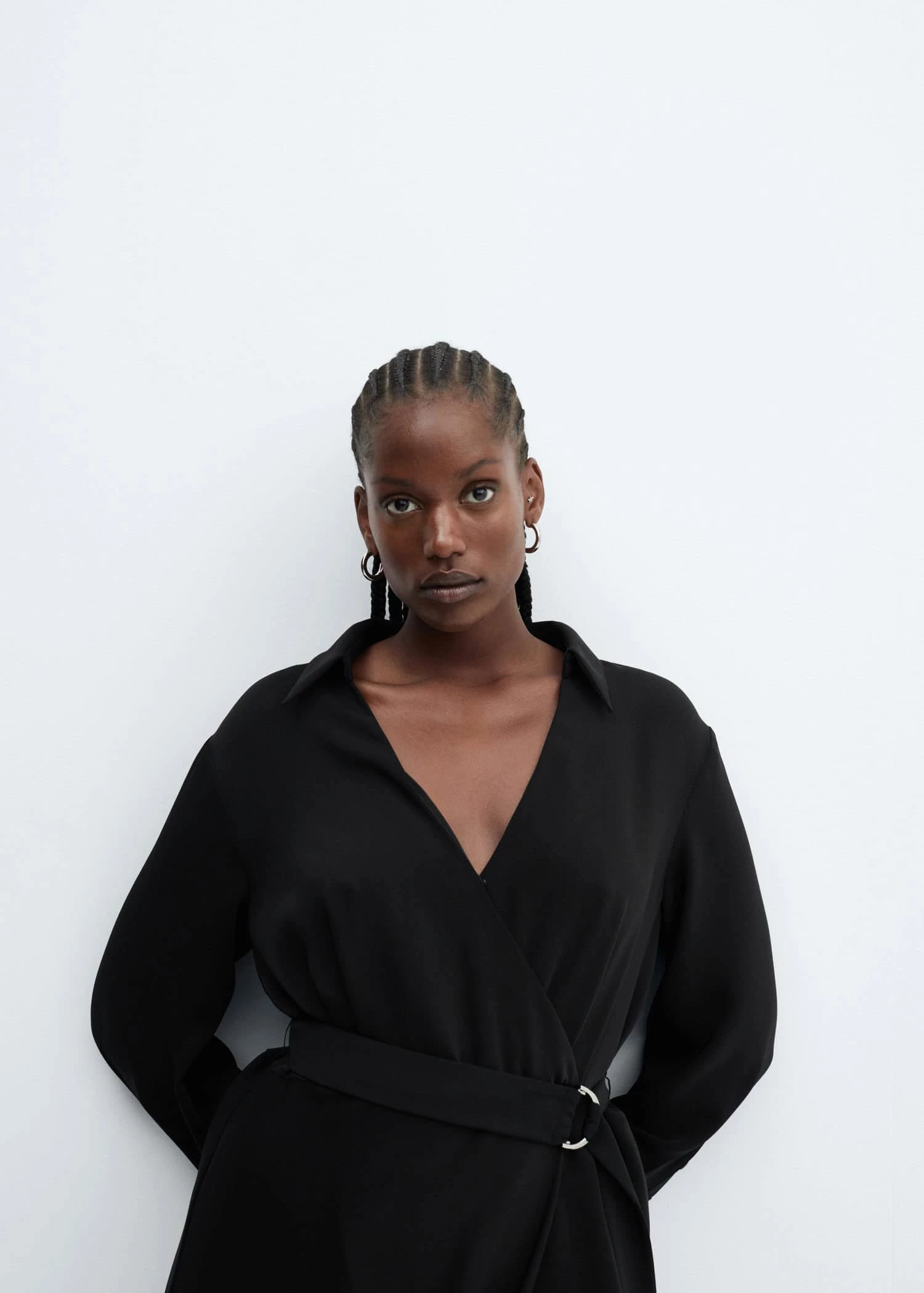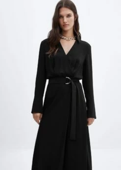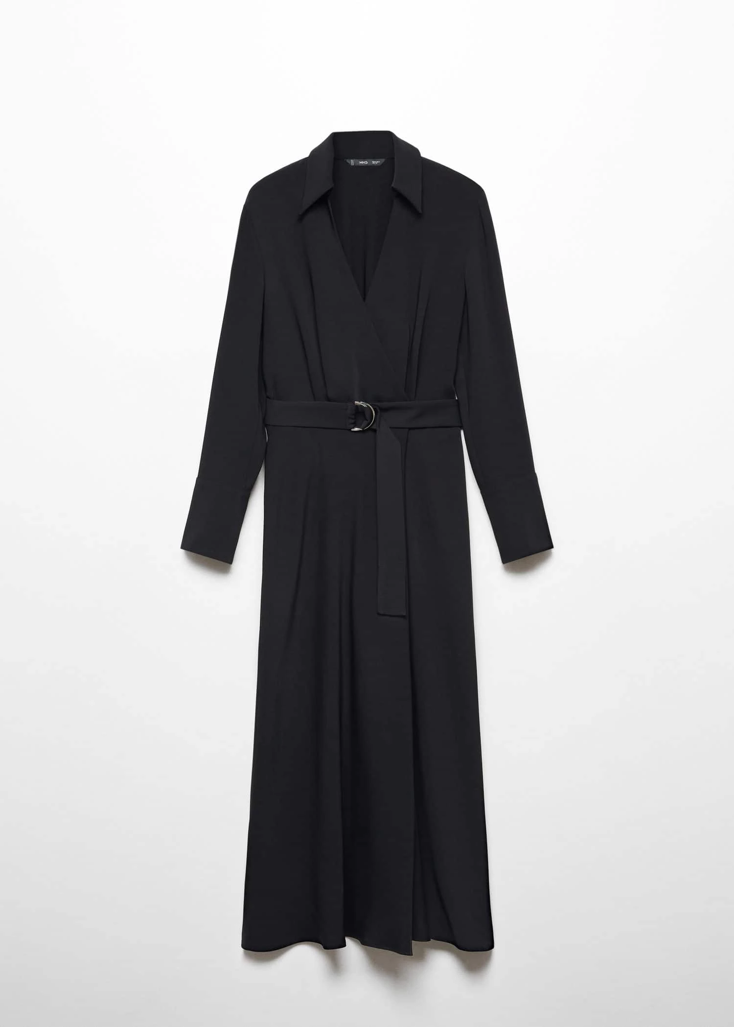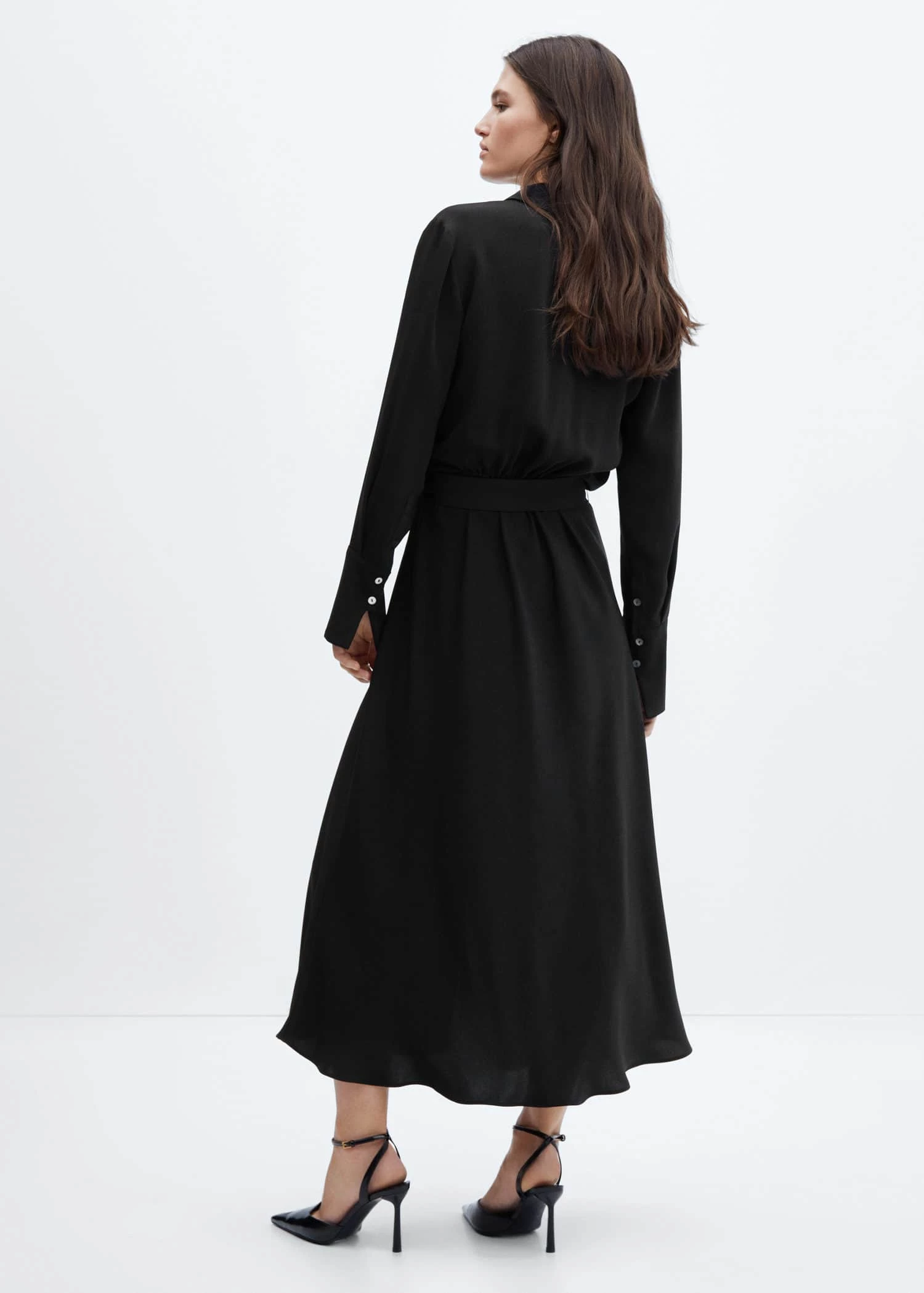 tissu fluide, coupe longue, evase, col chemise, manches longues, ceinture avec fermeture a boucle, sans doublure interieure, disponible plusComposition: 100% polyester