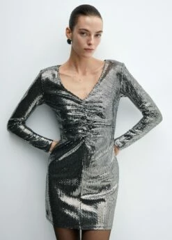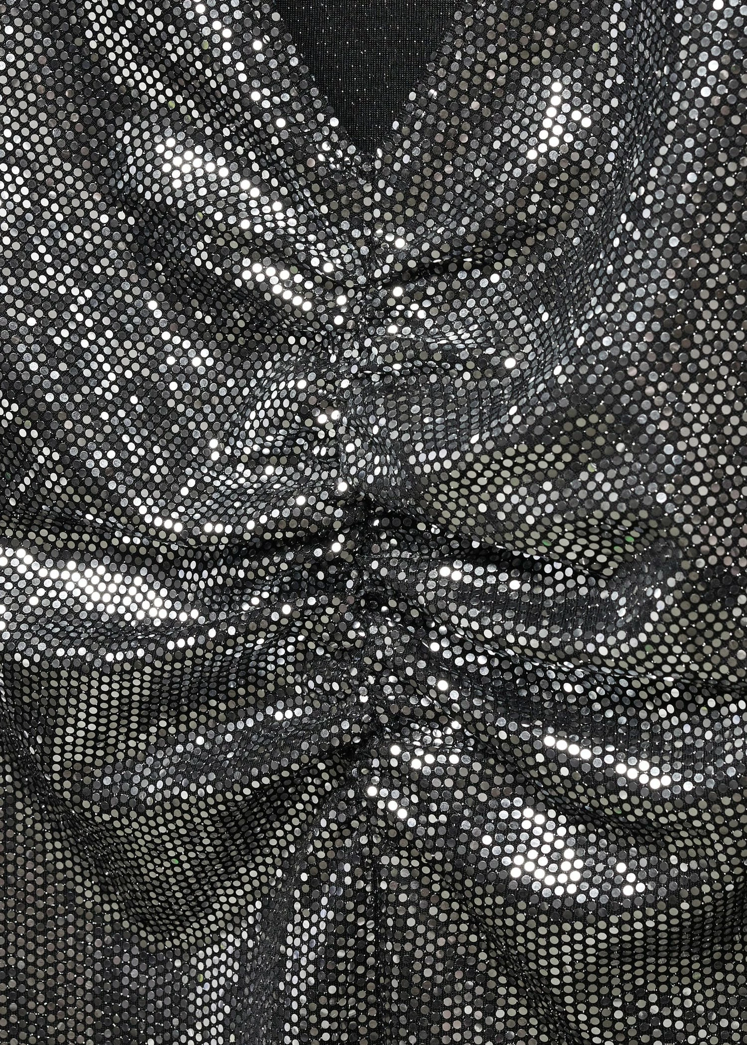 tissu fluide, coupe courte, ajuste, col en v, manches longues, sans fermeture, ornement en sequins, detail fronce, collection fetes et ceremonies.Composition: 96% polyester,4% elasthanne. Lisiere: 100% polyester. Sequin: 100% poly(téréphtalate d’éthylène)