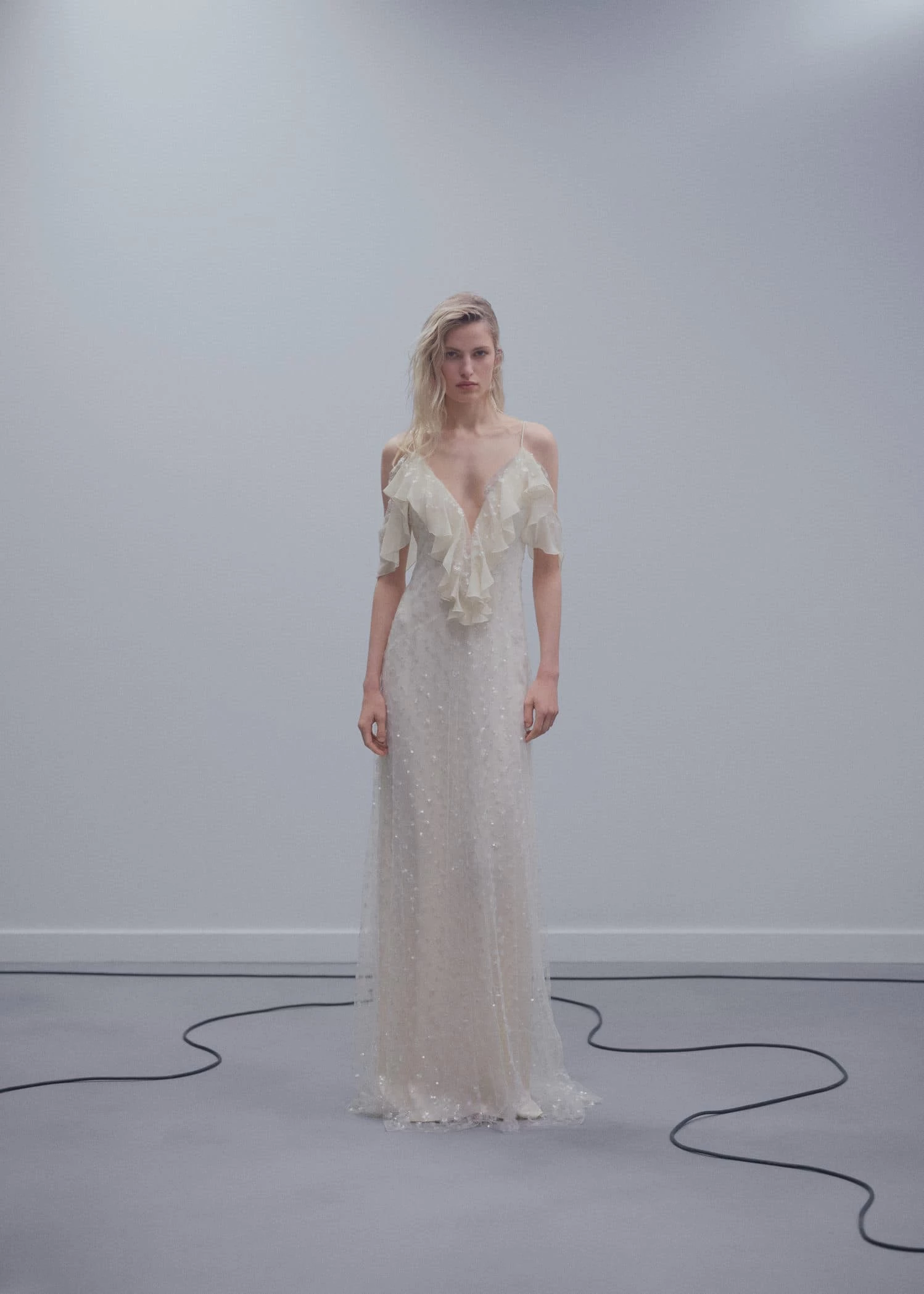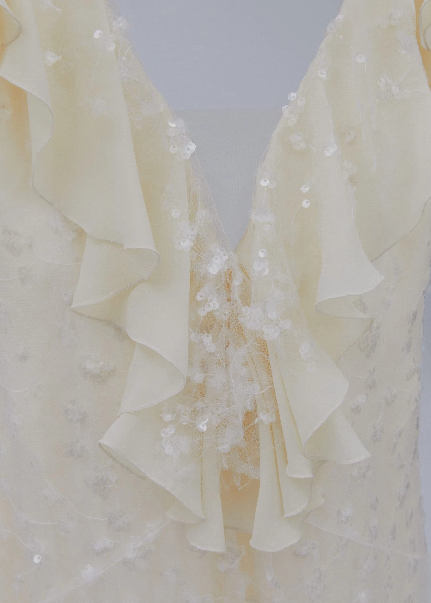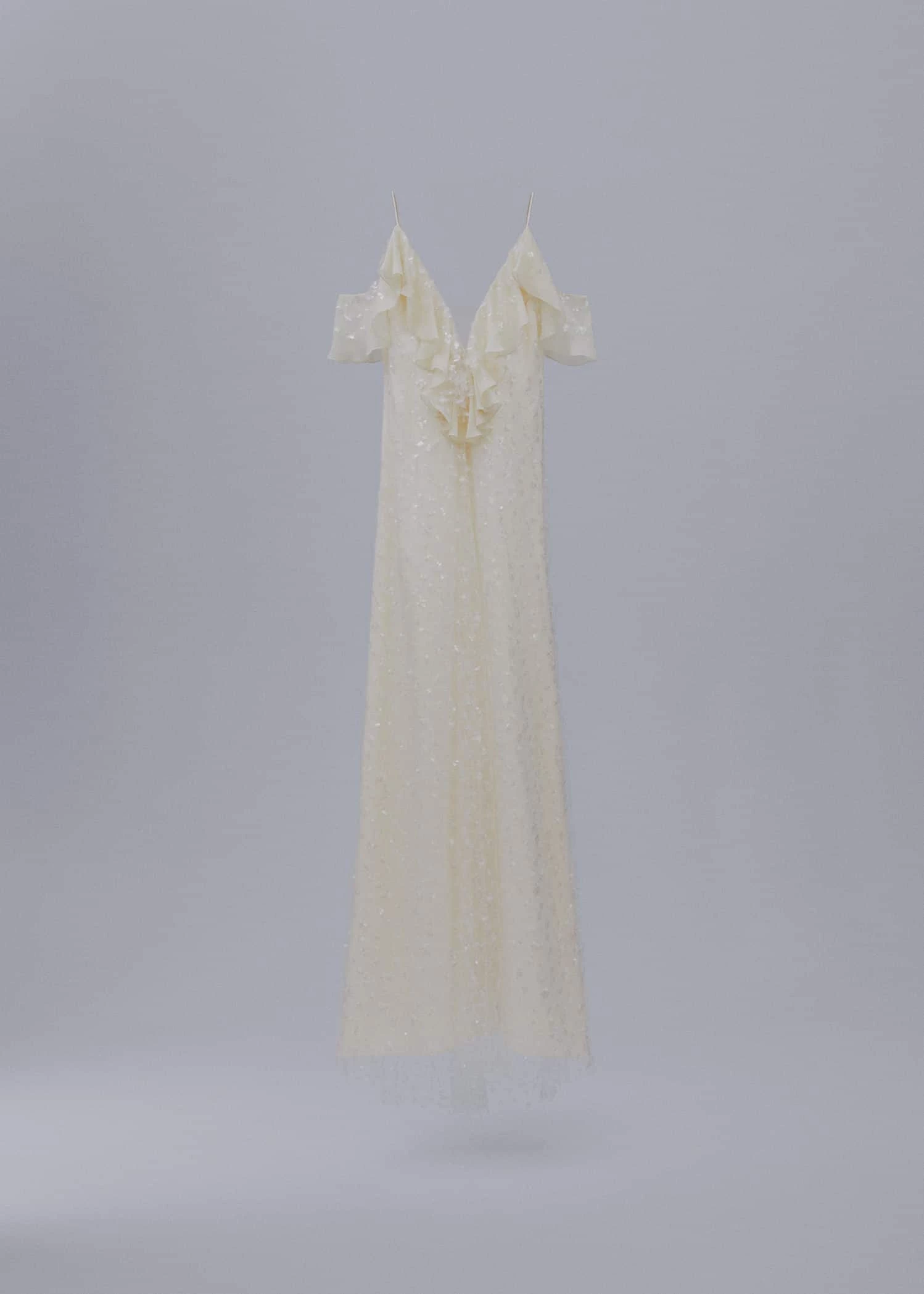 la piece blanche de style lingerie se reinvente : avec une couche de tissu en gaze par-dessus, l’encolure a volants et les details a sequins, elle devient une piece speciale et unique, tissu en polyamide recycle, evase, coupe longue, col en v, detail volante, bretelles fines, fermeture eclair a l’arriere, detail en sequins, fabrique au maroc, collection fetes et ceremonies, capsule : une collection de vetements en edition limitee, fabriques avec les meilleurs tissus et le plus grand soin en matiere de patrons, afin d’obtenir les meilleures finitions. cette collection exclusive est concue pour les evenements et les occasions les plus chics.Composition: 100% polyamide recyclé. Doublure: 100% viscose. Volants: 100% soie. Sequin: 100% poly(téréphtalate d’éthylène)