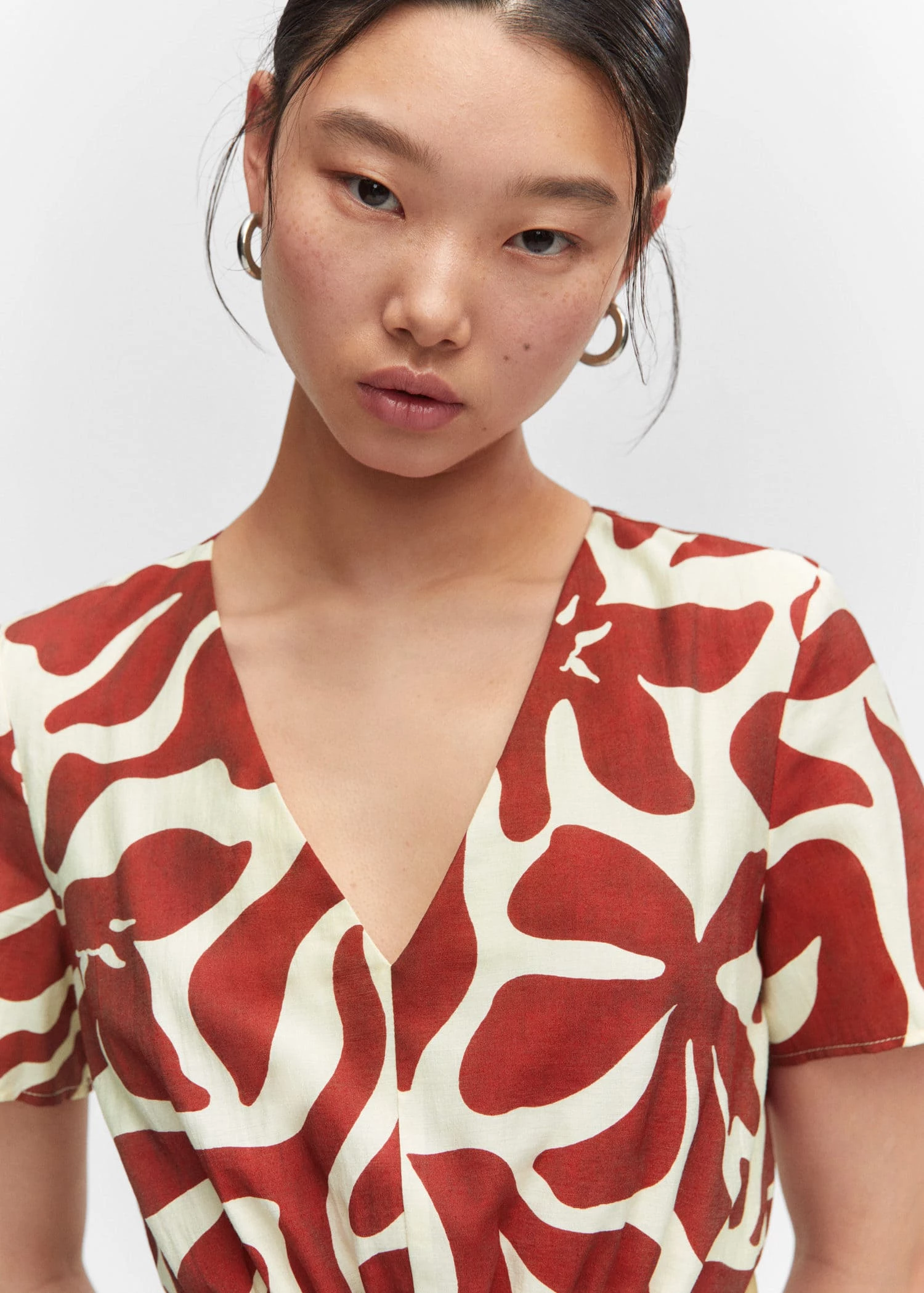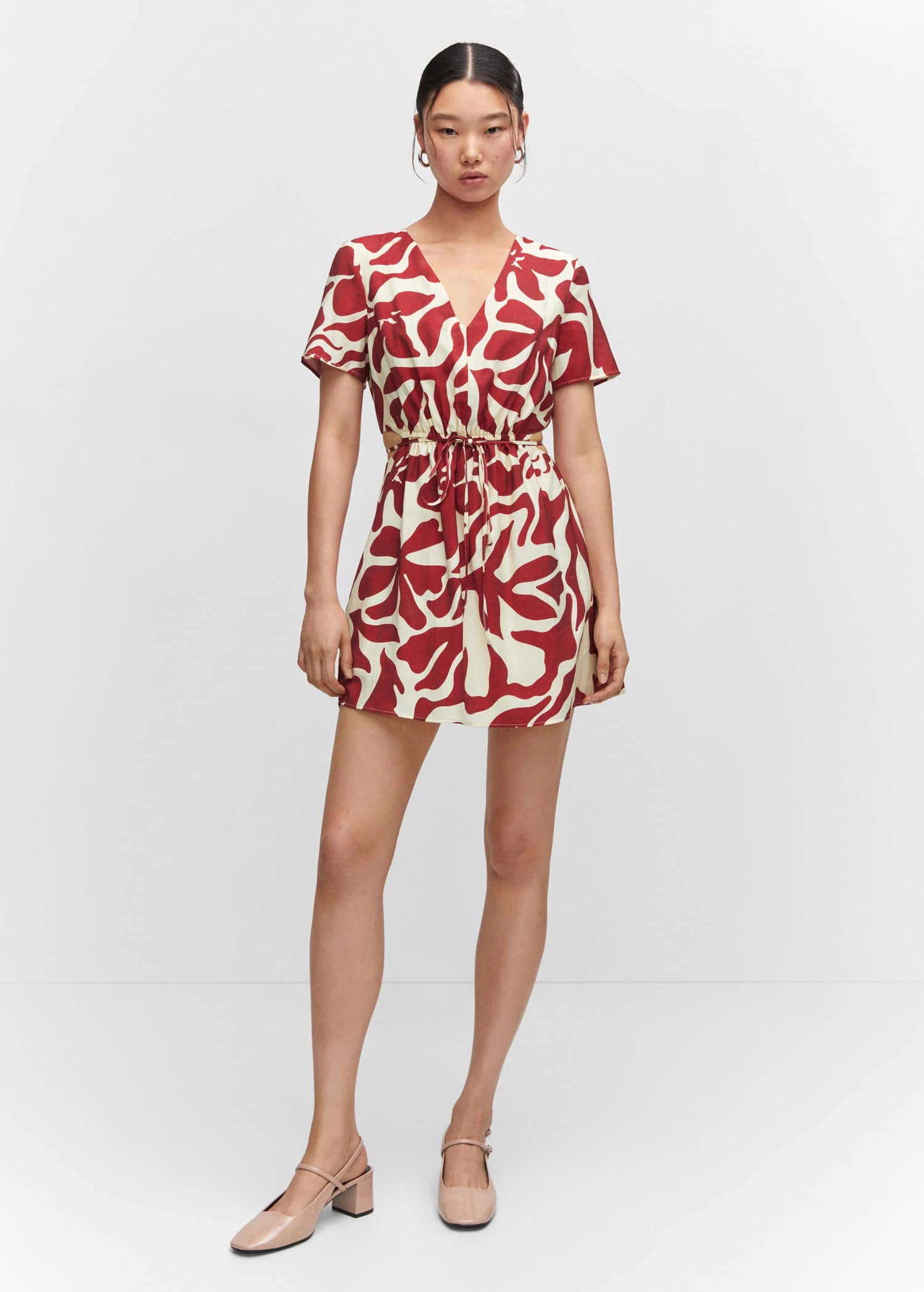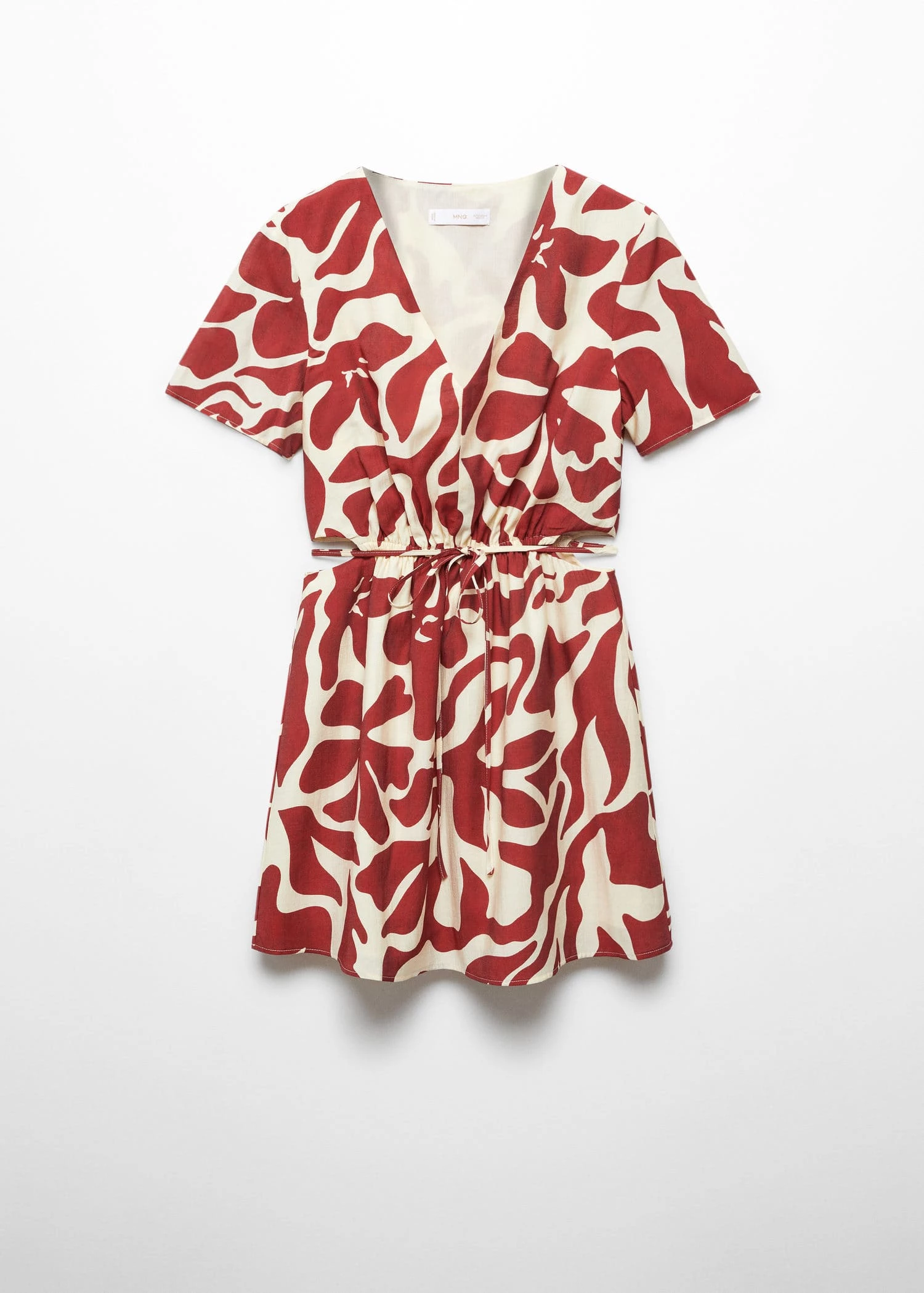 tissu fluide, droit, coupe courte, imprime fleurs, col en v, manches courtes, taille elastique avec fermeture a nœud, fentes laterales, doublureComposition: 86% viscose,11% polyester,3% polyamide. Doublure: 80% polyester,20% coton