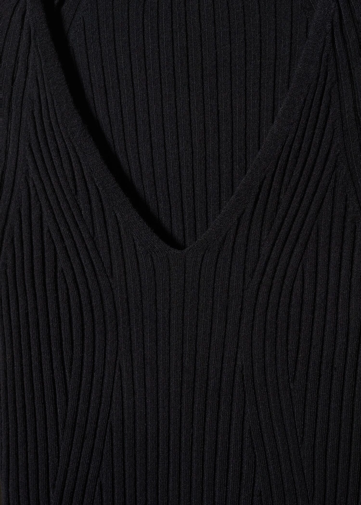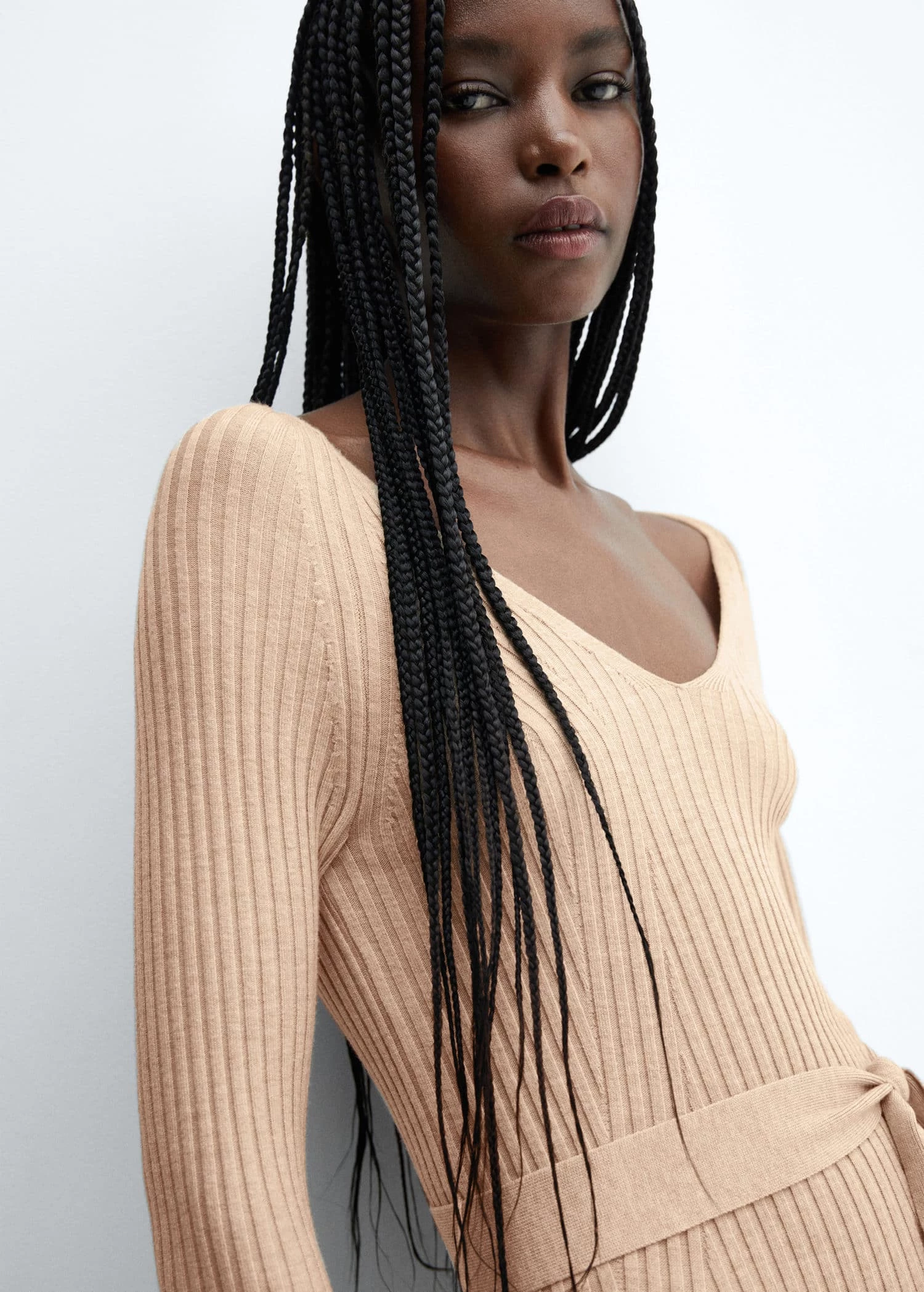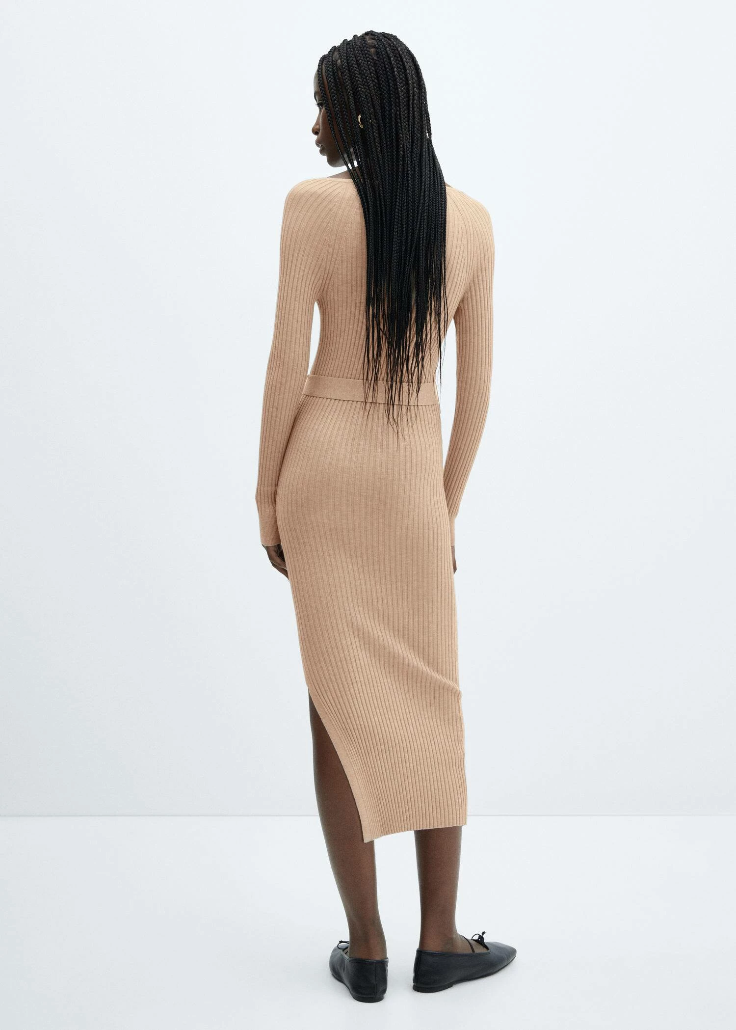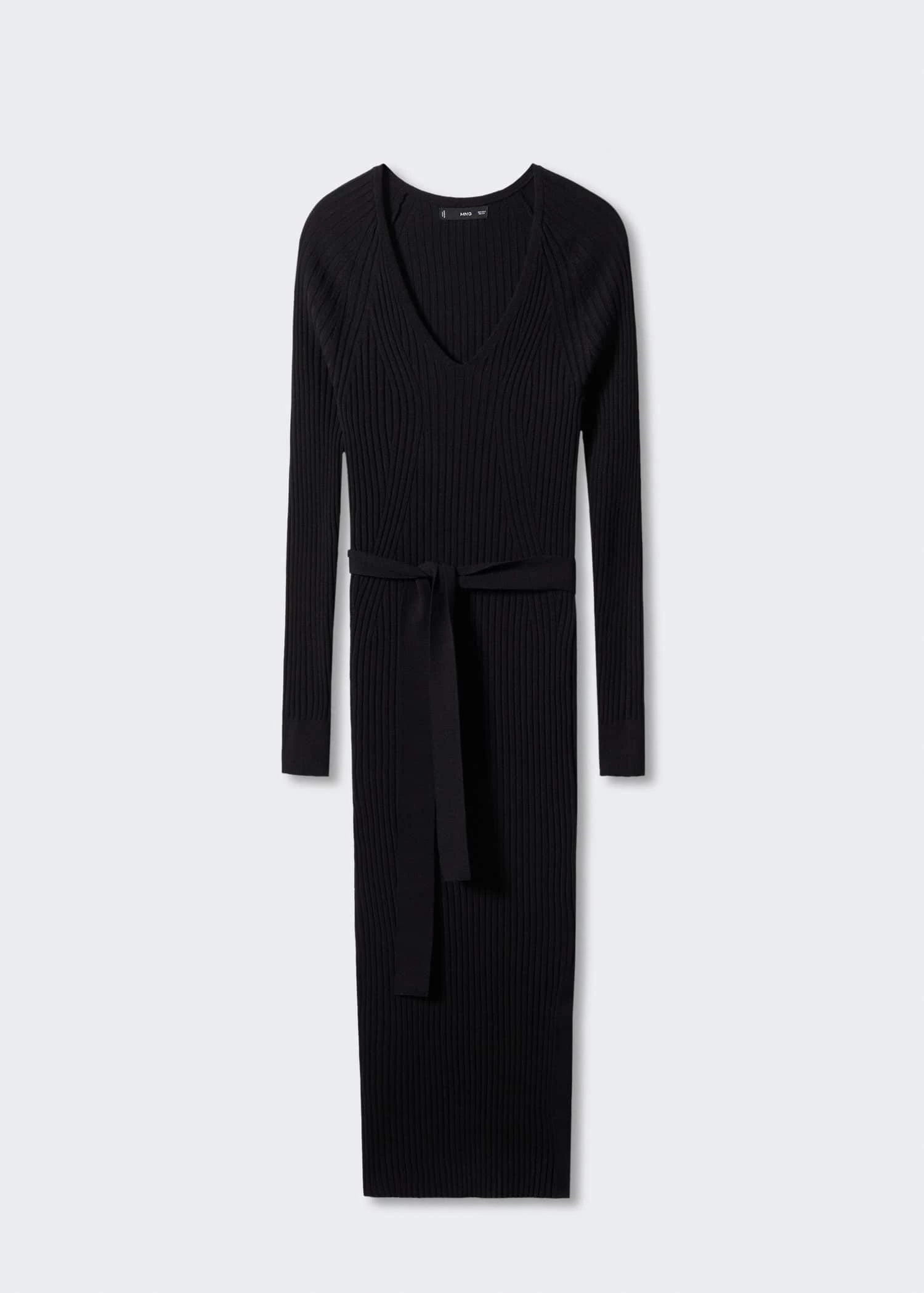 tissu en maille, ajuste, coupe midi, col en v, manches longues, sans fermeture, nœud amovible a la taille, fente lateraleComposition: 49% viscose,29% polyester,22% polyamide