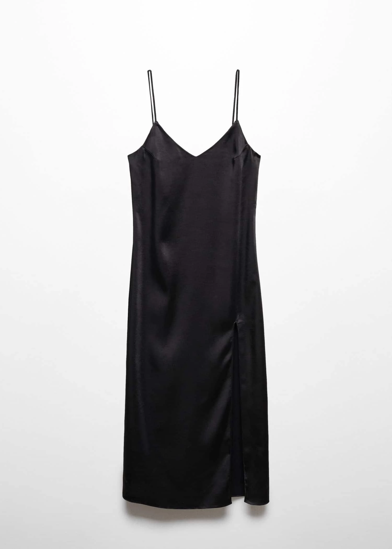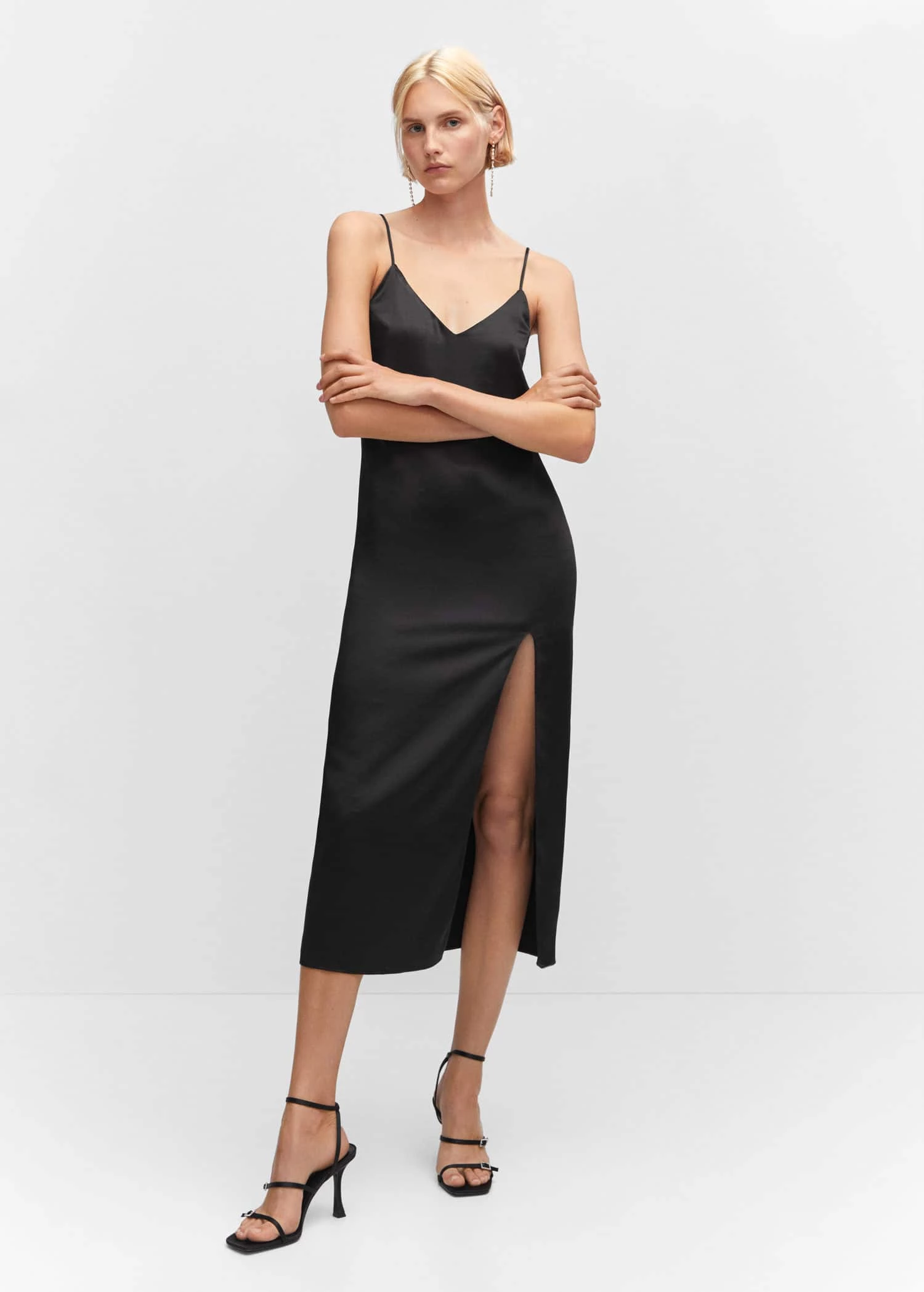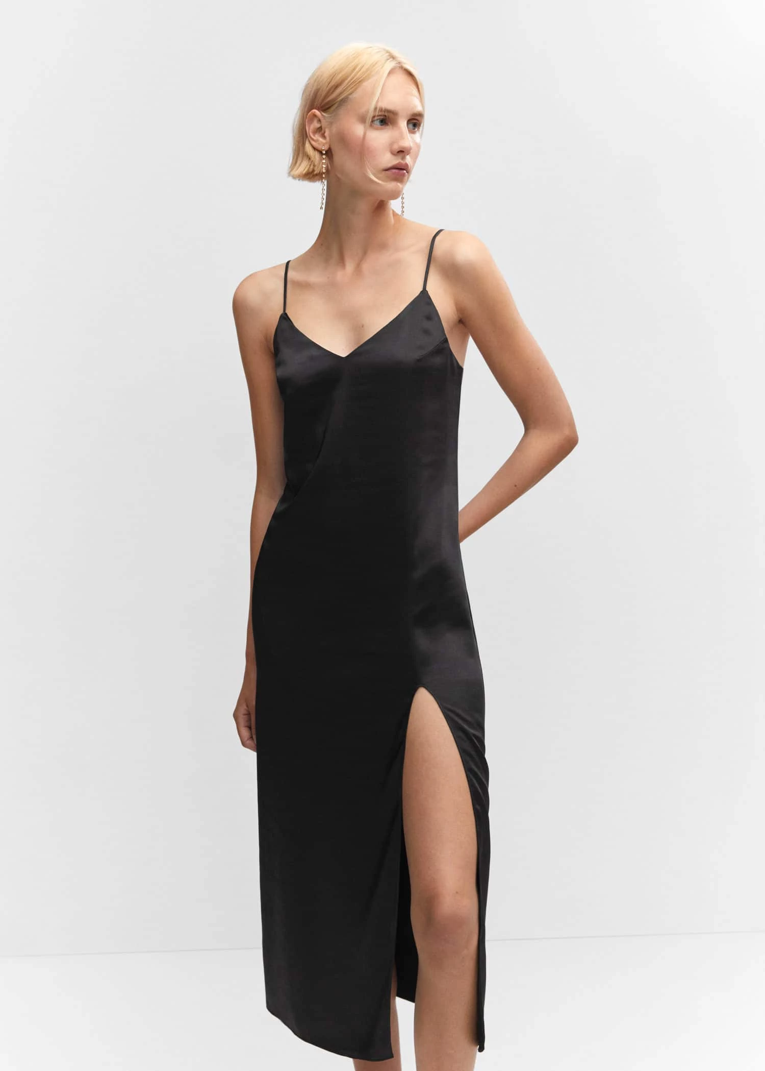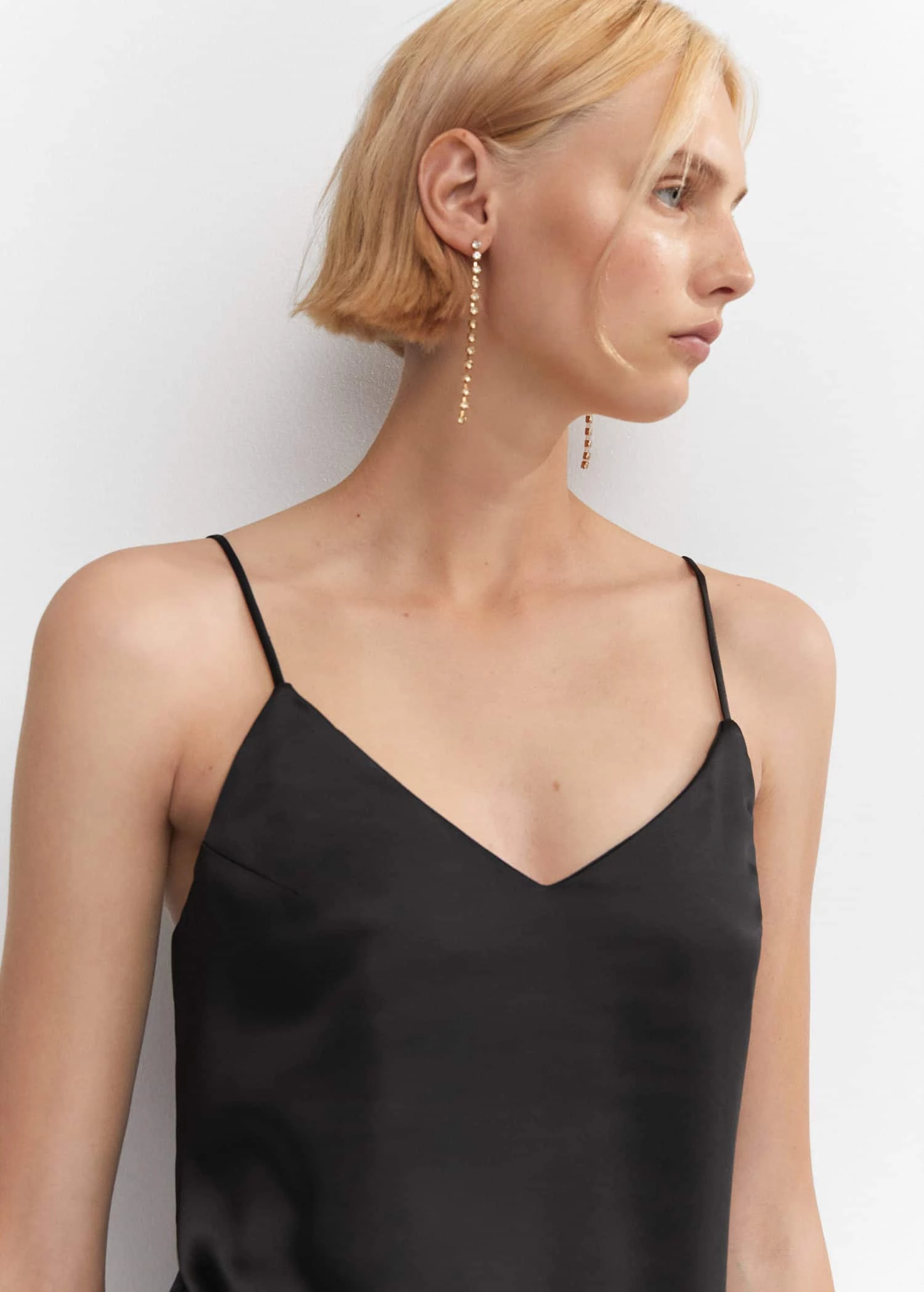 tissu satine, tissu fluide, col echancre, bretelles fines ajustables, encolure au dos, fente laterale, sans fermetureComposition: 100% polyester