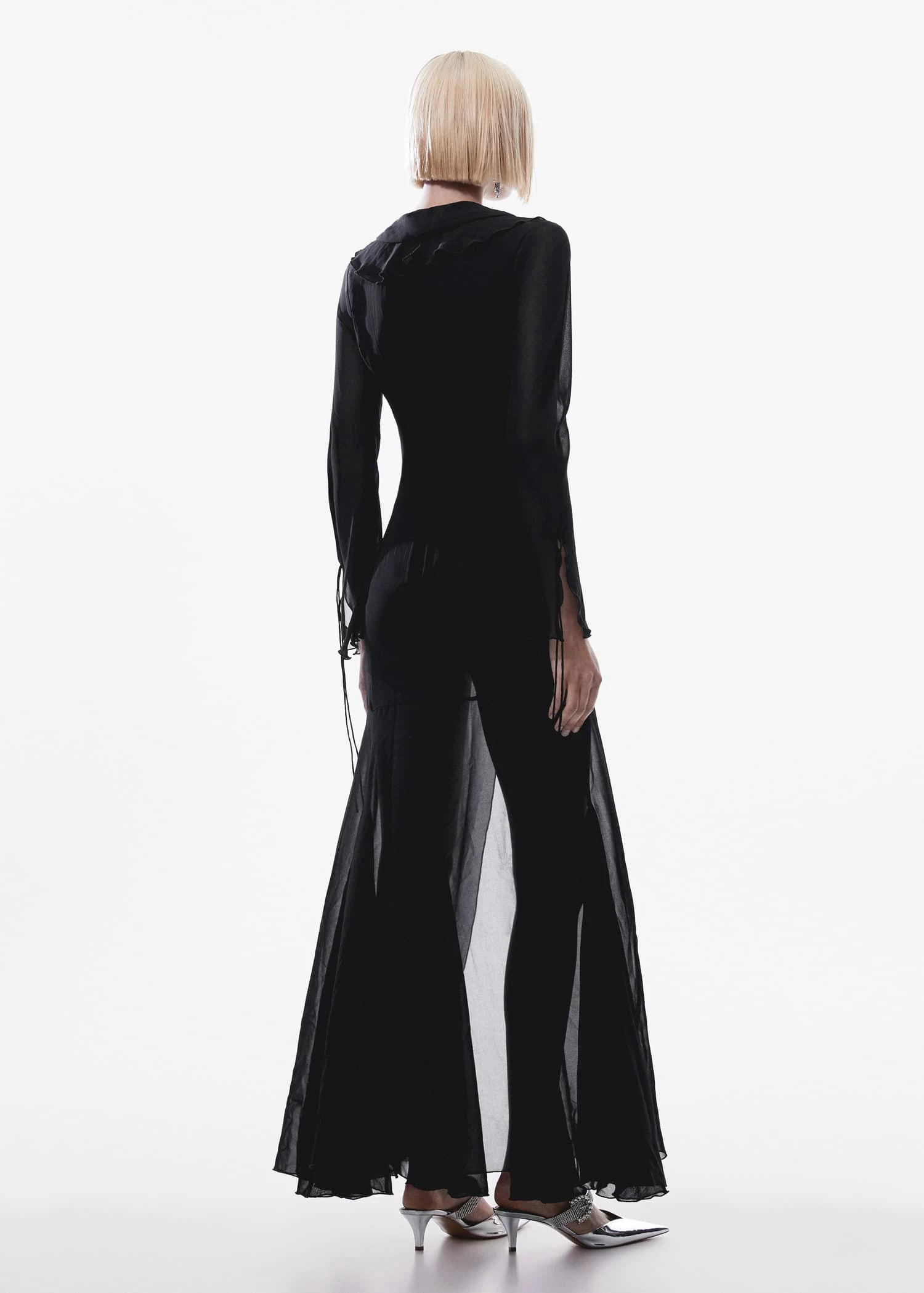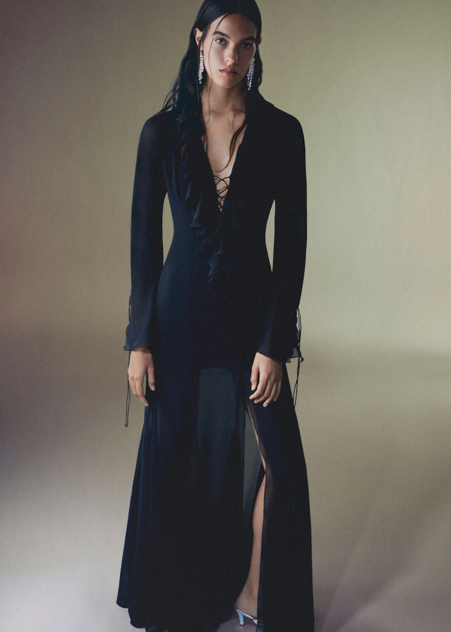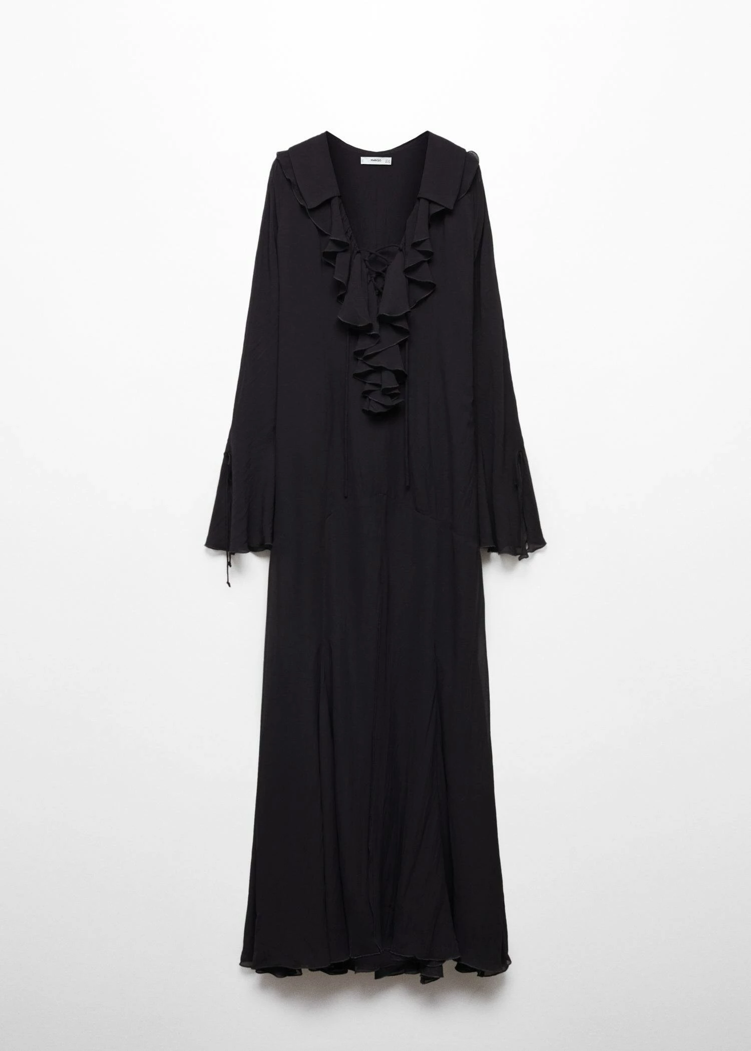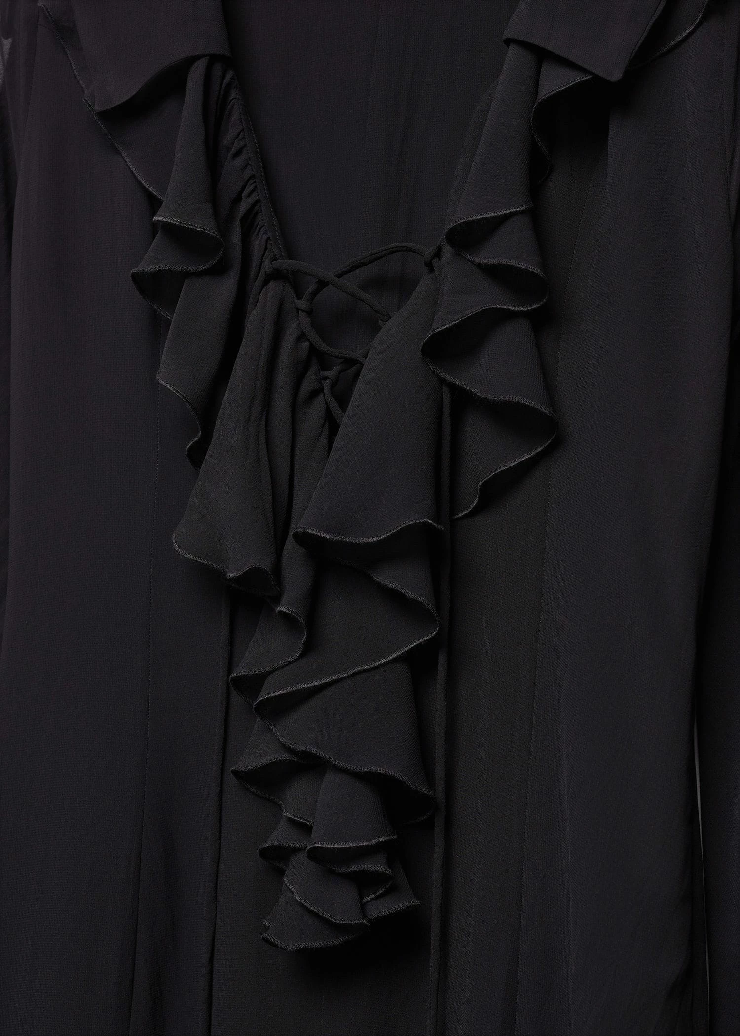 tissu fluide, tissu semi-transparent, evase, coupe longue, col en v avec fermeture a cordon, manches longues cloche, fermeture a nœud aux manches, ouverture sur le devant, detail de volants sur le col, sans fermeture, collection fetes et ceremoniesComposition: 55% polyester,45% viscose. Doublure: 100% polyester