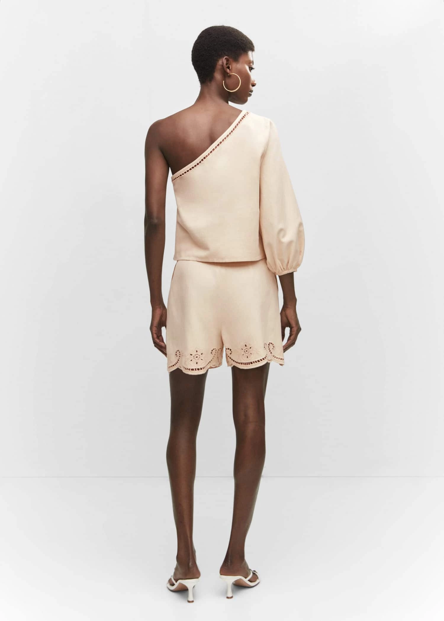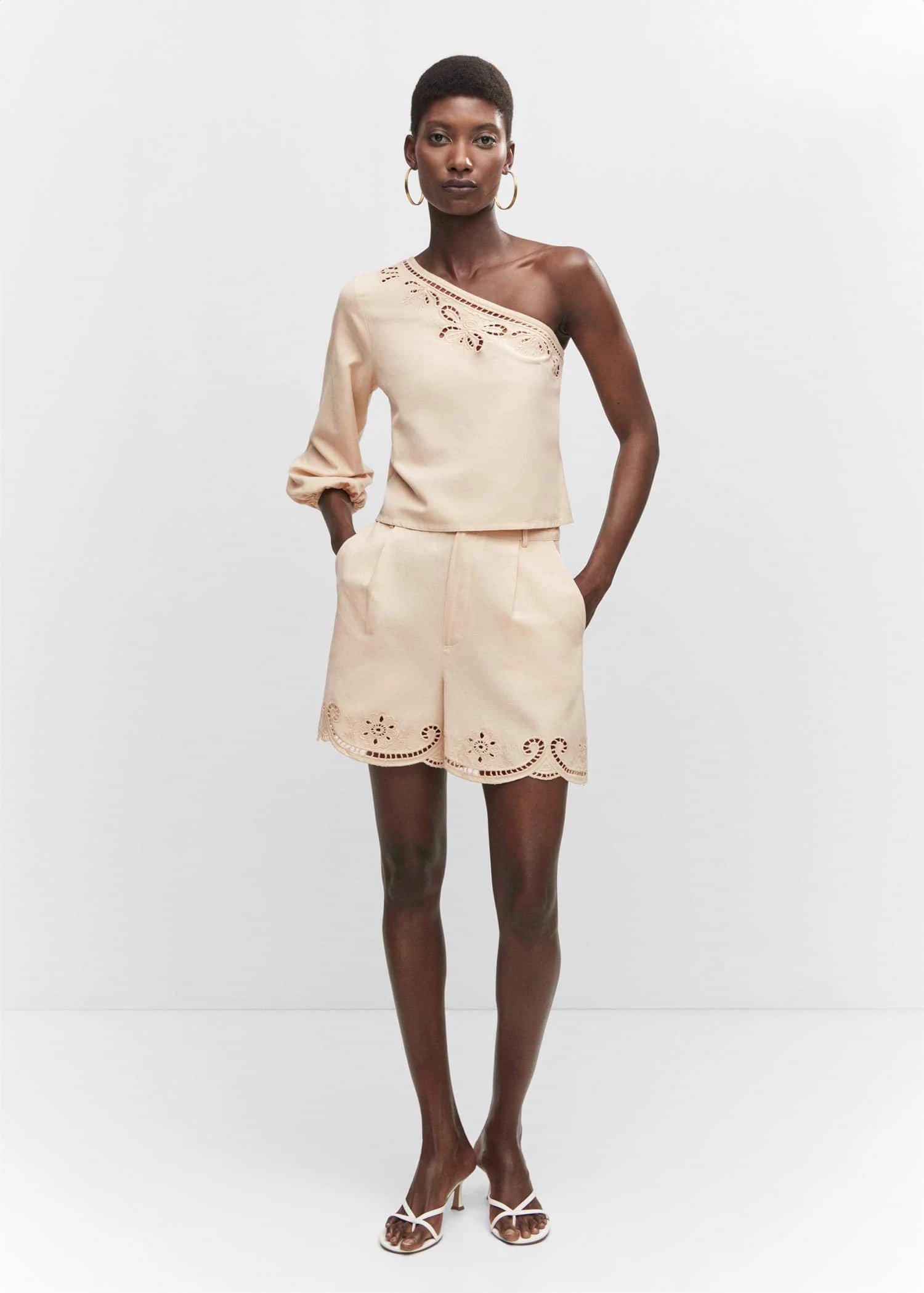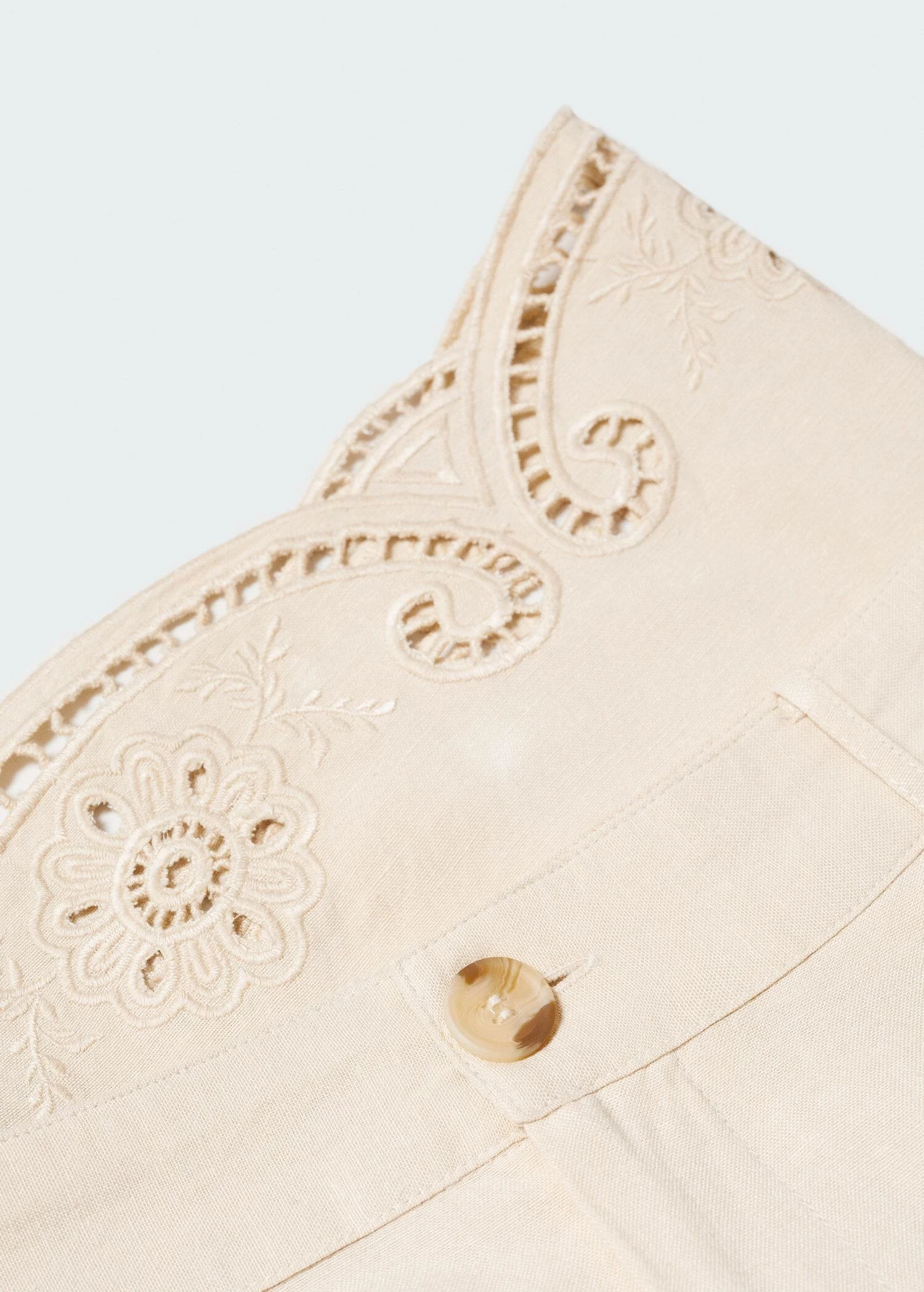 tissu de coton et lin melange, droit, coupe courte, taille haute, passants pour la ceinture, fermeture eclair avec bouton, details brodes, details ajoures, total lookComposition: 46% viscose,41% coton,13% lin