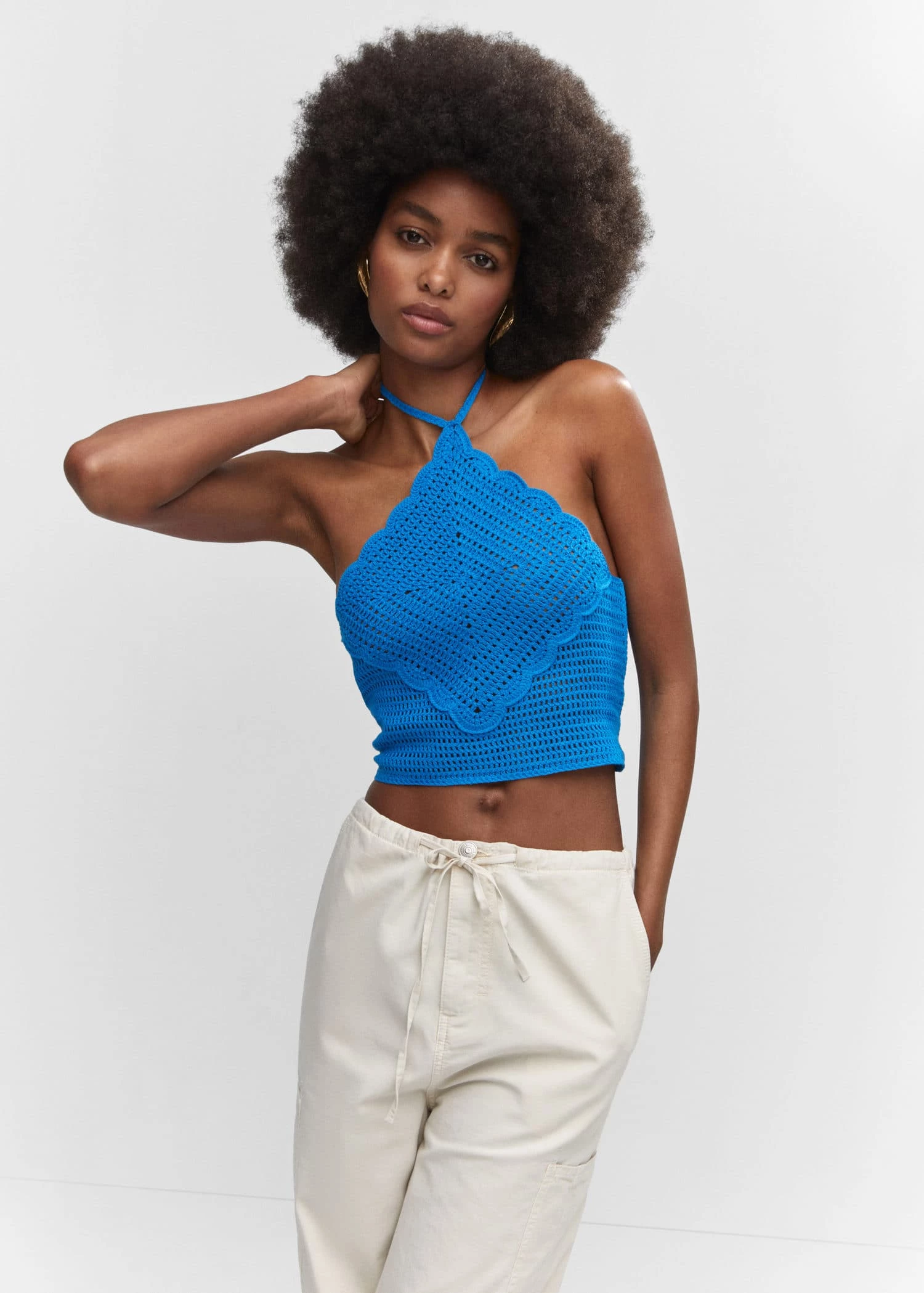 tissu de coton melange, tissu en grosse maille, tissu en crochet, emmanchures americaines, style crop, lien a nouer autour du cou, bretelles fines, saison des festivalsComposition: 60% coton,40% acrylique