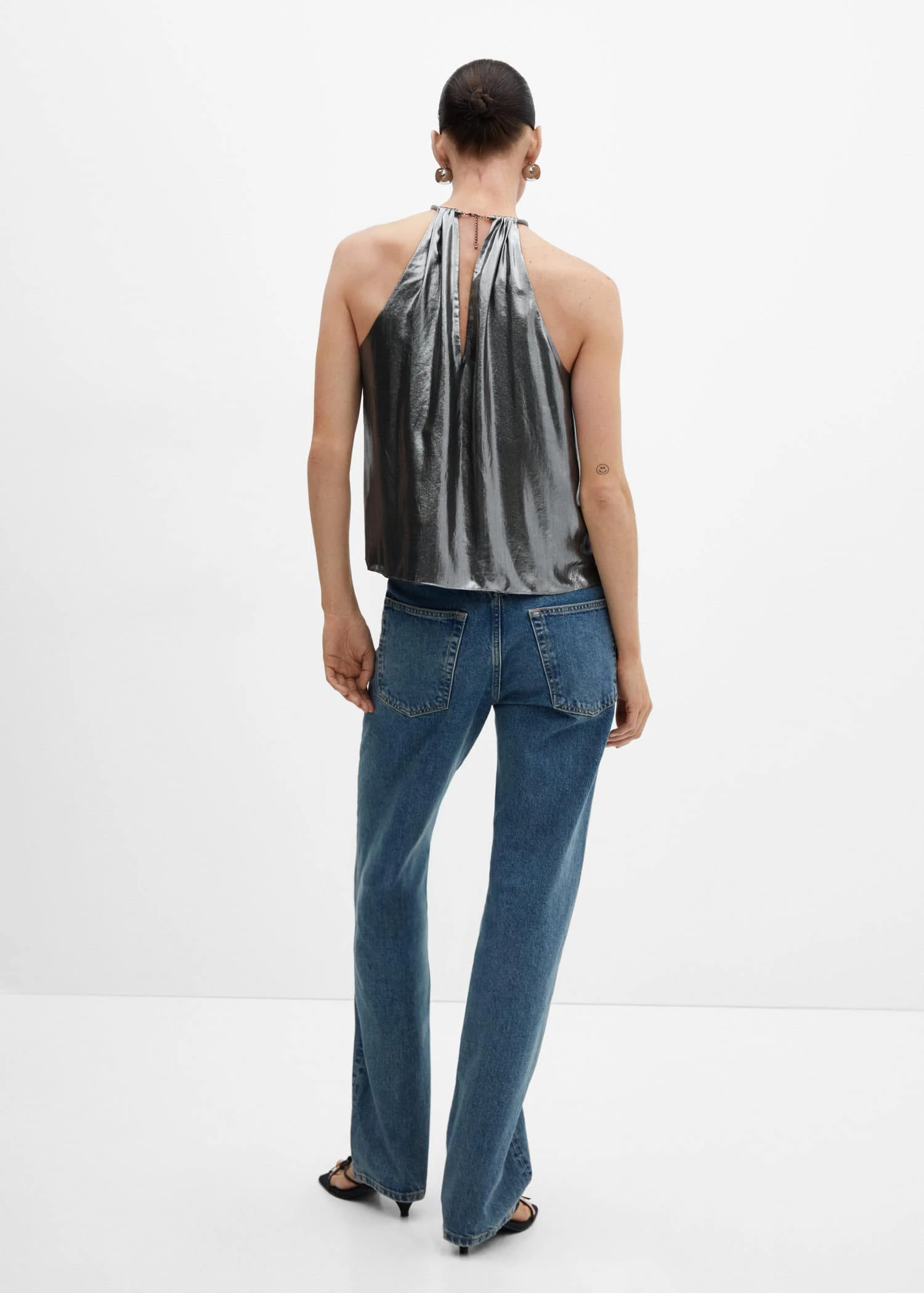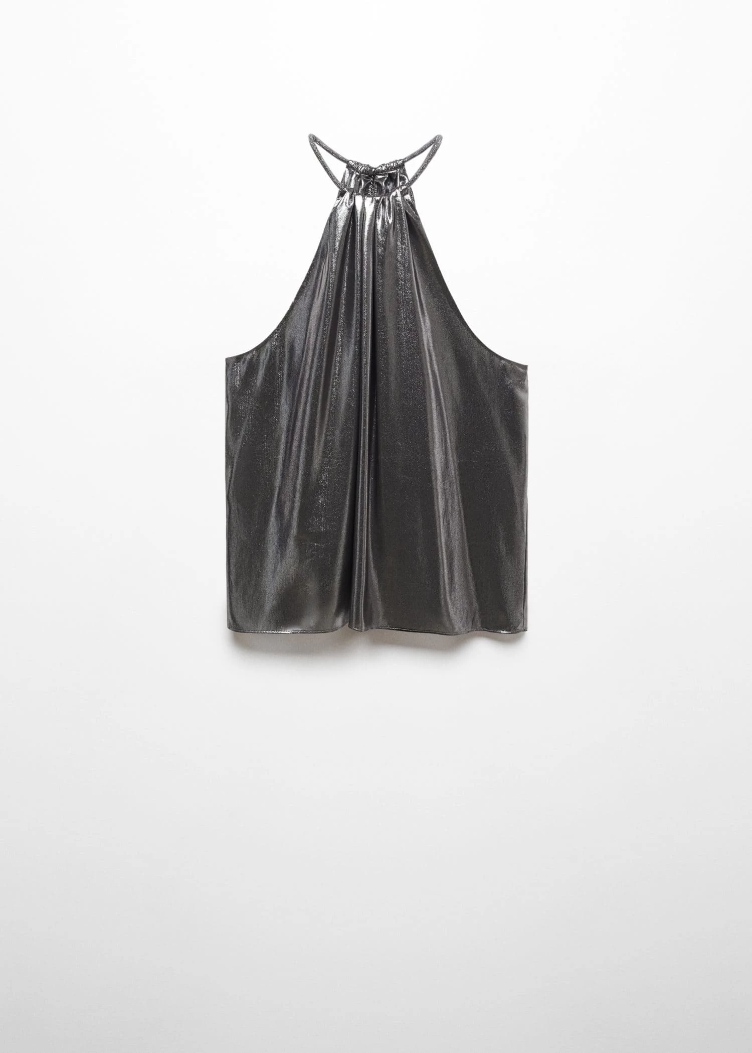 tissu fluide, effet metallise, droit, emmanchures americaines, detail col rigide metallique, sans manches, fermoir a chainette et mousqueton, collection fetes et ceremonies.Composition: 100% polyester