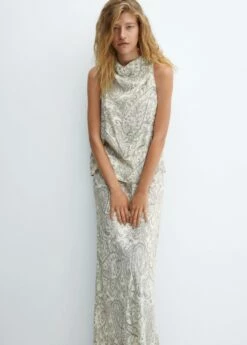 tissu fluide, coupe droite, effet satine, imprime paisley, emmanchures americaines, col drape, sans manches, fermeture crochet a l’arriere, total lookComposition: 100% viscose