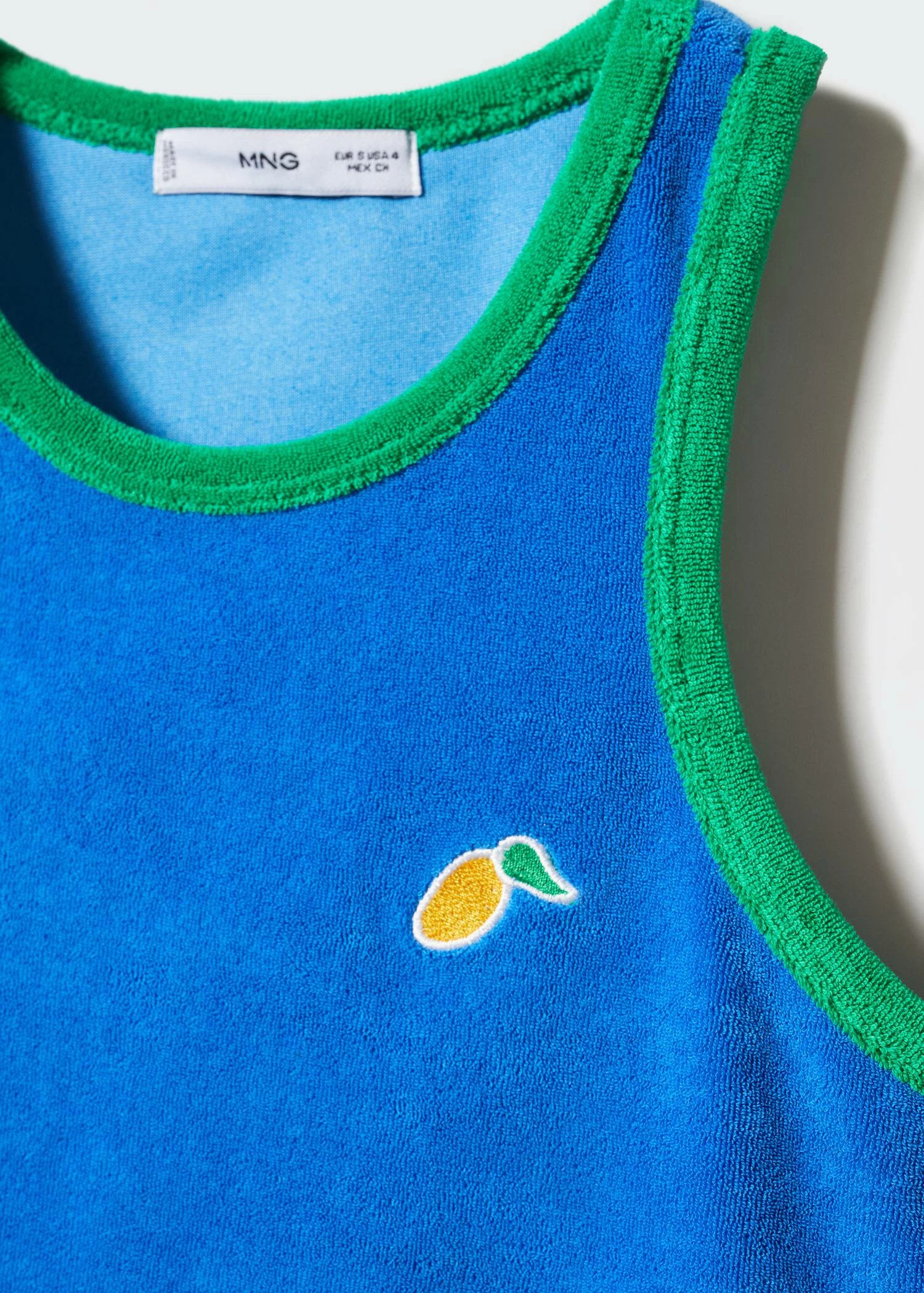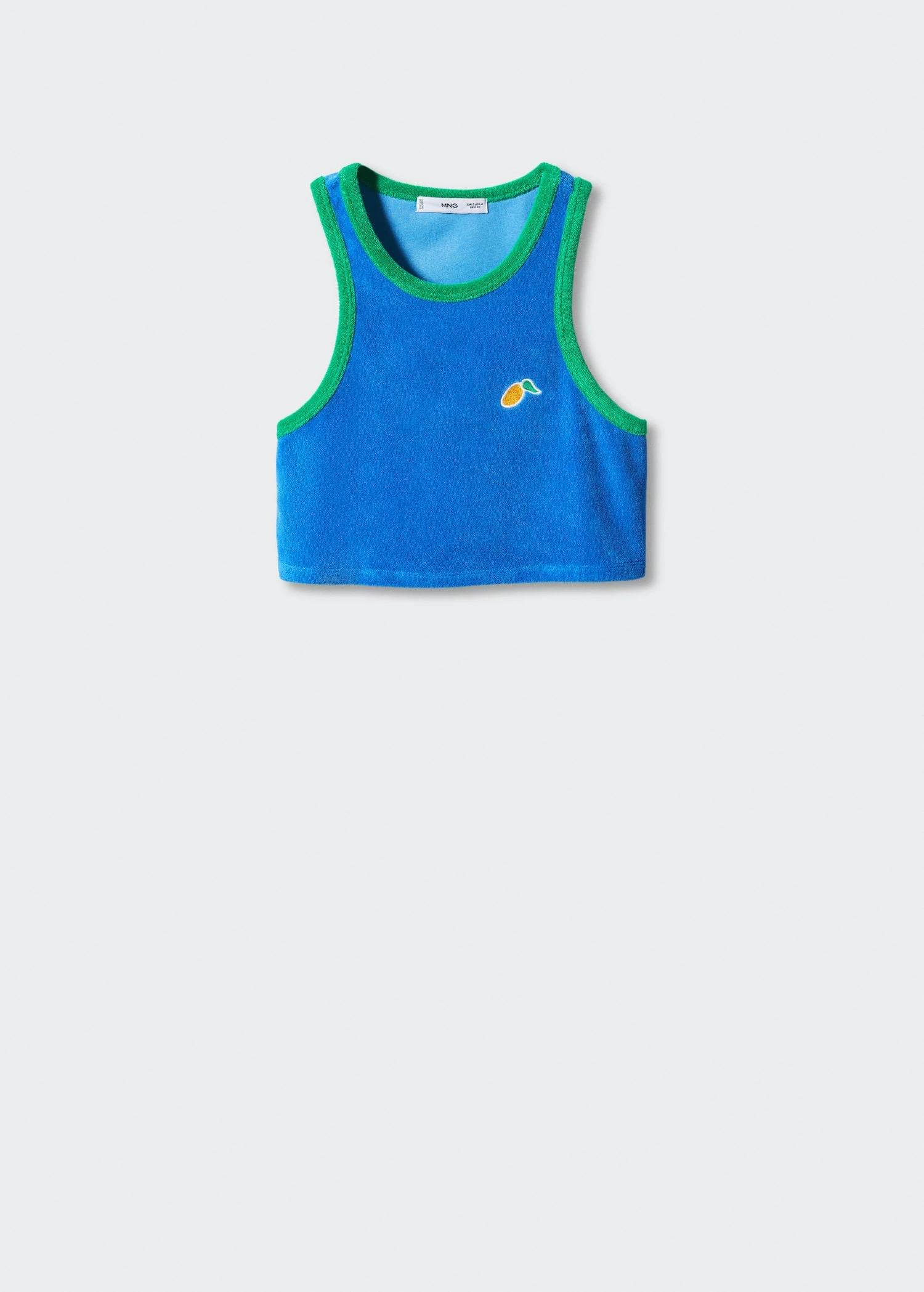 tissu de coton melange, tissu serviette, coupe cintree, style crop, bicolore, col rond, bretelles larges, total look, saison des festivals, simonmiller mango : nous nous sommes associes a la marque de los angeles pour vous proposer une collection d’ete rafraichissante qui mele le meilleur des styles californien et mediterraneen. avec des tissus de qualite et des imprimes vibrants, les vetements de cette collaboration speciale debarquent dans votre dressing pour devenir vos favoris de l’ete.Composition: 73% coton,27% polyester